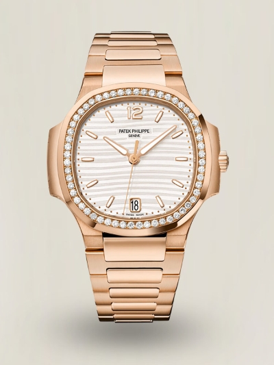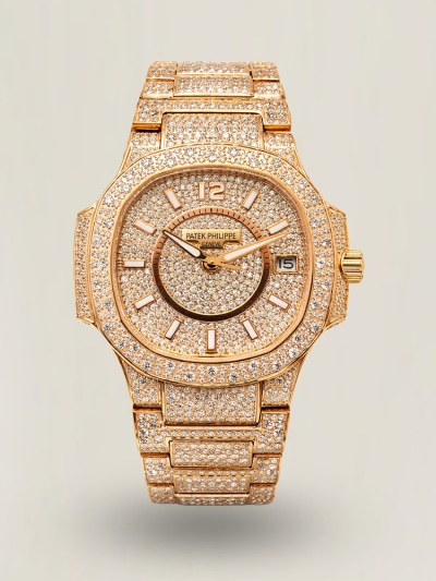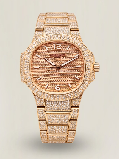 Patek Philippe Nautilus 7021/1R Damen-Diamant-Uhren-Replikat mit Schweizer Uhrwerk, Roségold, voll besetzt mit Diamanten