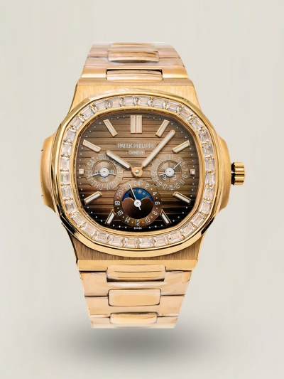 Patek Philippe Nautilus 5740/1G Replica Ewiger Kalender Braunes Zifferblatt Baguette-Diamant-Lünette Schweizer Uhrwerk 40mm