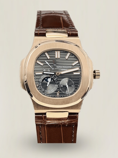 Luxus Replica Patek Philippe Nautilus 5712R-001 Graues Zifferblatt Roségoldgehäuse Uhr mit braunem Lederarmband