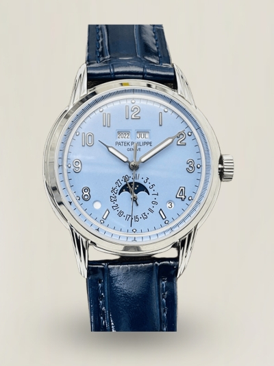 Schweizer Luxus Patek Philippe Grand Complications 5320G-001 Replica Ewiger Kalender Uhr mit blauem Zifferblatt und blauem Lederarmband