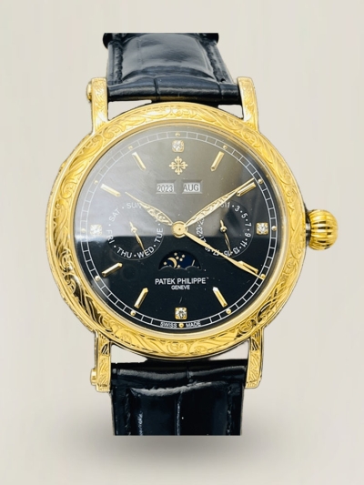 Schweizer Replica Patek Philippe Grand Complications Uhr – Schwarzes Zifferblatt, vergoldetes Gehäuse, Kalenderfunktionen & Mondphase