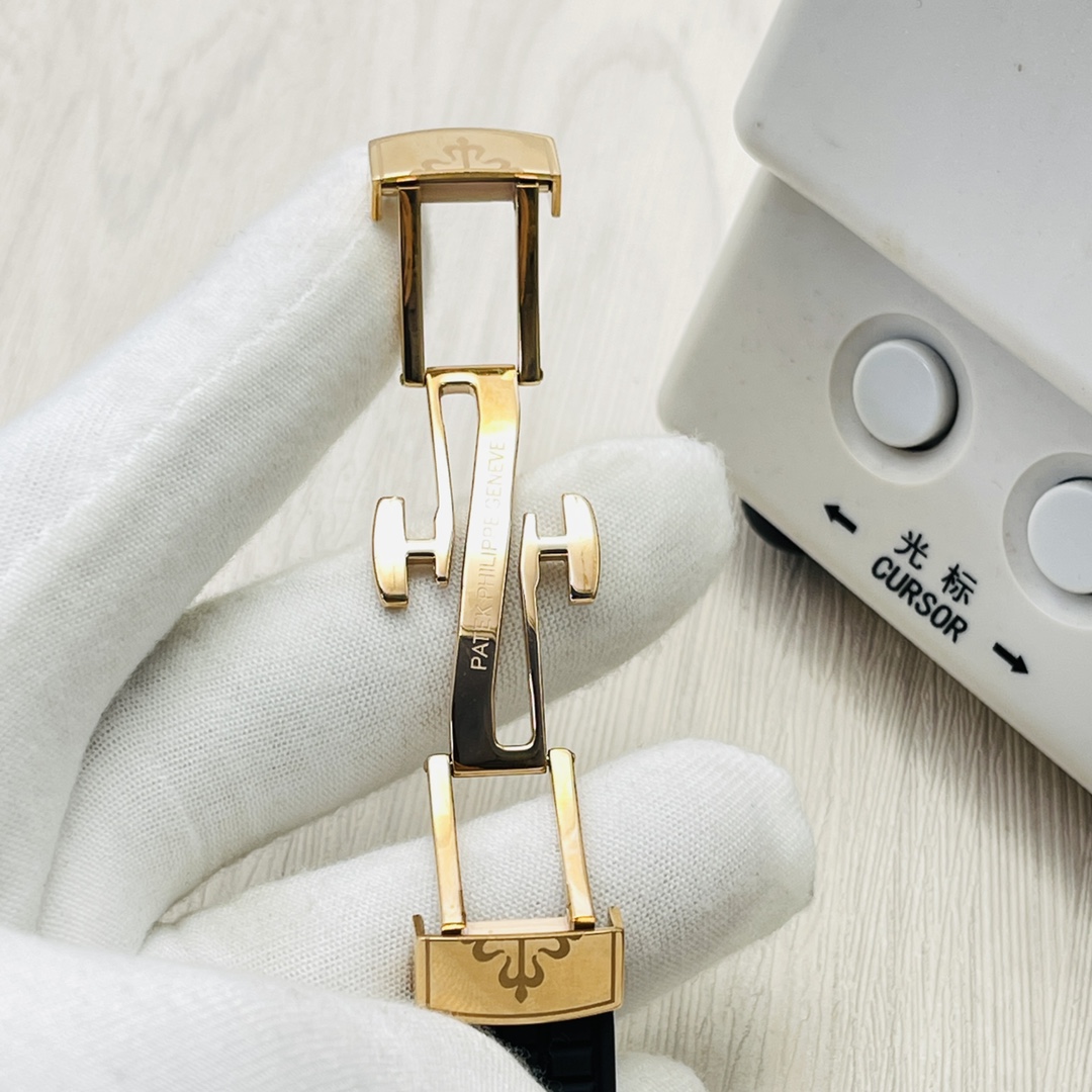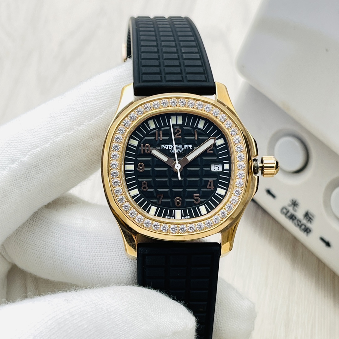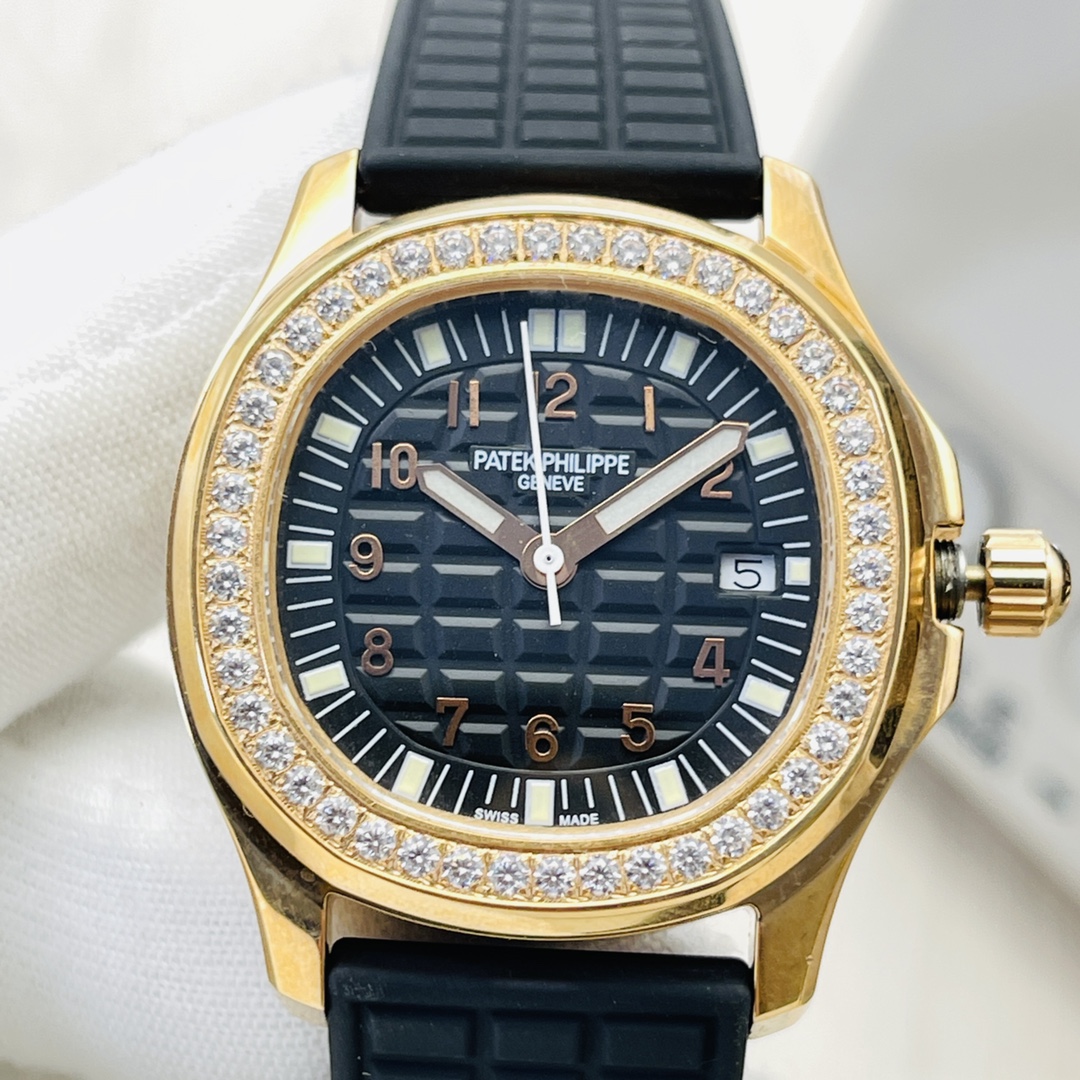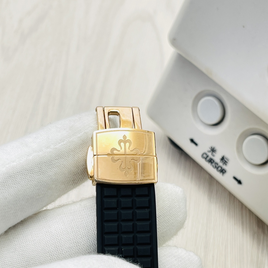 Die Patek Philippe Aquanaut 5068R-001 Replica-Uhr ist der Inbegriff zeitgenössischen Chics und zeitloser Meisterschaft. Das Gehäuse hat die Maße 35,6 mm x 9,5 mm und ist in einer dünnen, kissenförmigen Ausführung aus goldbeschichtetem Edelstahl gefertigt, das mit einem mit Diamanten besetzten Lünette für einen kostbaren Glanz aufgewertet wurde. Das dramatisch geprägte schwarze Zifferblatt verfügt über arabische Ziffern als Stundenmarkierungen und ein Datum bei 3 Uhr. Es sieht nicht nur schön aus, sondern erfüllt auch einen Zweck.