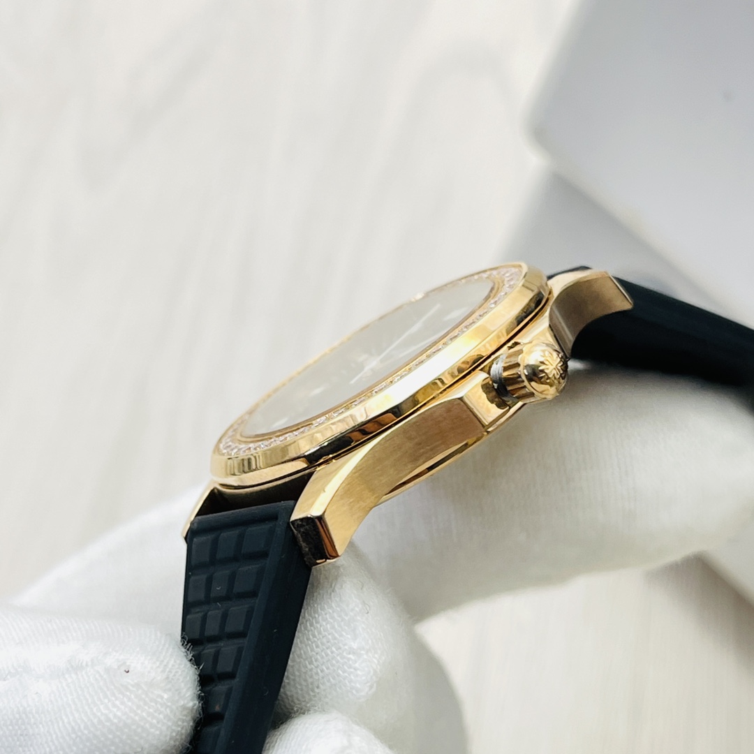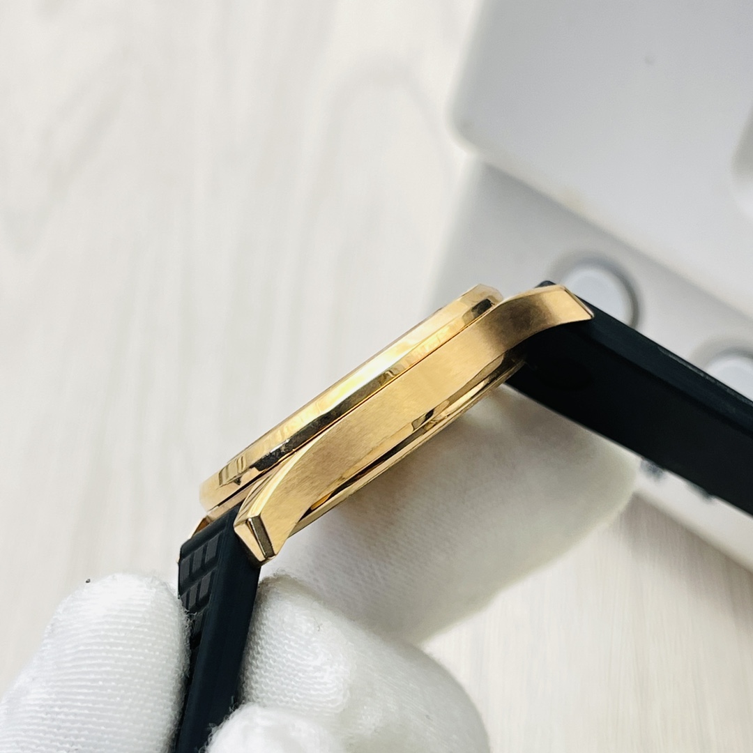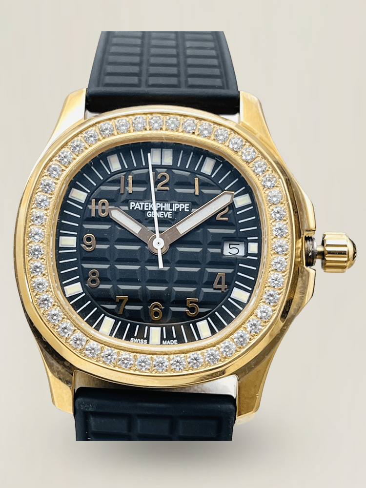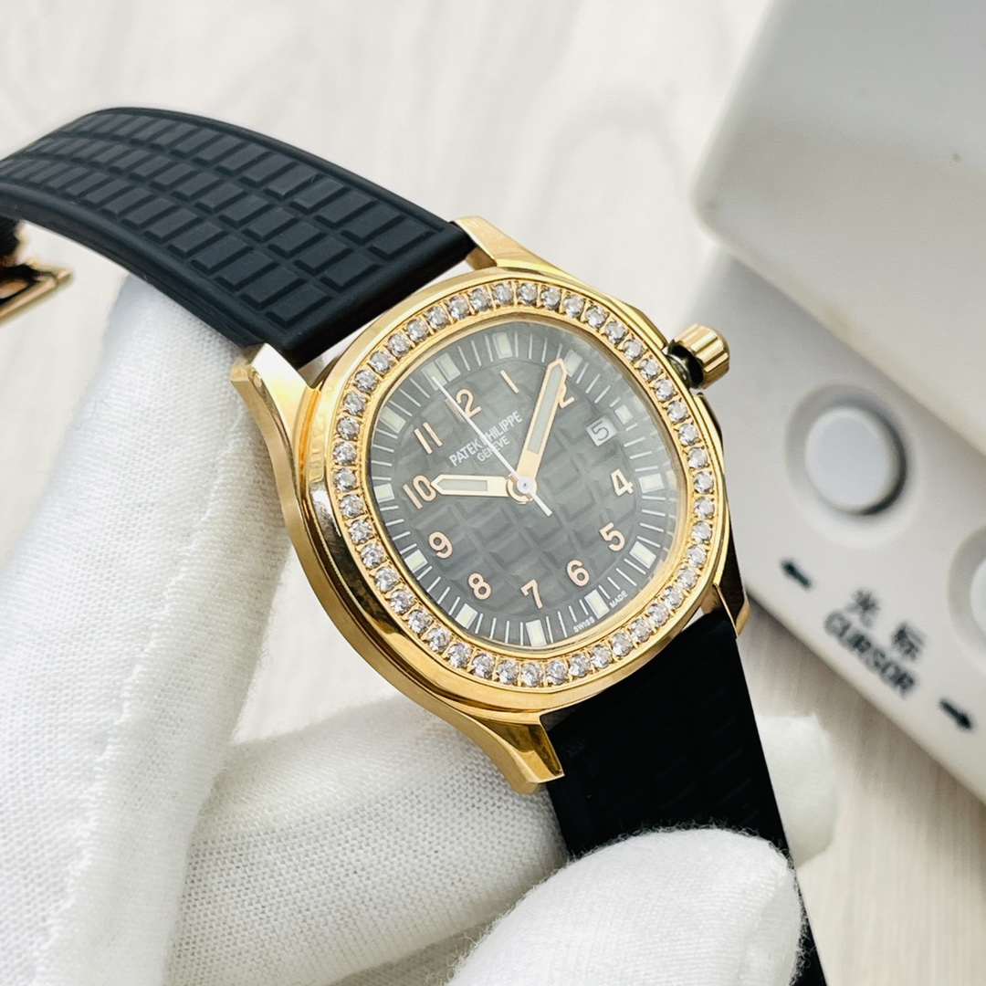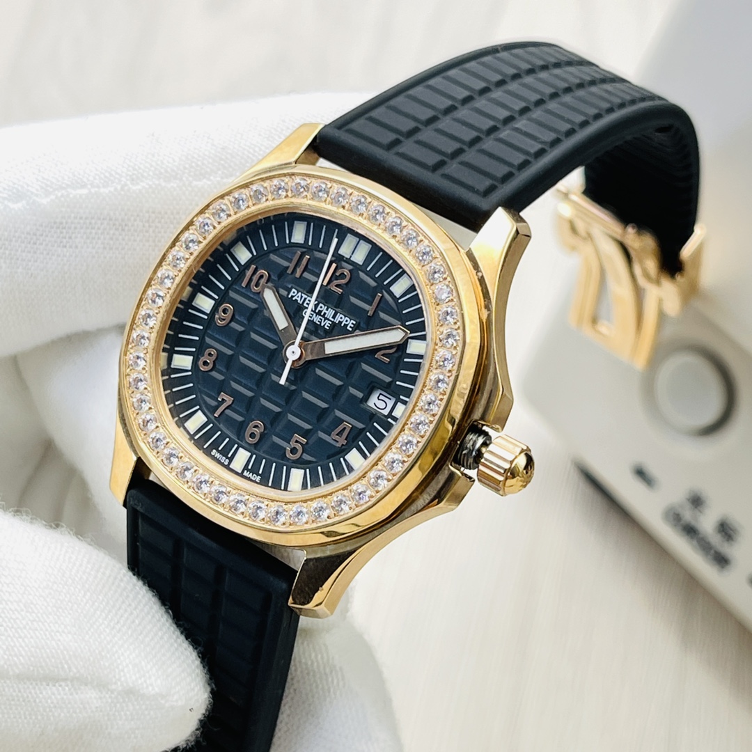 Die Patek Philippe Aquanaut 5068R-001 Replica-Uhr ist der Inbegriff zeitgenössischen Chics und zeitloser Meisterschaft. Das Gehäuse hat die Maße 35,6 mm x 9,5 mm und ist in einer dünnen, kissenförmigen Ausführung aus goldbeschichtetem Edelstahl gefertigt, das mit einem mit Diamanten besetzten Lünette für einen kostbaren Glanz aufgewertet wurde. Das dramatisch geprägte schwarze Zifferblatt verfügt über arabische Ziffern als Stundenmarkierungen und ein Datum bei 3 Uhr. Es sieht nicht nur schön aus, sondern erfüllt auch einen Zweck.