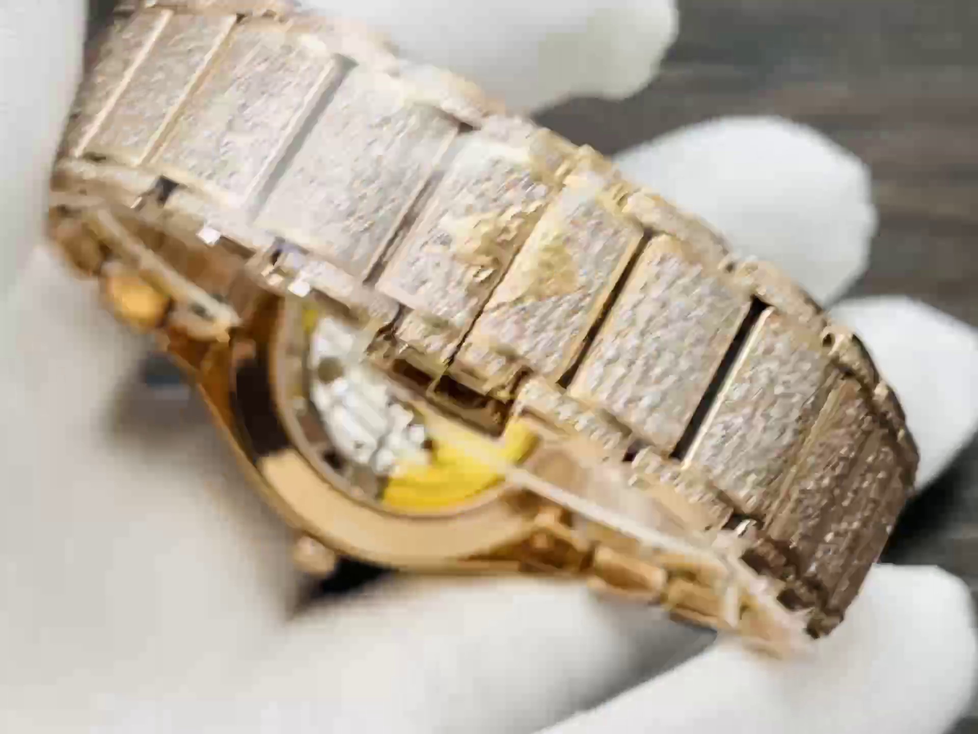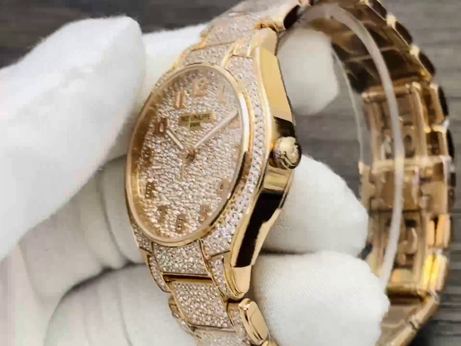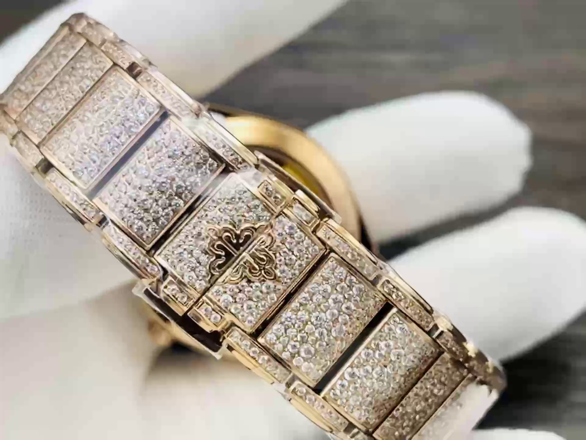 | Zifferblattfarbe | Roségold mit vollständigem Diamantbesatz & aufgesetzten goldenen Ziffern |