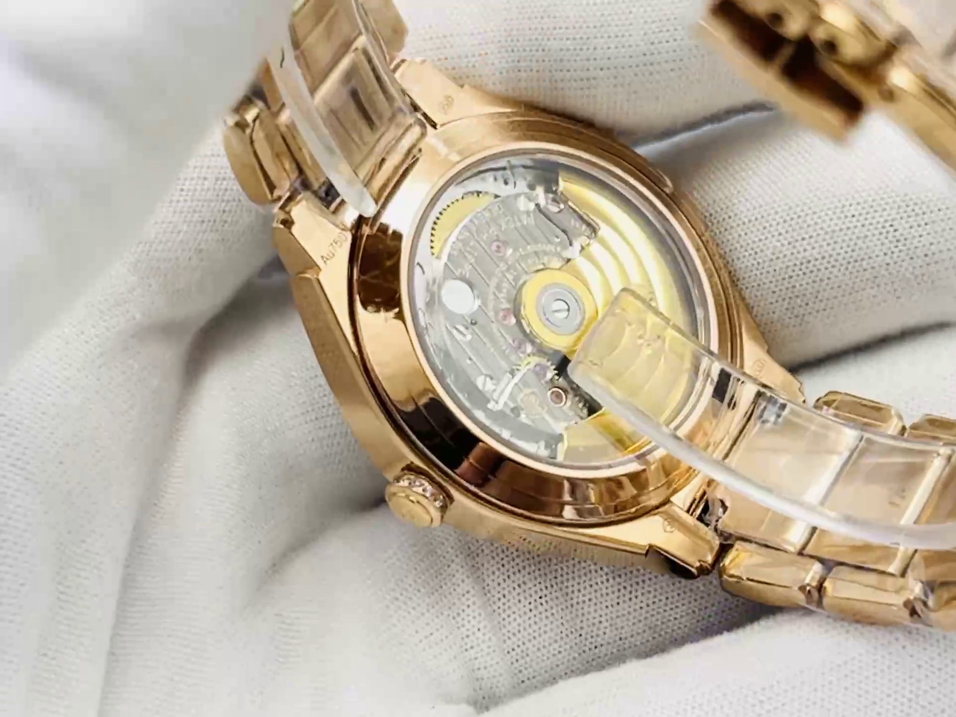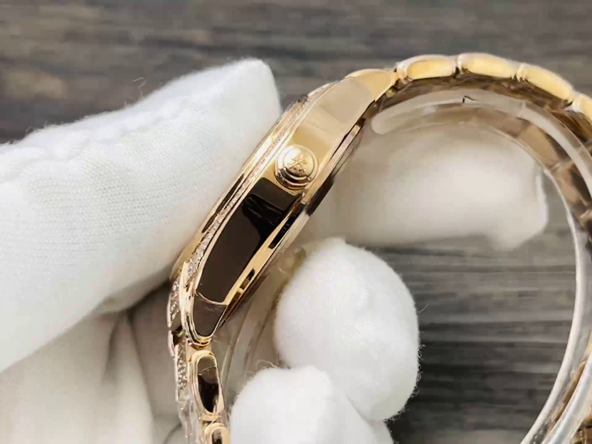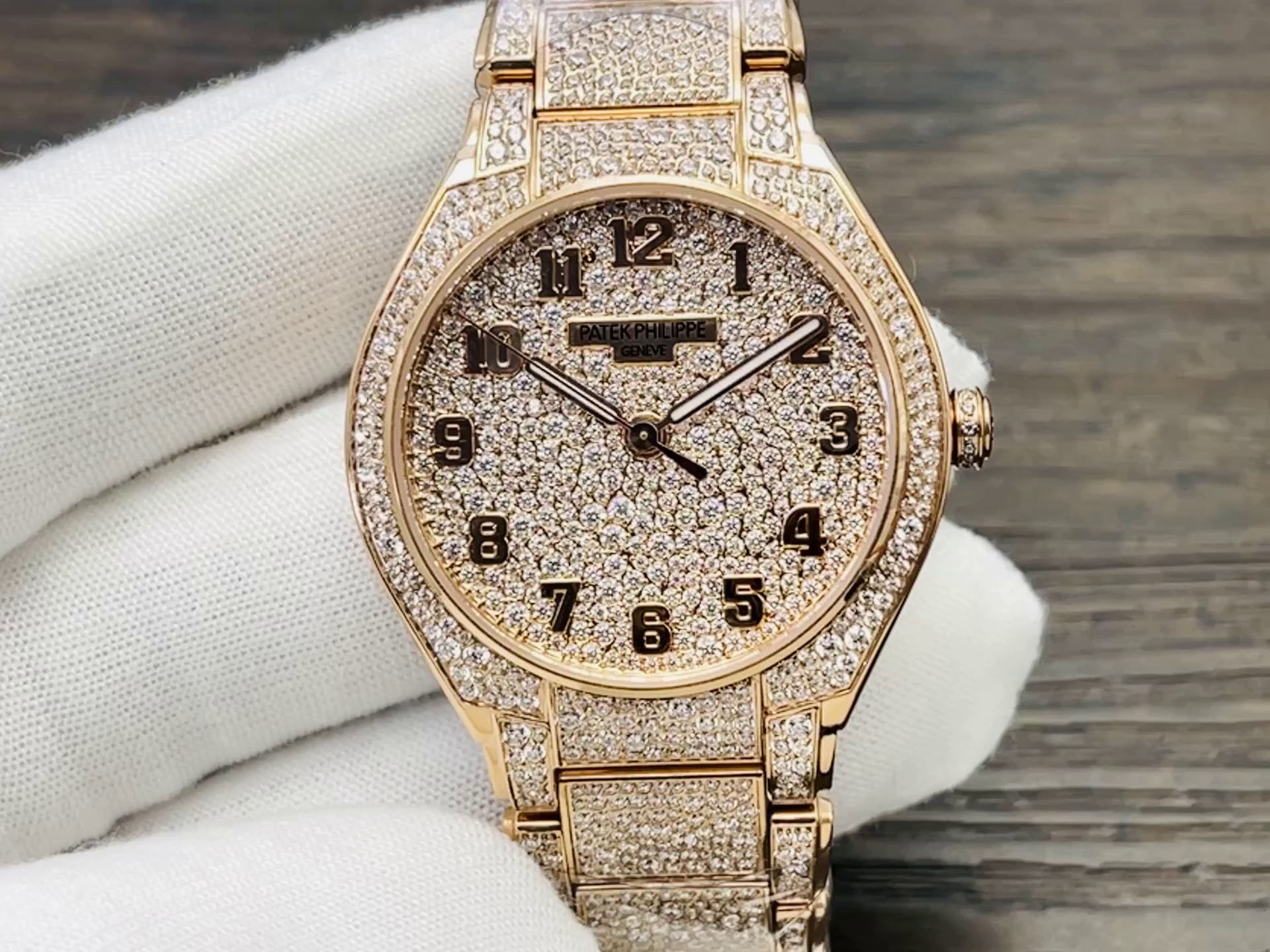 | Zifferblattfarbe | Roségold mit vollständigem Diamantbesatz & aufgesetzten goldenen Ziffern |