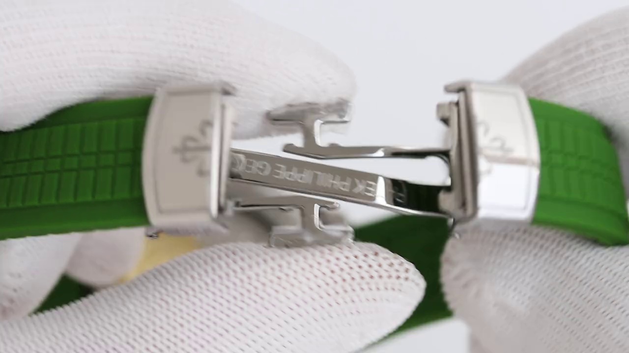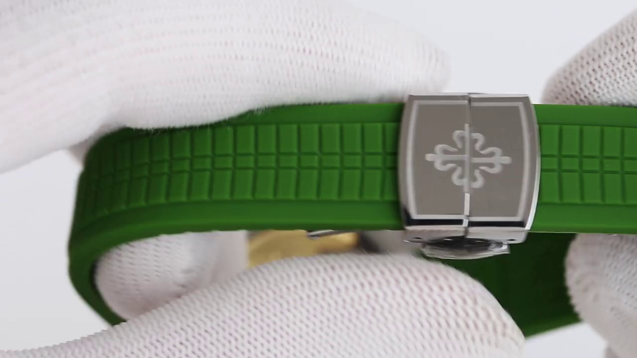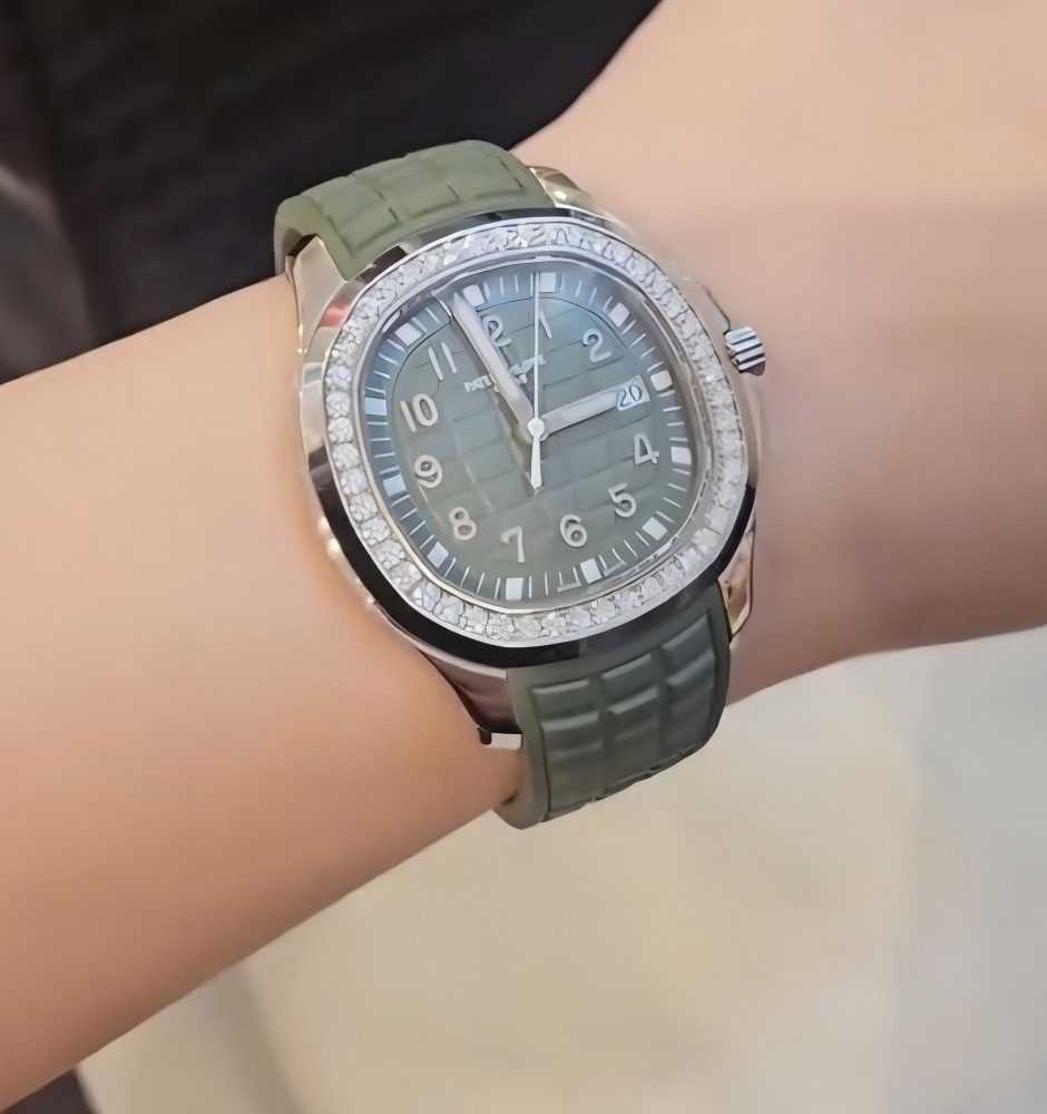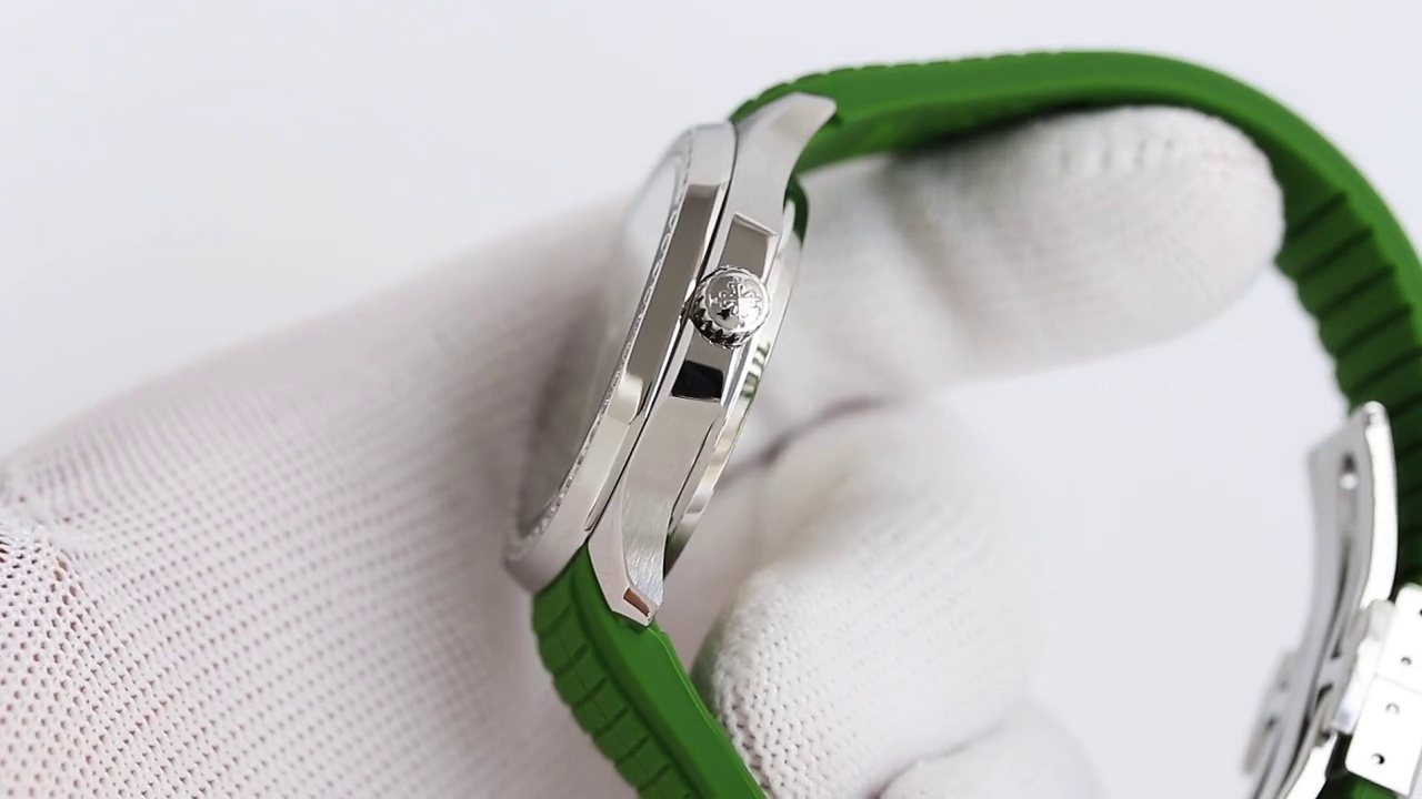 Das khaki-grüne Zifferblatt ist mit dem geprägten klassischen Aquanaut-Design verziert. Es wird durch arabische Ziffern und ein Datumsfenster auf der 3-Uhr-Position ergänzt, sowohl funktional als auch ästhetisch. Das weiche grüne Gummiband harmoniert gut mit dem Zifferblatt und sorgt für einen einheitlichen und schicken Look.