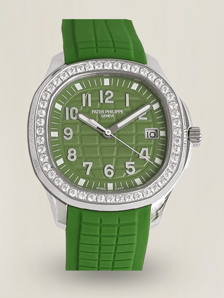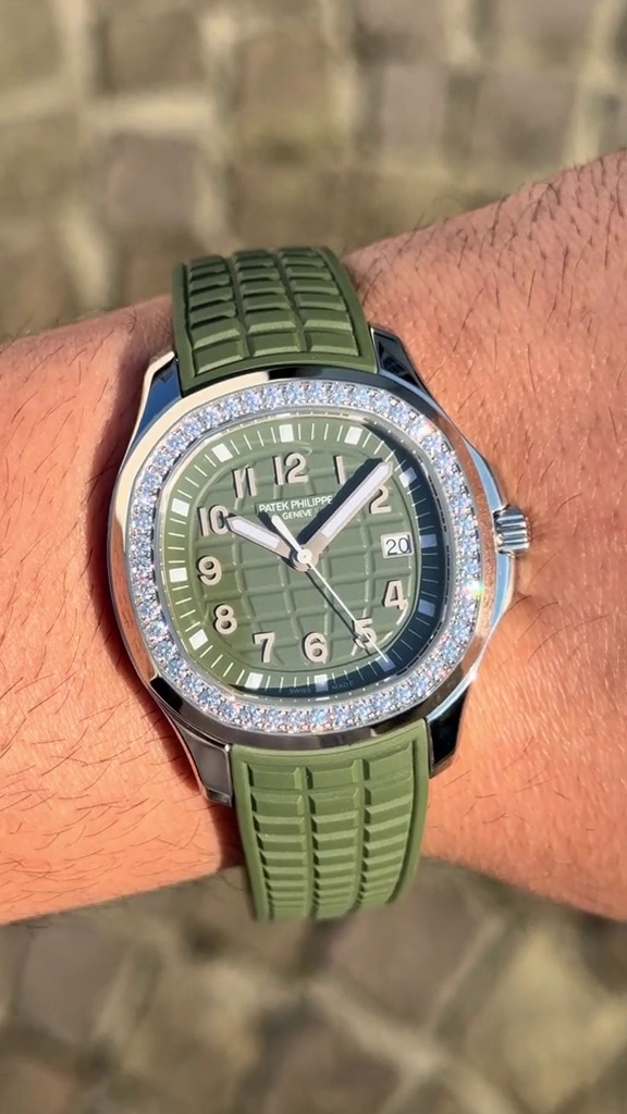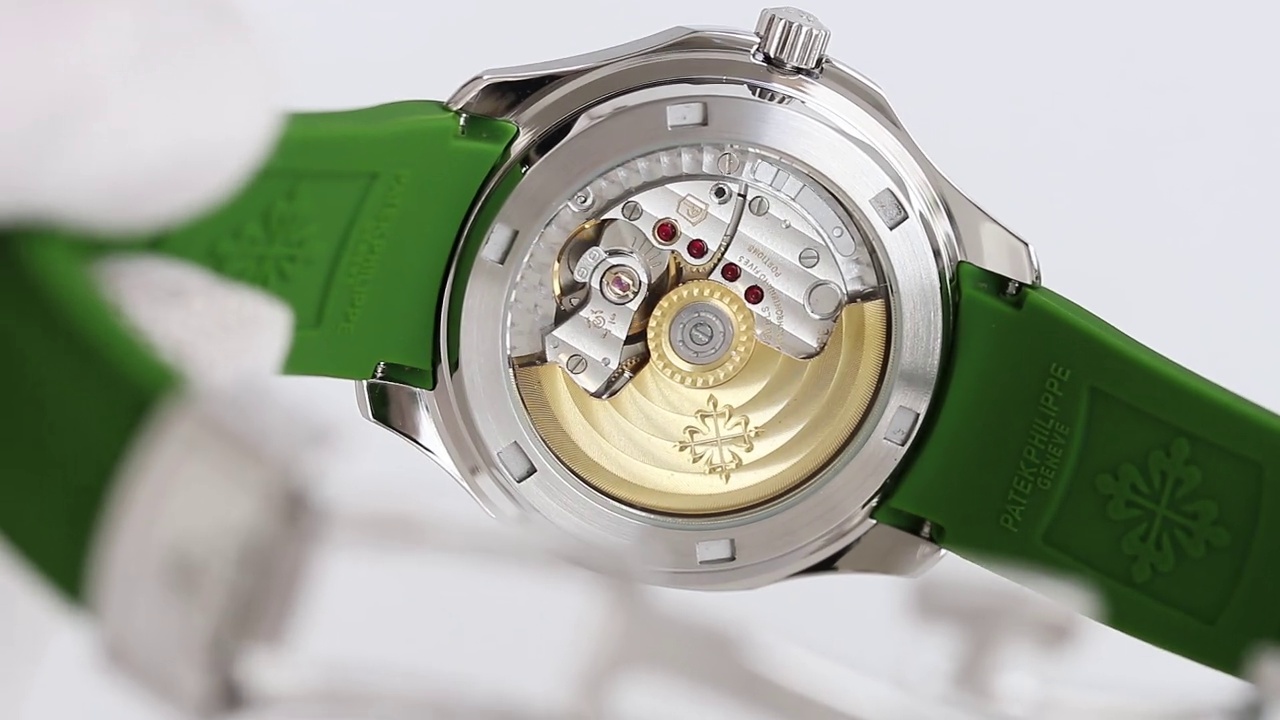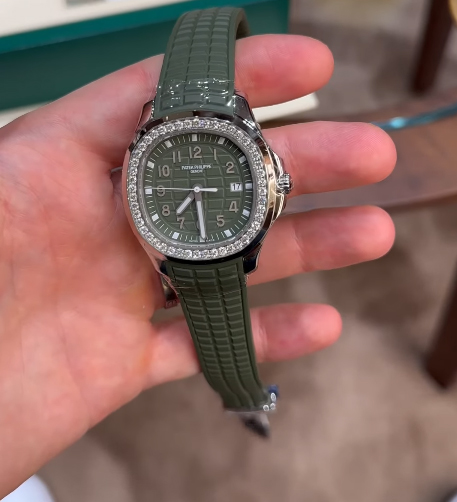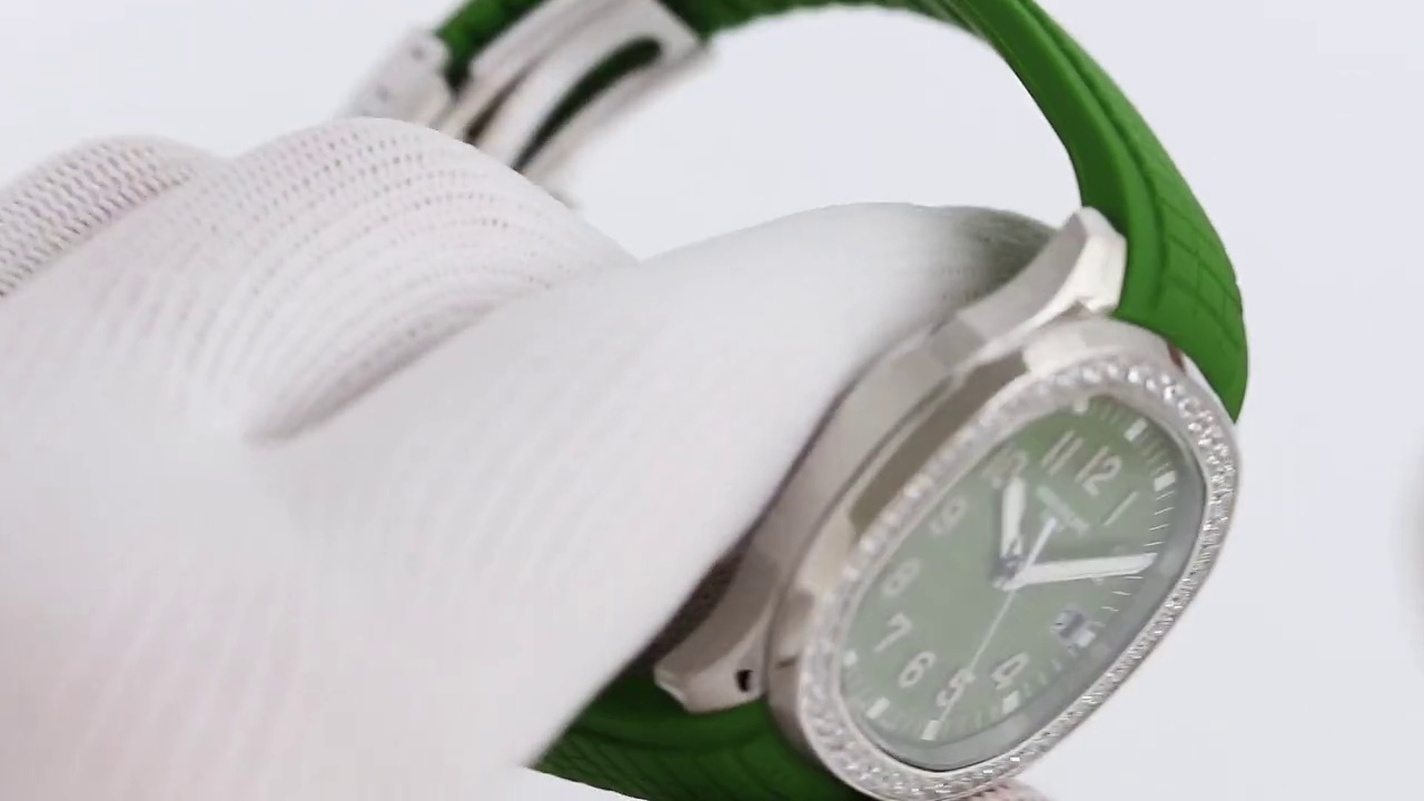 Das khaki-grüne Zifferblatt ist mit dem geprägten klassischen Aquanaut-Design verziert. Es wird durch arabische Ziffern und ein Datumsfenster auf der 3-Uhr-Position ergänzt, sowohl funktional als auch ästhetisch. Das weiche grüne Gummiband harmoniert gut mit dem Zifferblatt und sorgt für einen einheitlichen und schicken Look.