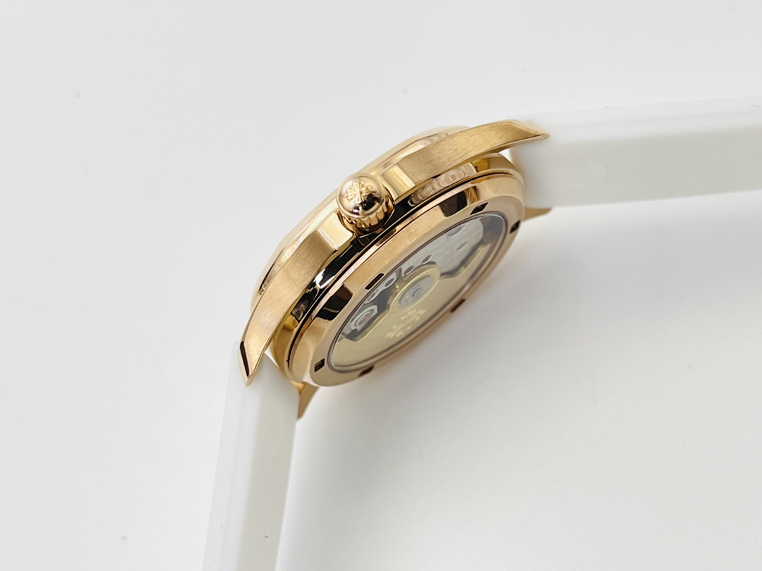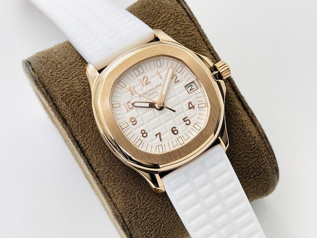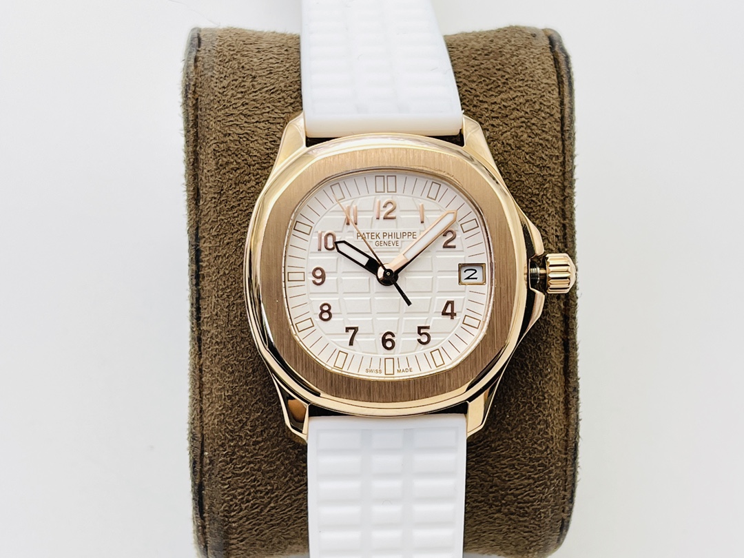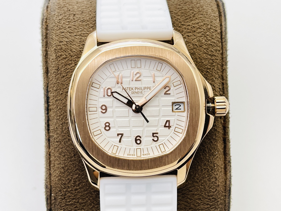 Diese Patek Philippe Aquanaut Luce 5068R-001 Replik ist eine schöne Uhr für Damen. Ihr vergoldetes Gehäuse wirkt dezent. Es hat einen Durchmesser von 35,6 mm. Das weiße Zifferblatt zeigt das gewohnte Aquanaut-Design. Die goldenen Ziffern stechen hervor und verleihen der Uhr ein elegantes und hochwertiges Aussehen. Ein praktisches Datumsfenster bei 3 Uhr sorgt für alltäglichen Komfort.