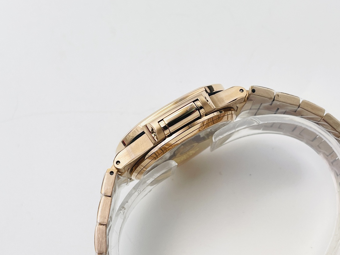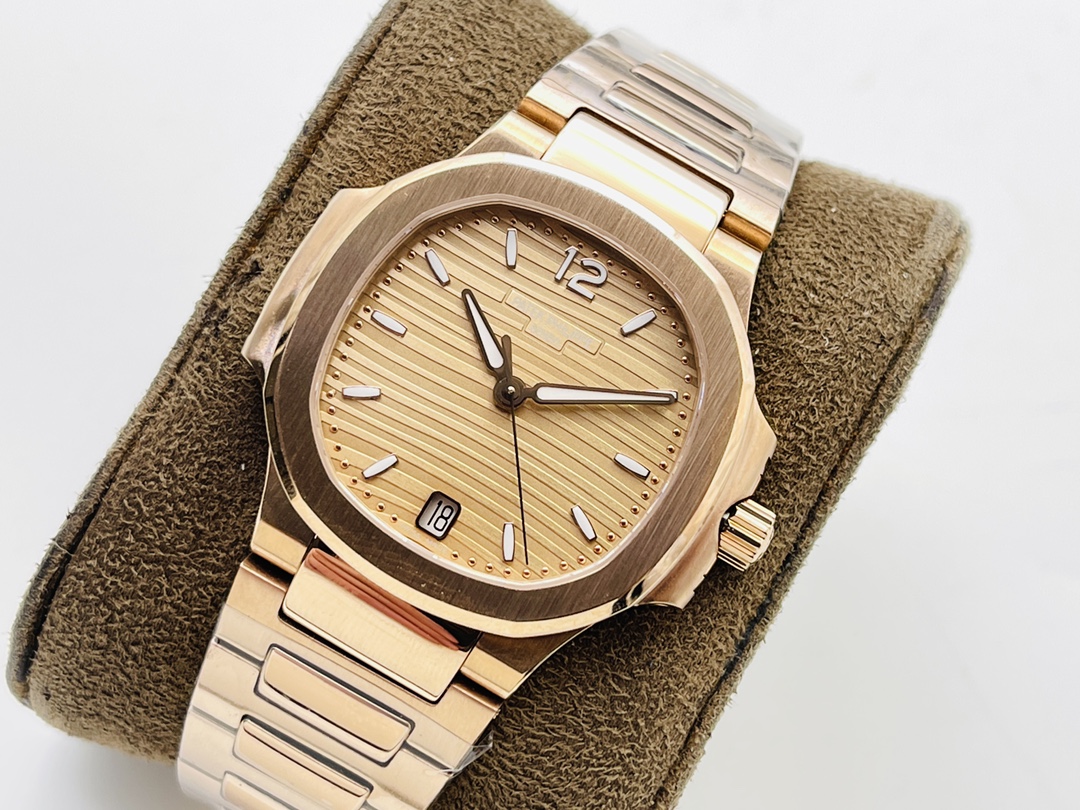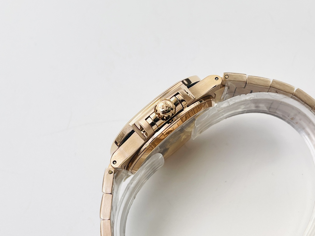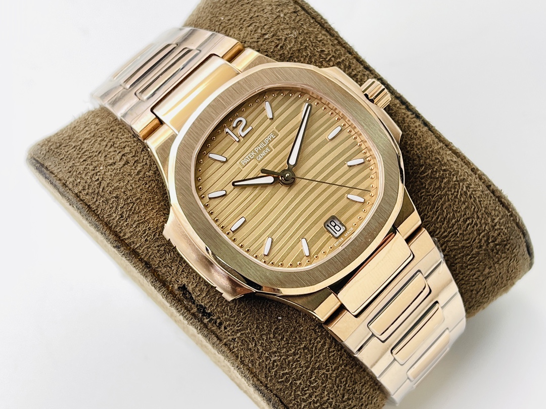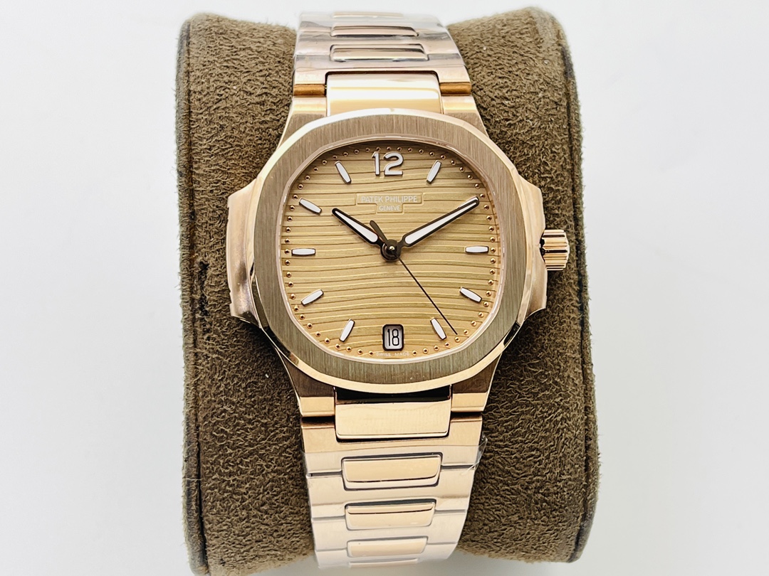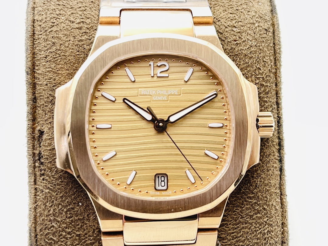 Die Patek Philippe Nautilus 7118/1R-010 Replica strahlt klassische Eleganz und modernen Stil aus und ist eine anspruchsvolle Wahl für Frauen von heute. Mit einem Durchmesser von 35,2 mm verfügt die Uhr über ein goldenes Zifferblatt mit dem charakteristischen, geprägten Horizontalmuster von Patek Philippe. Die aufgesetzten Stundenmarkierungen in erhobener Stabform verleihen dem Erscheinungsbild eine gewisse Tiefe und Raffinesse. Eine dünne, dezente Datumsanzeige bei 6 Uhr erfüllt ihre Funktion, ohne die Schönheit zu beeinträchtigen.