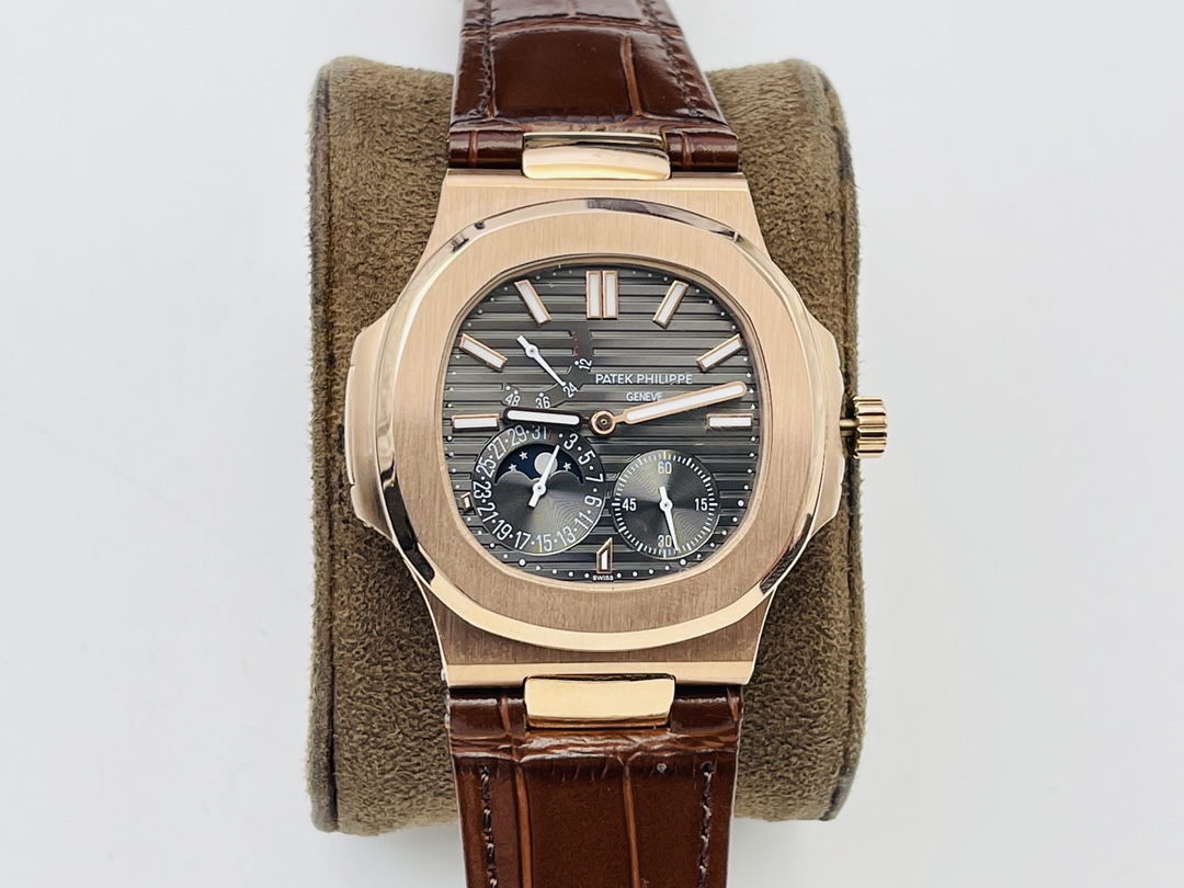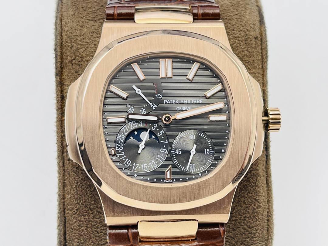 Die Replica Patek Philippe Nautilus 5712R-001 bietet nützliche Funktionen. Sie hat ein Gehäuse von 40 mm. Das graue Zifferblatt verwendet die klassischen horizontalen Linien der Nautilus-Serie. Das Layout bleibt klar und ausgewogen. Die Gangreserveanzeige befindet sich zwischen 10 und 11. Die Mondphase und das Datum sind zwischen 7 und 8 platziert. Der kleine Sekundenzeiger sitzt auf der 4-Uhr-Position.