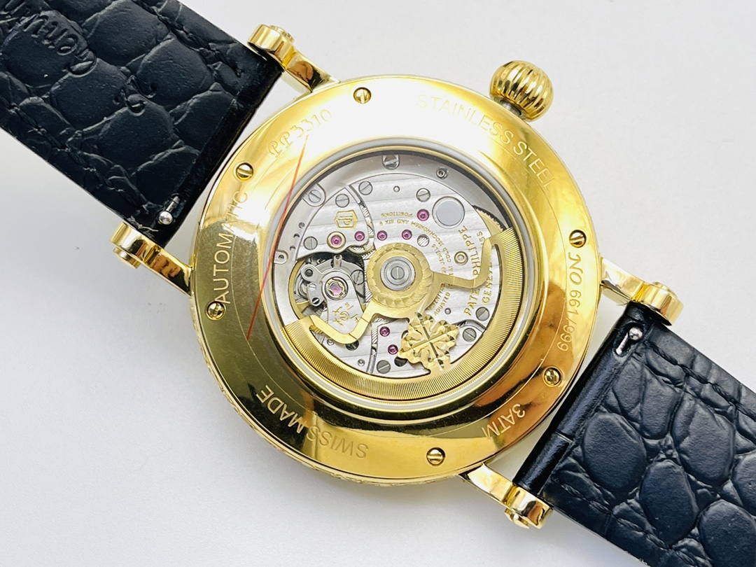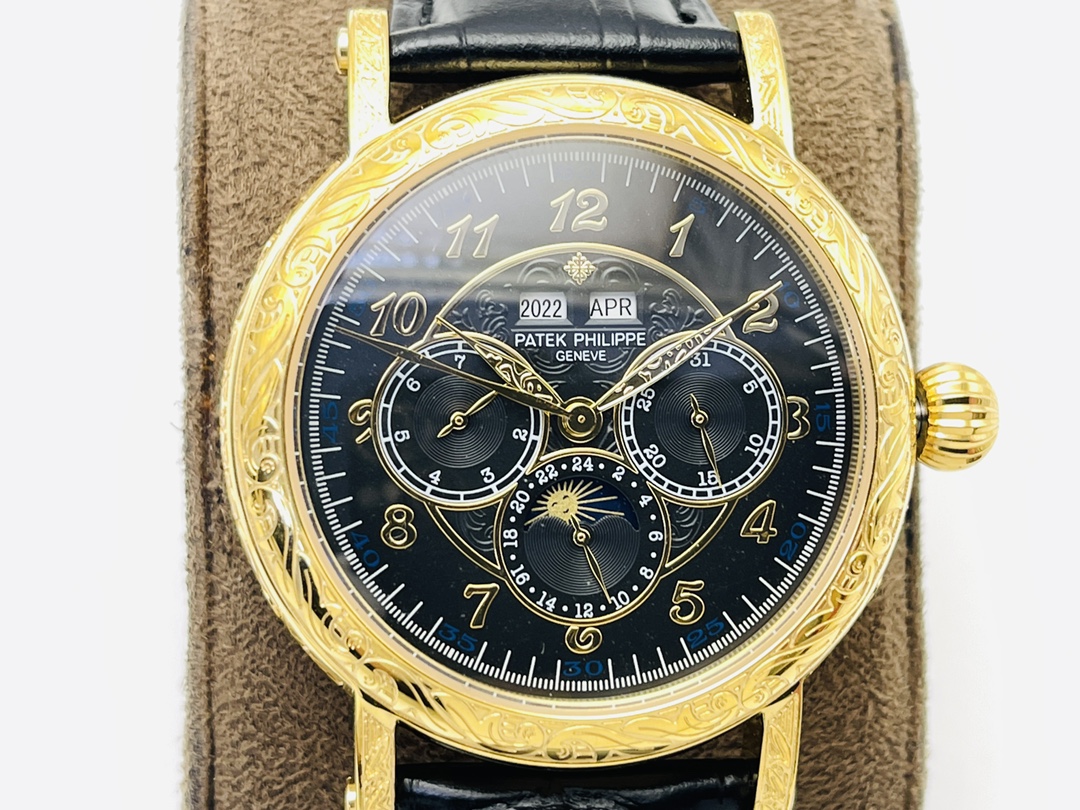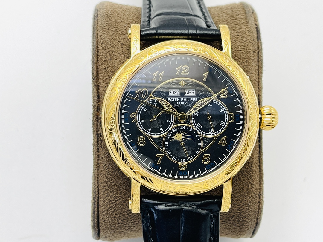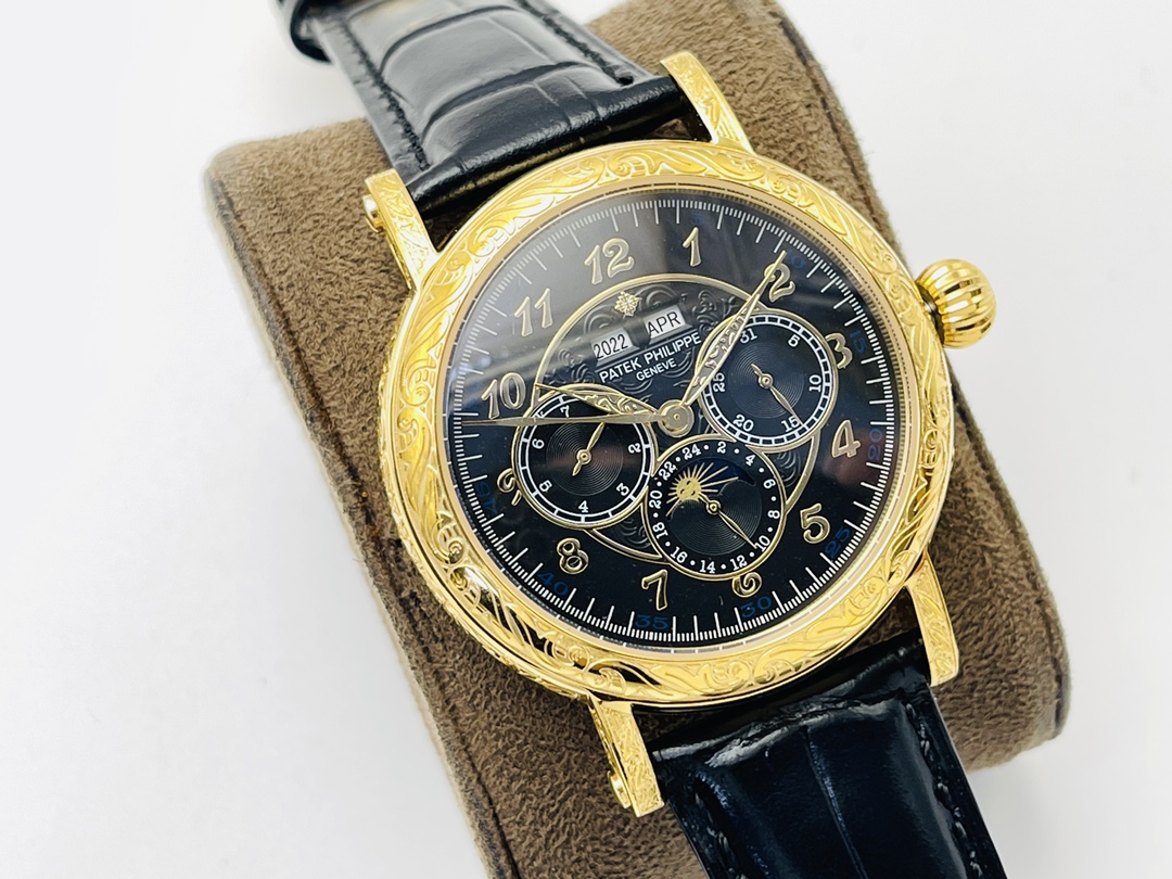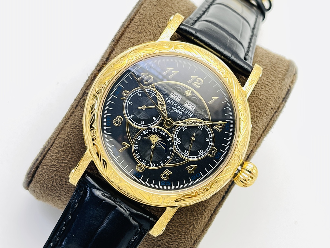 Dieses atemberaubende Zeitmesser verfügt über ein raffiniertes schwarzes Zifferblatt mit eleganten arabischen Ziffern, mehreren Unterzifferblättern und klaren Kalenderfenstern, die Tag, Datum, Monat, Schaltjahr und Mondphase anzeigen – perfekt nachgebildet im legendären Layout des Originals. Untergebracht in einem exquisiten Calatrava-Gehäuse mit handgravierter 18K-Goldbeschichtung (42 mm Durchmesser), bietet es das ideale Gleichgewicht zwischen Präsenz und Tragbarkeit für sowohl geschäftliche als auch legere Anlässe.