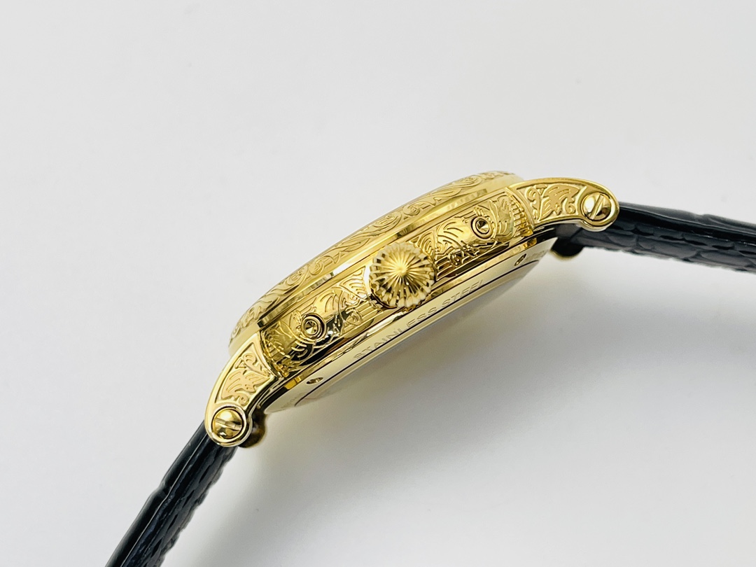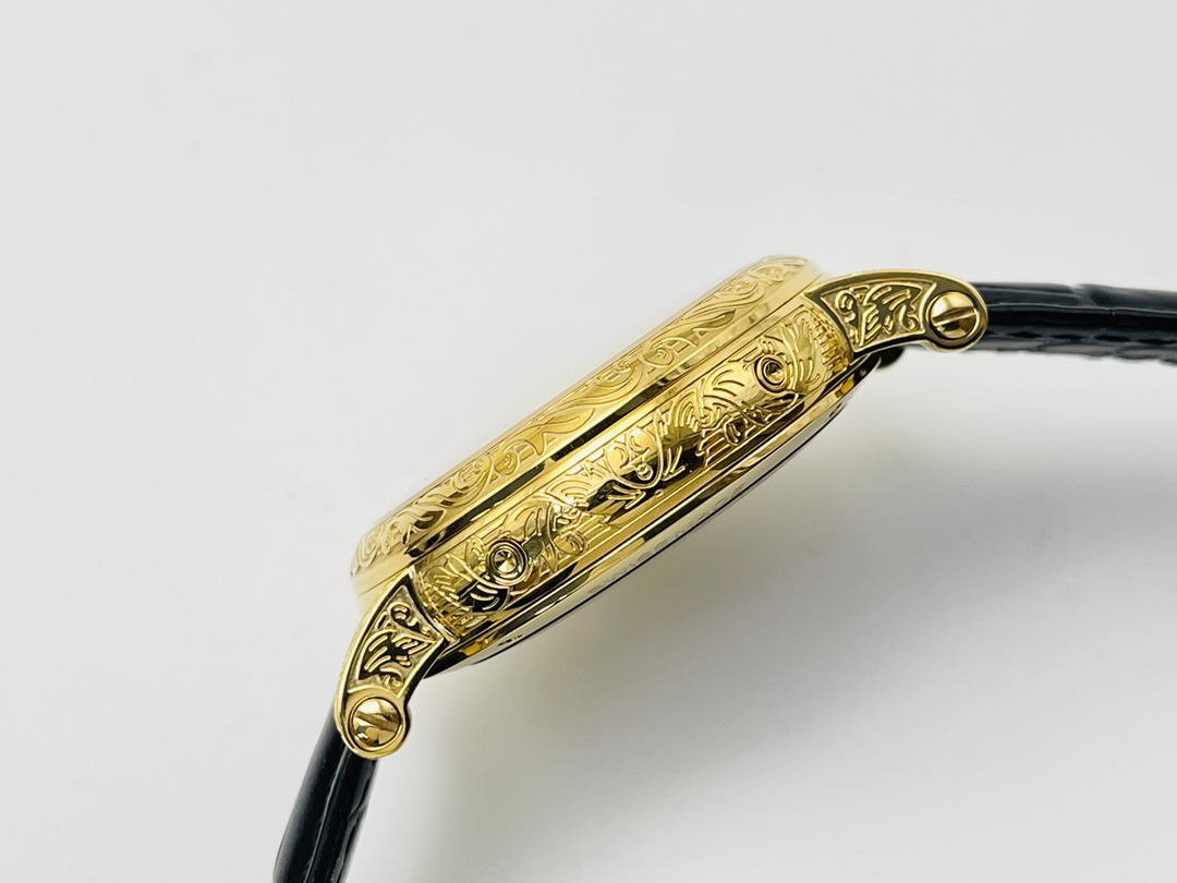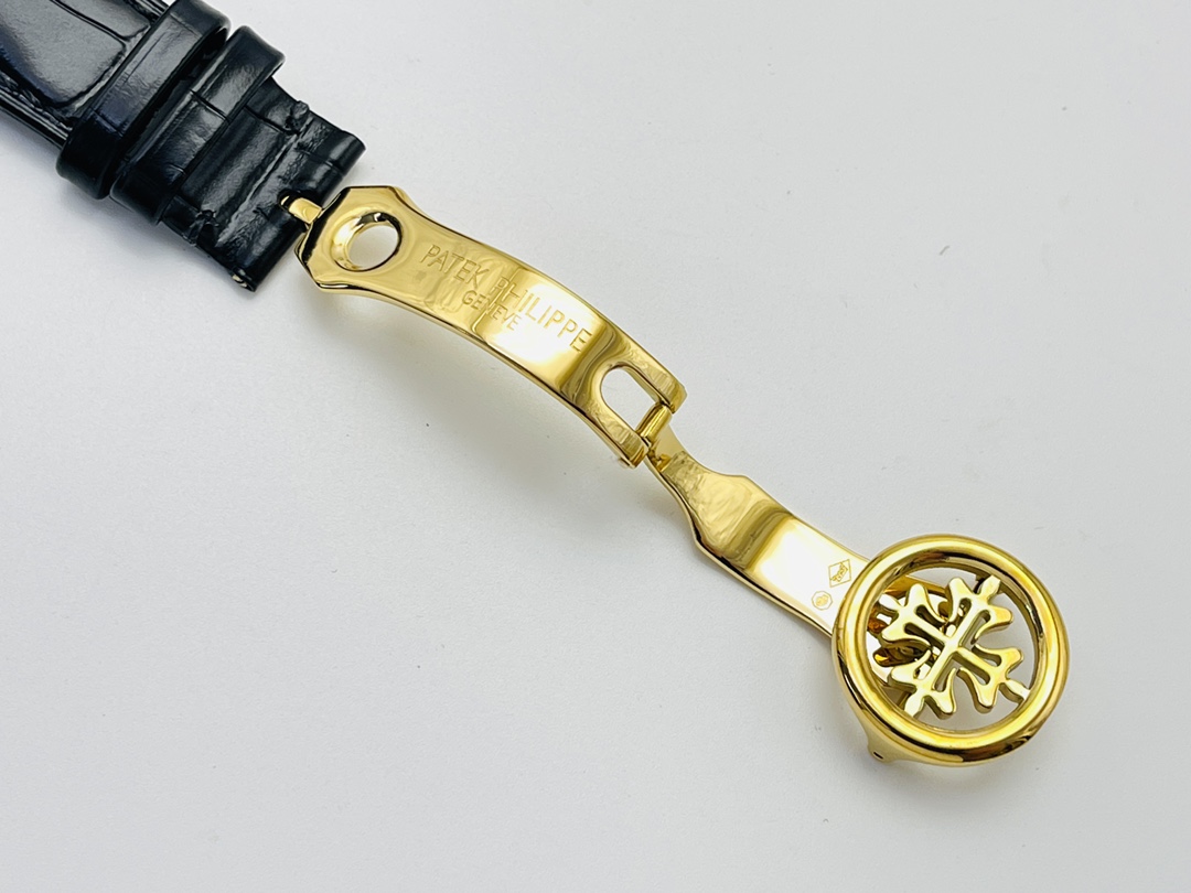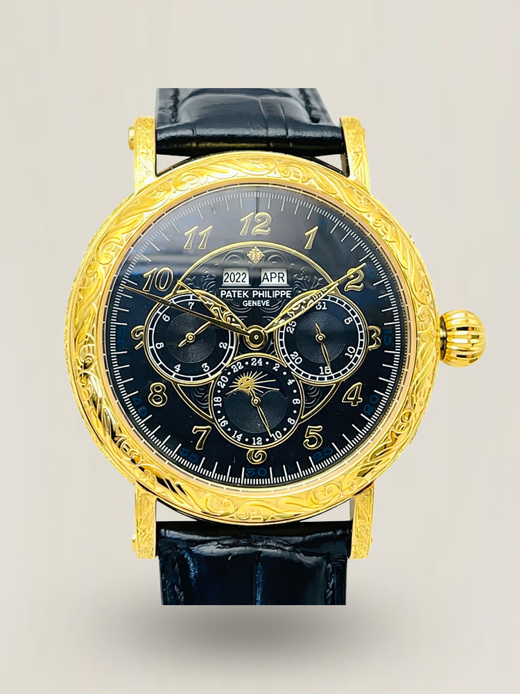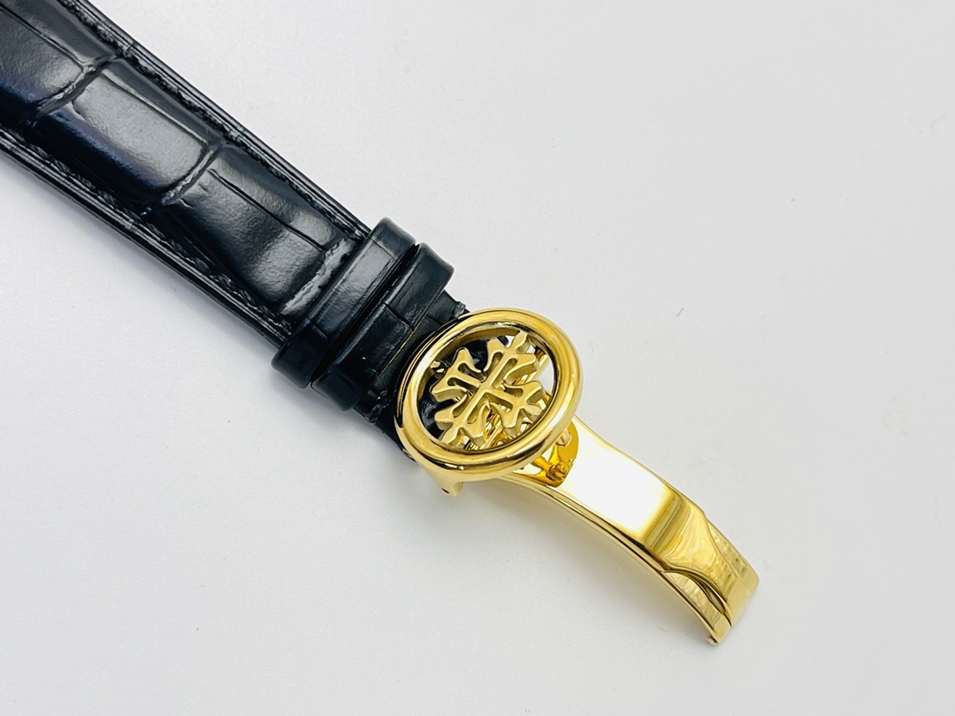 Dieses atemberaubende Zeitmesser verfügt über ein raffiniertes schwarzes Zifferblatt mit eleganten arabischen Ziffern, mehreren Unterzifferblättern und klaren Kalenderfenstern, die Tag, Datum, Monat, Schaltjahr und Mondphase anzeigen – perfekt nachgebildet im legendären Layout des Originals. Untergebracht in einem exquisiten Calatrava-Gehäuse mit handgravierter 18K-Goldbeschichtung (42 mm Durchmesser), bietet es das ideale Gleichgewicht zwischen Präsenz und Tragbarkeit für sowohl geschäftliche als auch legere Anlässe.