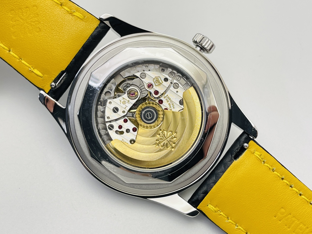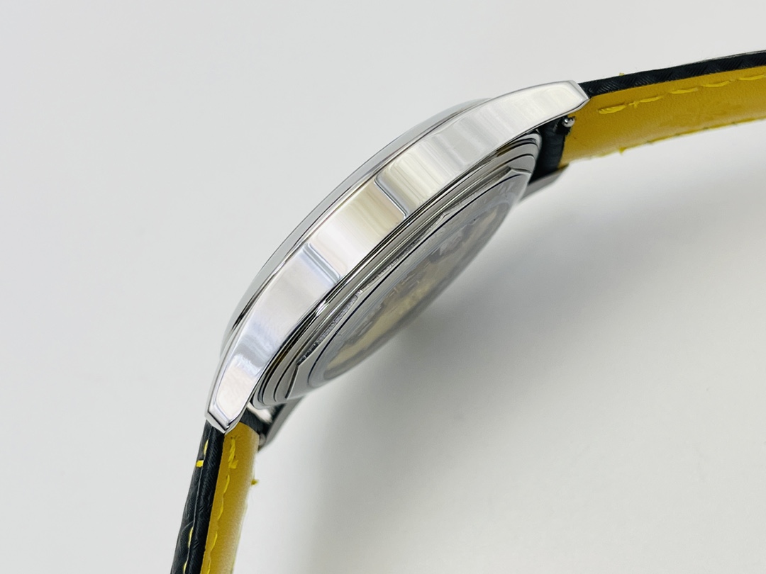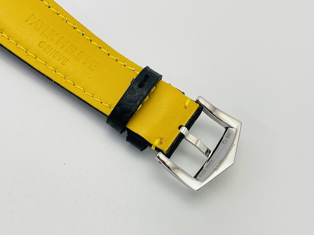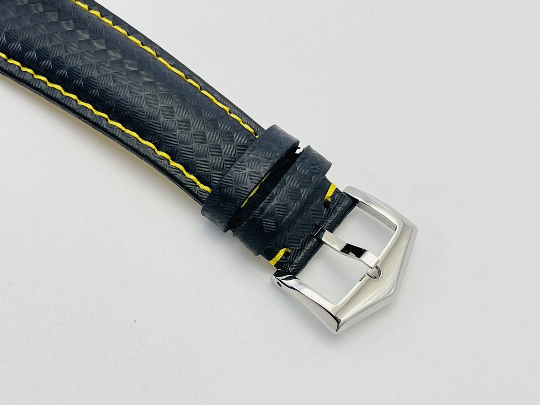 Unsere Uhr verfügt über ein Schweizer Automatikwerk, das individuell abgestimmt wurde, um einen reibungslosen Betrieb zu gewährleisten. Die Uhr basiert auf dem legendären Cal.324 Werk, ist jedoch schlanker und stabiler als die Originaluhr. Der Sekundenzeiger bewegt sich gleichmäßig und ist fast identisch mit dem der Originaluhr. Die Uhr hat ein hochwertiges schwarzes Lederarmband, das ein präzise geprägtes Kohlefaser-Design im Leder des Armbands aufweist. Das Armband hat zudem eine weiche Innenauskleidung, ein charakteristisches leuchtend gelbes Nähdesign und eine spiegelpolierte Dornschließe.