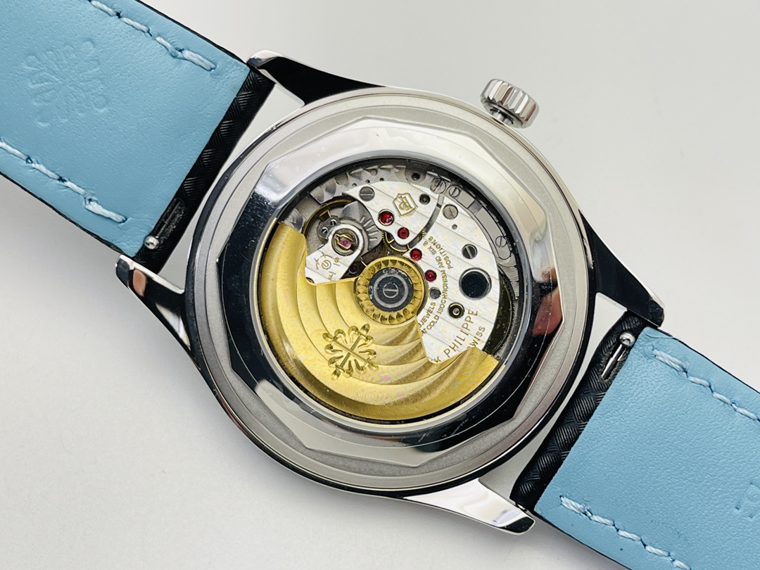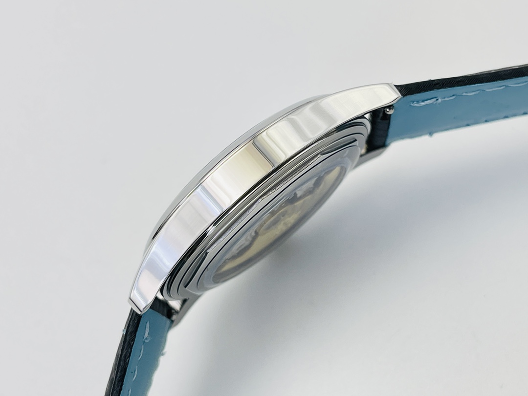 Die Uhr verfügt über ein schlankes, maßgeschneidertes Cal.324 Schweizer Automatikwerk für einen schlanken Look, der näher an der authentischen Uhr ist. Sie hat ein klassisches italienisches Kalbslederarmband, akzentuiert durch himmelblaue Kontrastnähte und ein passendes Futter – exquisite Details, die einen bequemen Sitz gewährleisten. Die Uhr hat ein nahtloses Aussehen mit einer polierten Dornschließe. Die Uhr ist bis zu 50 m wasserdicht und hat ein einfaches, elegantes Design mit einem Hauch von Jugendlichkeit für den anspruchsvollen Gentleman, der selbstbewusst und raffiniert auftreten möchte.