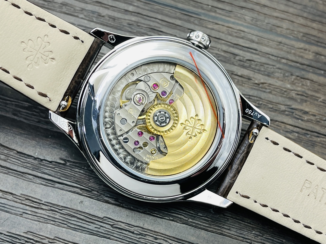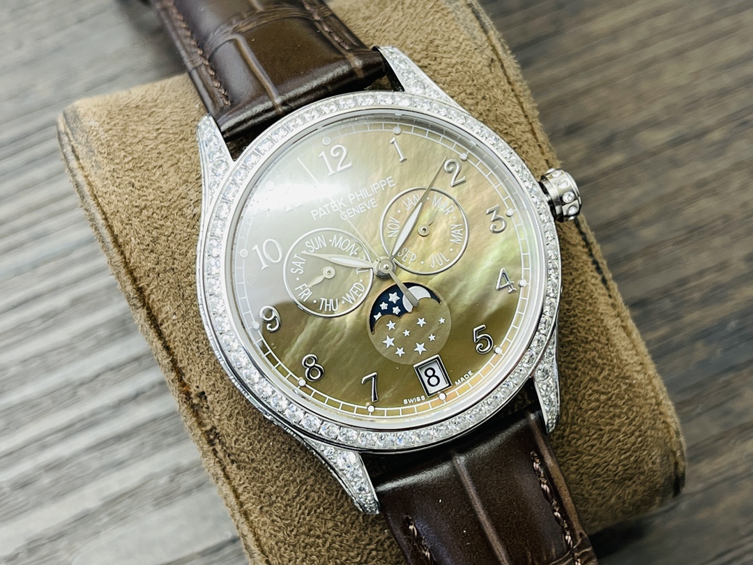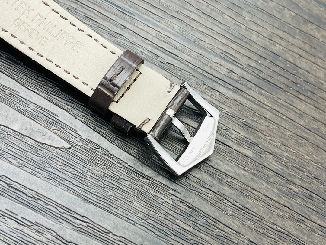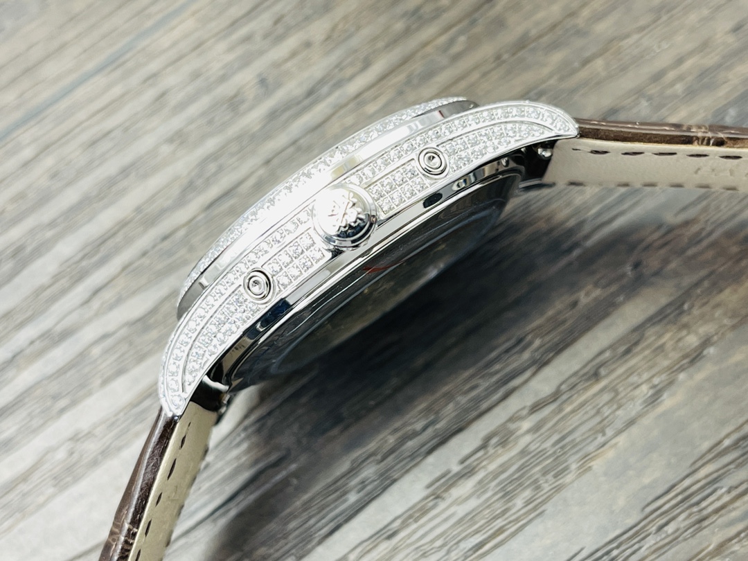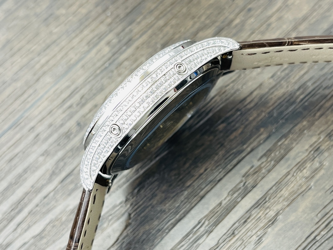 Angetrieben vom automatischen Patek Philippe 324S QA LU Uhrwerk, ist diese Uhr zertifiziert von Patek Philippe. Sie verfügt über ein handgenähtes italienisches Lederarmband mit Stichdetails und einer mit Diamanten besetzten Schließe, die gut mit der mit Diamanten besetzten Lünette und dem Gehäuse aus Weißgold harmoniert.