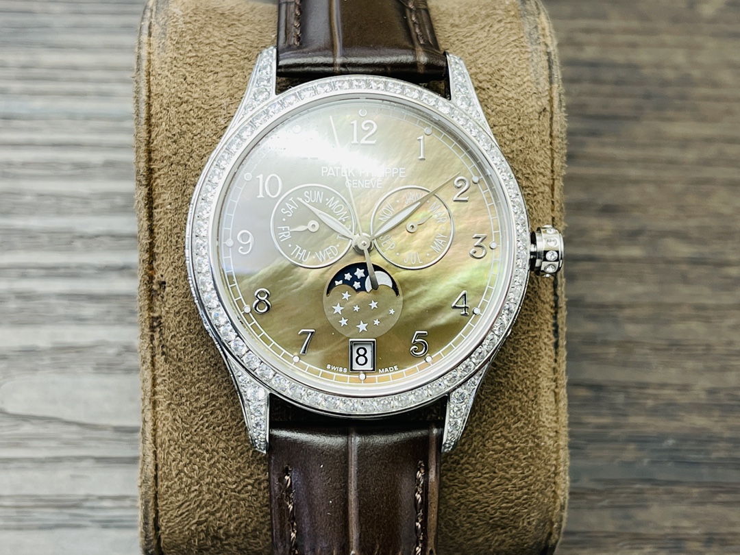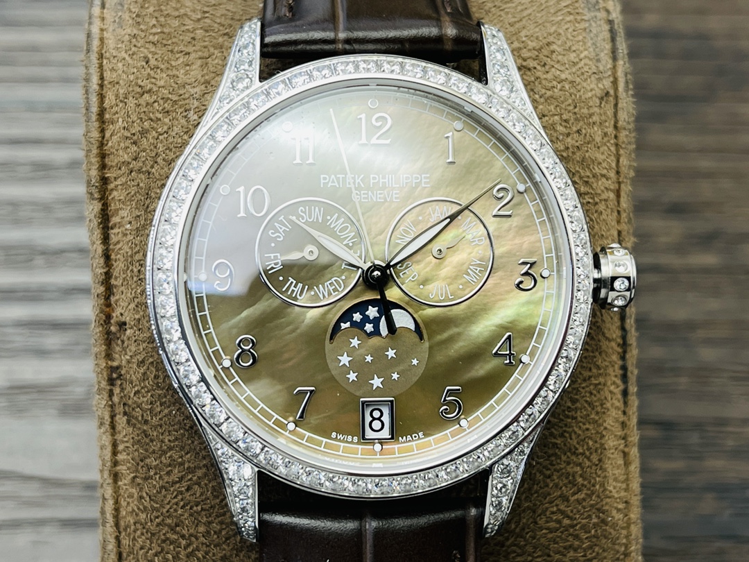 Die Patek Philippe Complications 4948G Perpetual Calendar Moonphase Green Dial White Gold Replica ist ein künstlerisches Werk der Luxusklasse, das ausschließlich für den anspruchsvollen Uhrenliebhaber geschaffen wurde. Kombiniert mit einem wunderschönen 38 mm Gehäuse aus Weißgold, das mit Diamanten besetzt ist, vereint diese Uhr Funktionalität mit klassischer Schönheit.