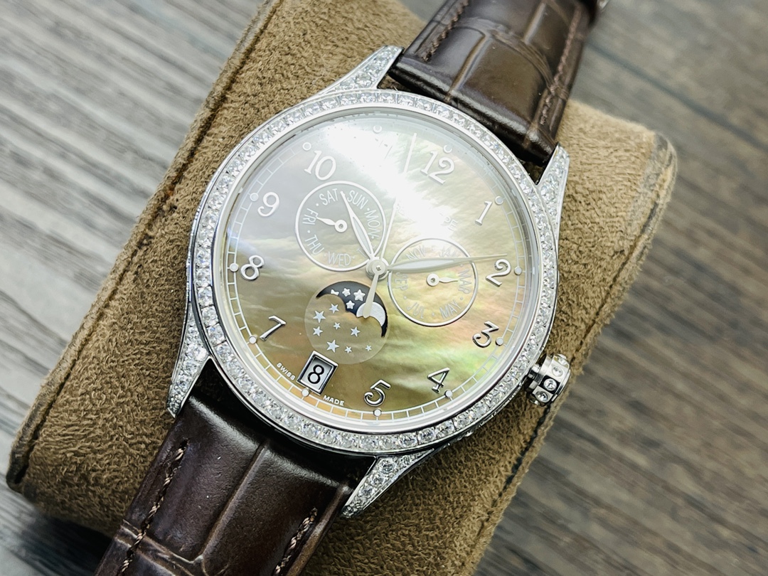 Das markante Kalendendesign zeigt Tag, Datum und Monat auf einfache Weise mit sofortiger Korrektur für ein Jahr. Das schöne grüne Zifferblatt aus Perlmutt mit goldenen arabischen Ziffern und drei goldenen Zeigern ermöglicht eine einfache und natürliche Ablesung der Zeit. Die Monatsanzeige bei 3 Uhr, die Tagesanzeige bei 9 Uhr sowie die Fenster für Datum und Mondphase bei 6 Uhr machen das Layout ansprechend.