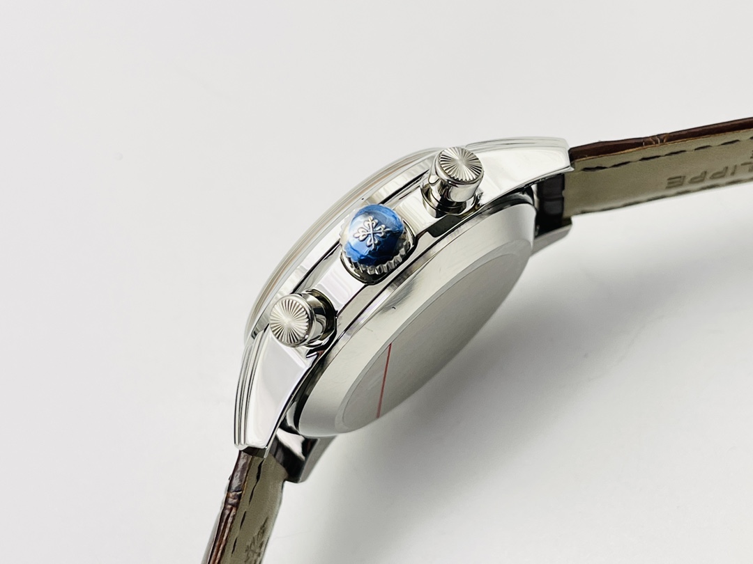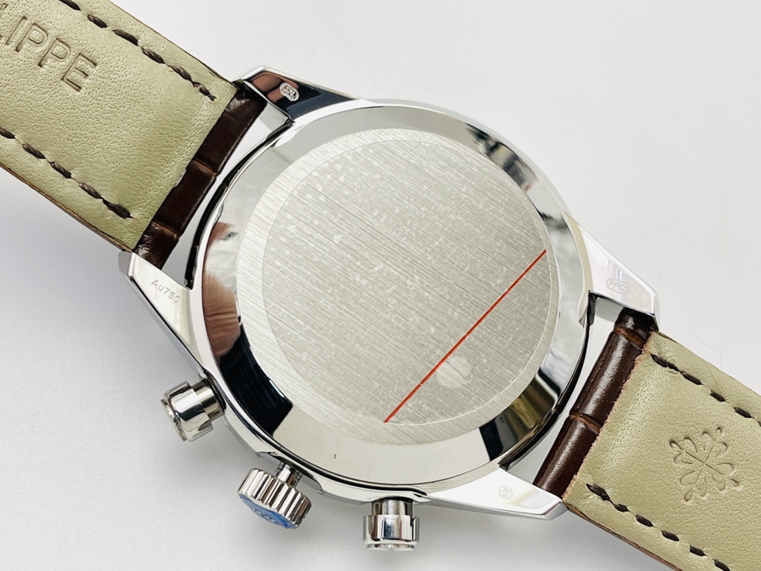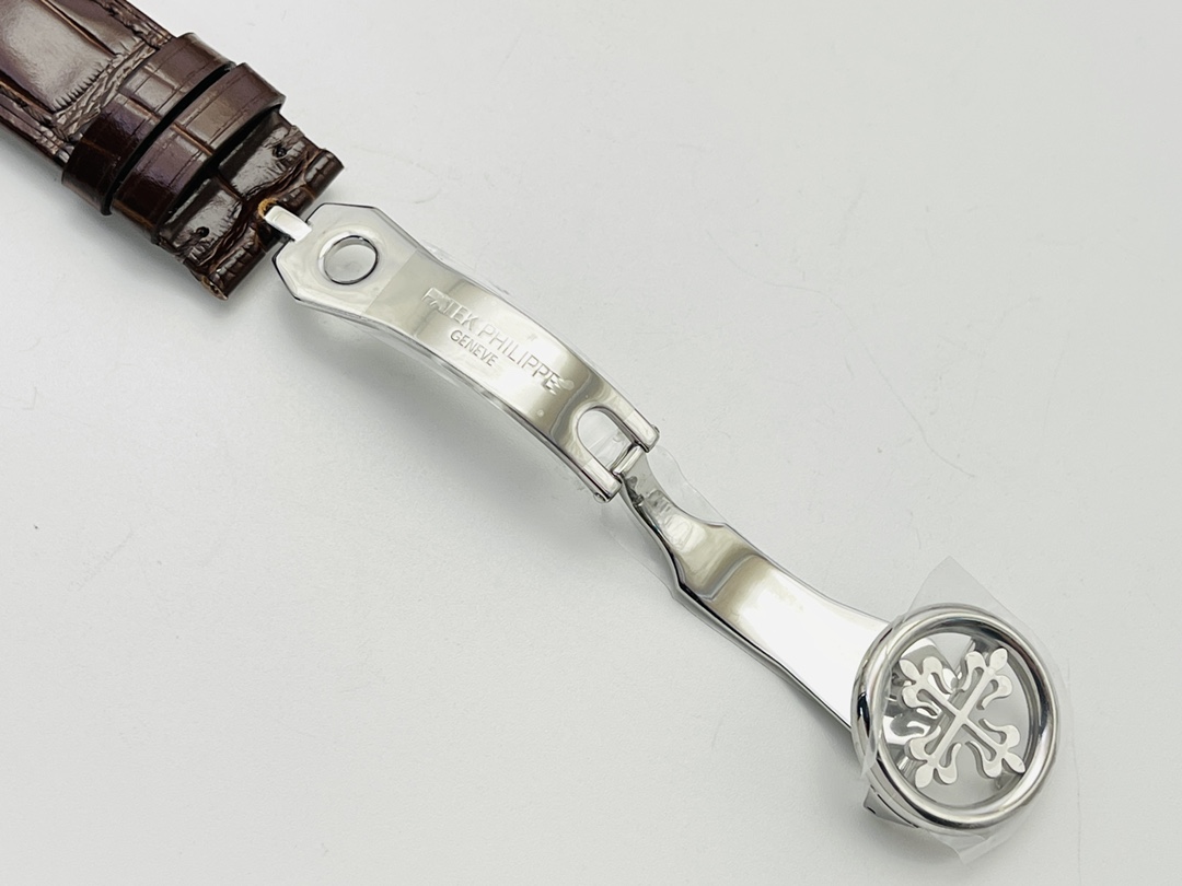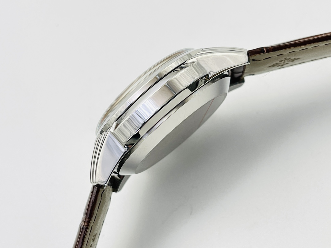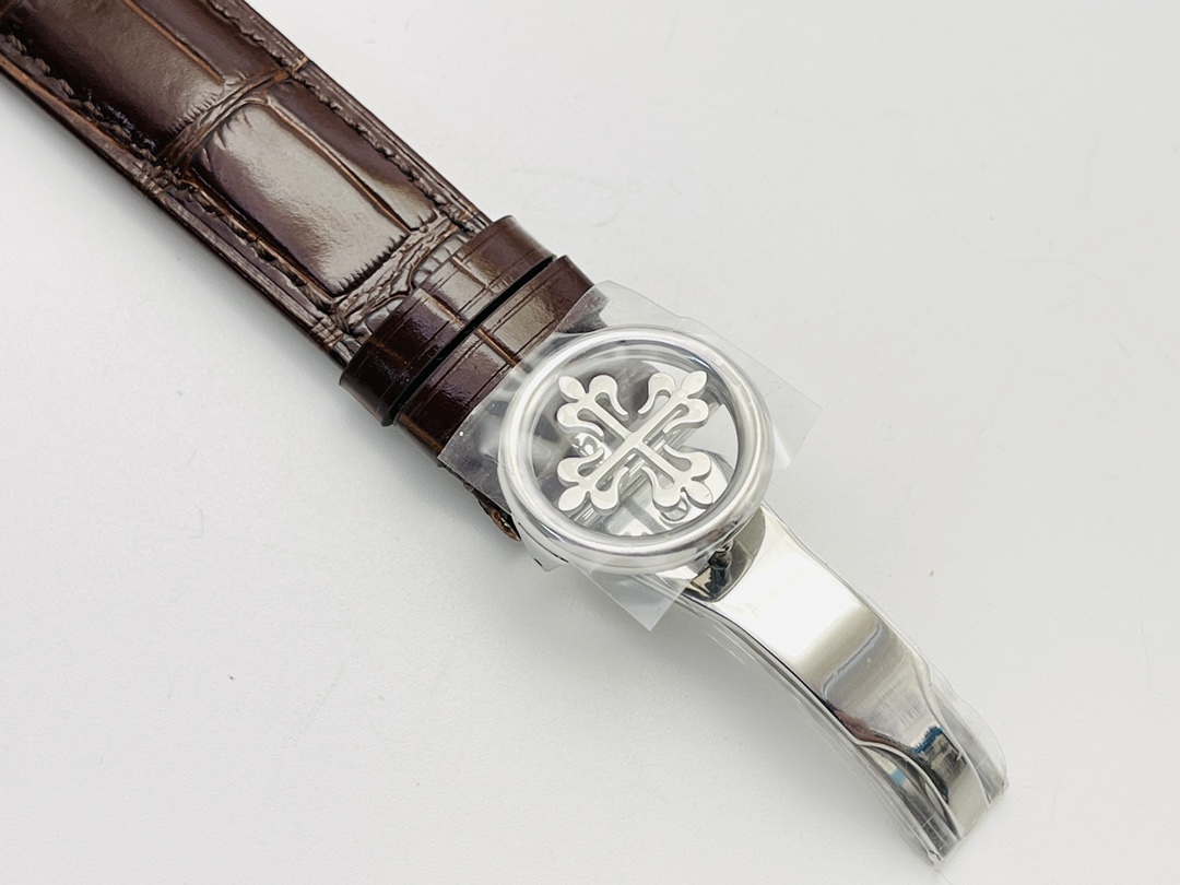 Das Gehäuse ist sorgfältig aus hochwertigem 904L Stahl gefertigt, mit markanten dreistufigen Bandanstößen, die einen einzigartigen, ergonomischen Bogen formen – von der Seite sichtbar für perfekten Fluss und Tragekomfort. Kombiniert mit einem luxuriösen italienischen braunen Kalbslederarmband, feine Textur, angenehm zu tragen.