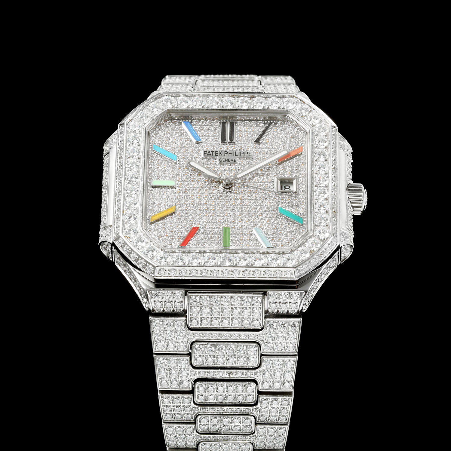 | Zifferblattfarbe | Diamantzifferblatt mit mehrfarbigen arabischen Ziffern |