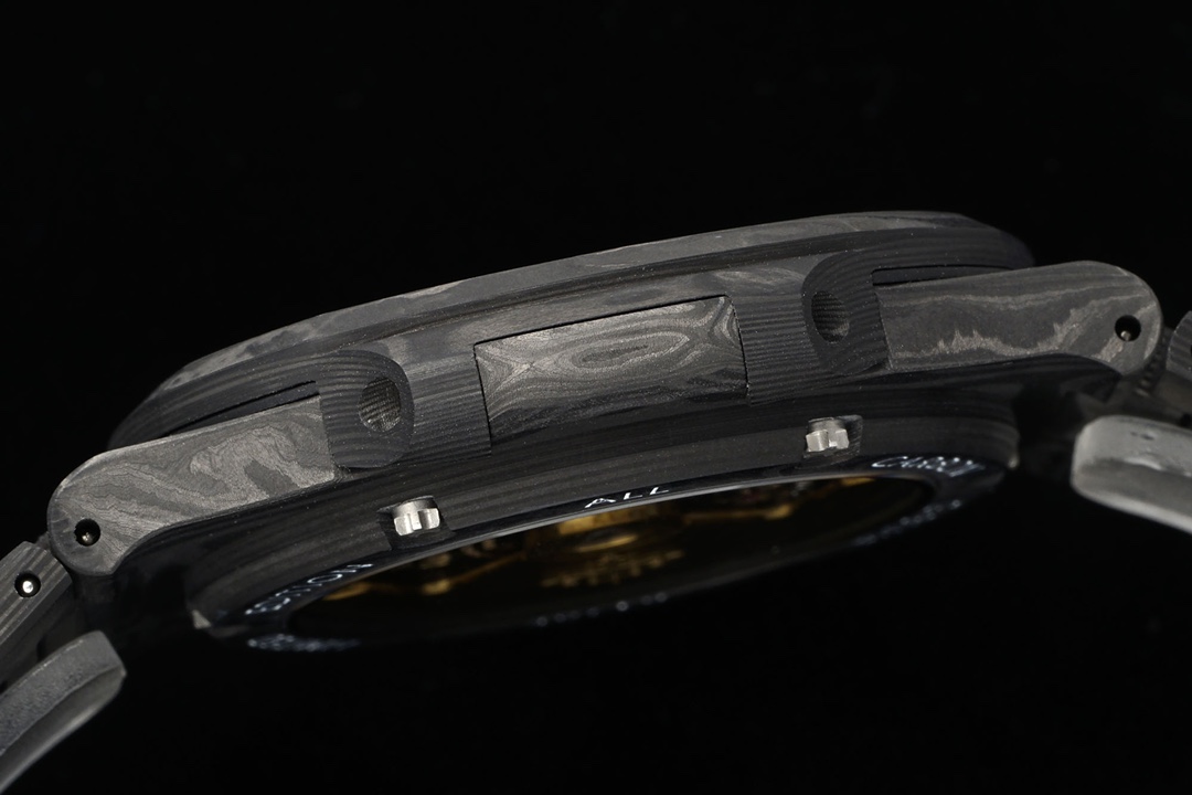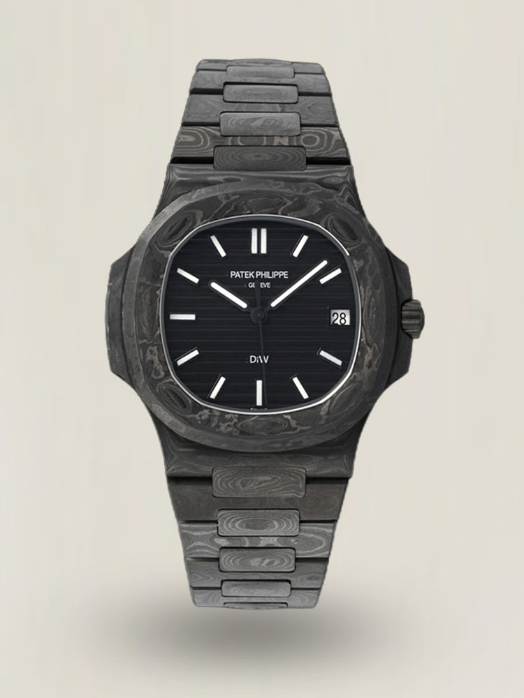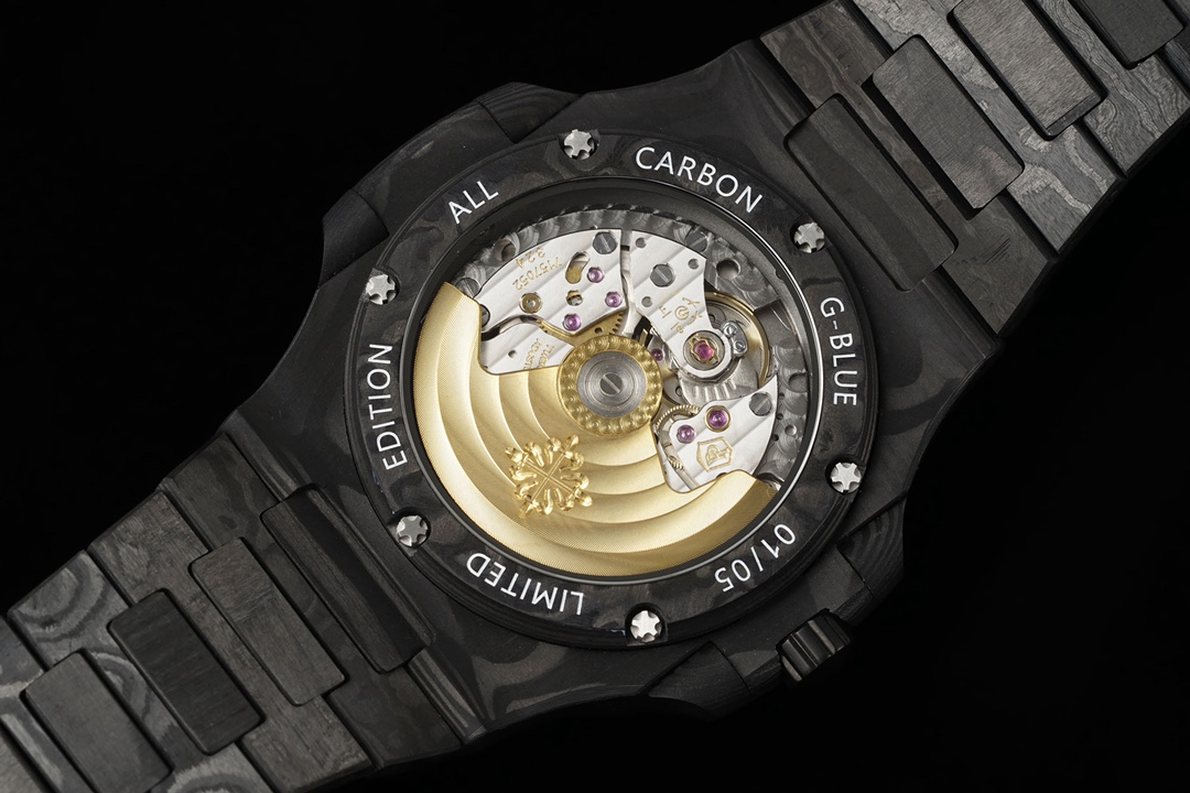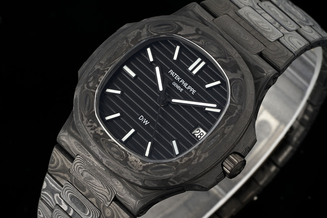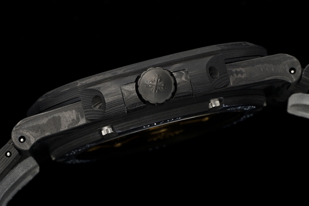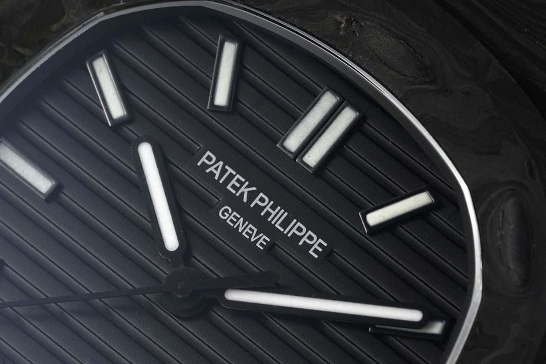 Die Uhr hat ein schwarzes Zifferblatt, das sauber und modern wirkt, während das Saphir- und Schweizer Material ihre Zuverlässigkeit und Tragbarkeit gewährleistet. Die Kohlefaser hat eine glatte Oberfläche, fast wie Keramik, bleibt dabei jedoch extrem leicht. Es sind nicht nur die äußeren Merkmale der Uhr, die sie besonders machen; die vollständige Kohlefaser-Version der Nautilus 5711 bietet ein völlig neues Trageerlebnis im Vergleich zur traditionellen Stahlversion.