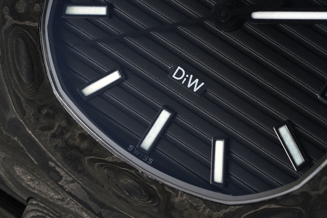Das Auffälligste an dieser Uhr ist das Kohlefaser-Material selbst, das eine strukturierte Optik aufweist, die je nach Lichtverhältnissen tiefe und helle Wirbelmuster zeigt und der Uhr eine schalenartige Maserung verleiht. Jede Uhr hat aufgrund der Beschaffenheit des Materials ein leicht unterschiedliches Erscheinungsbild. Besonders markant ist die Tatsache, dass keine zwei Uhren genau gleich aussehen, was Teil ihrer Einzigartigkeit und Anziehungskraft ist.