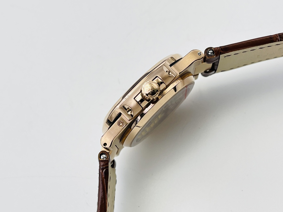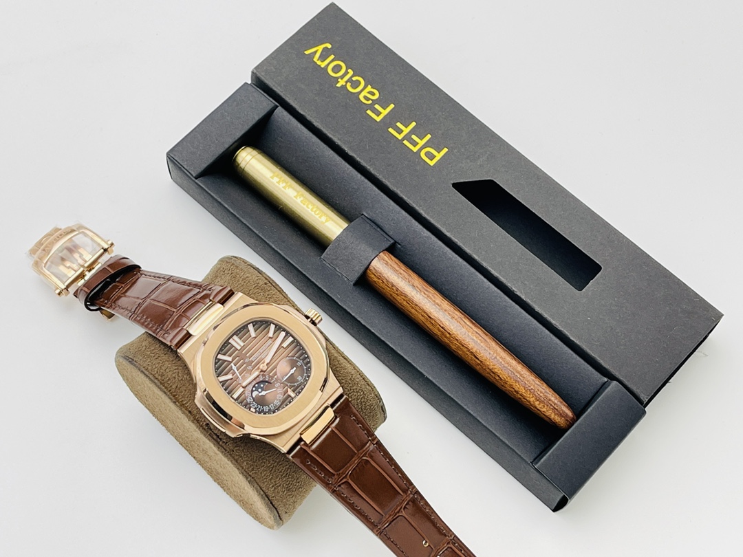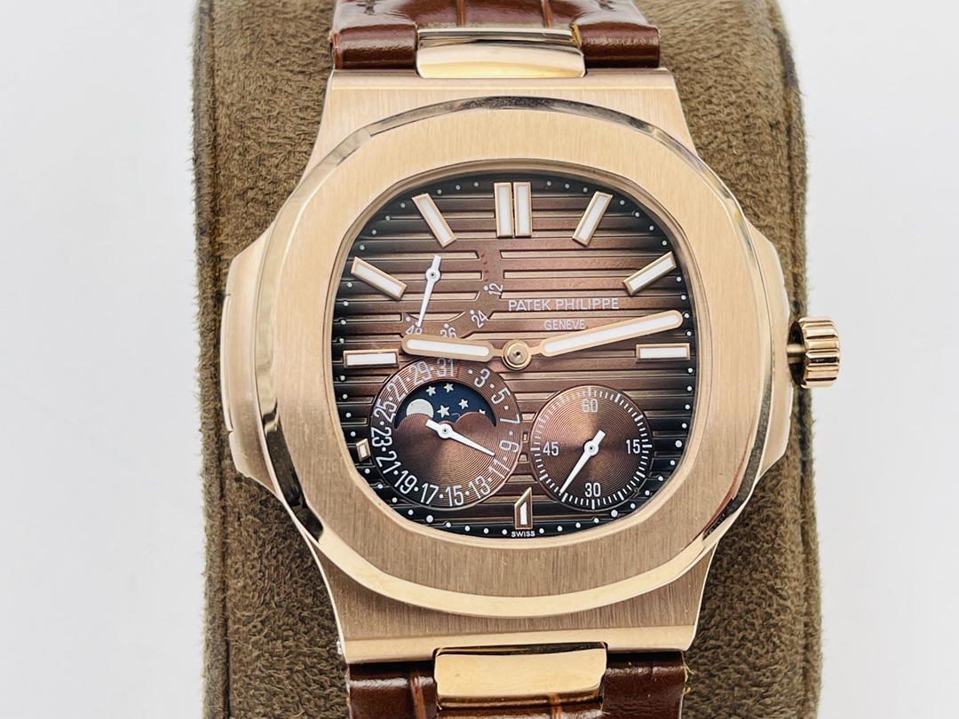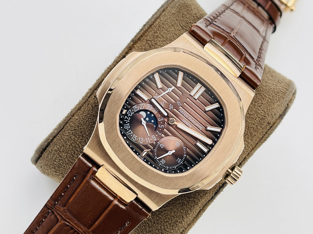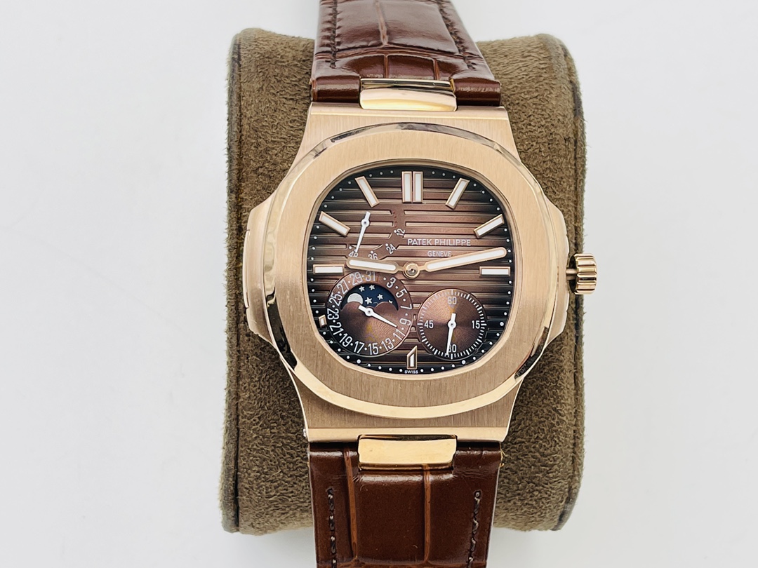 Gefertigt mit einem 40 mm Gehäuse aus 904L Edelstahl, das üppig mit Roségold beschichtet ist, hat es das traditionelle Nautilus Bullaugen-Design. Es ist mit kratzfestem Saphirglas bedeckt und bis zu 50 Meter wasserdicht. Es wird von einem hochwertigen, dunkelbraunen, matten Lederarmband begleitet. Es ist mit einem hochwertigen Schweizer Automatikwerk ausgestattet. Dies ist die beste Schweizer Super Clone Uhr, die das authentische Aussehen, Gefühl und die Haptik zu einem unschlagbaren Preis bietet.