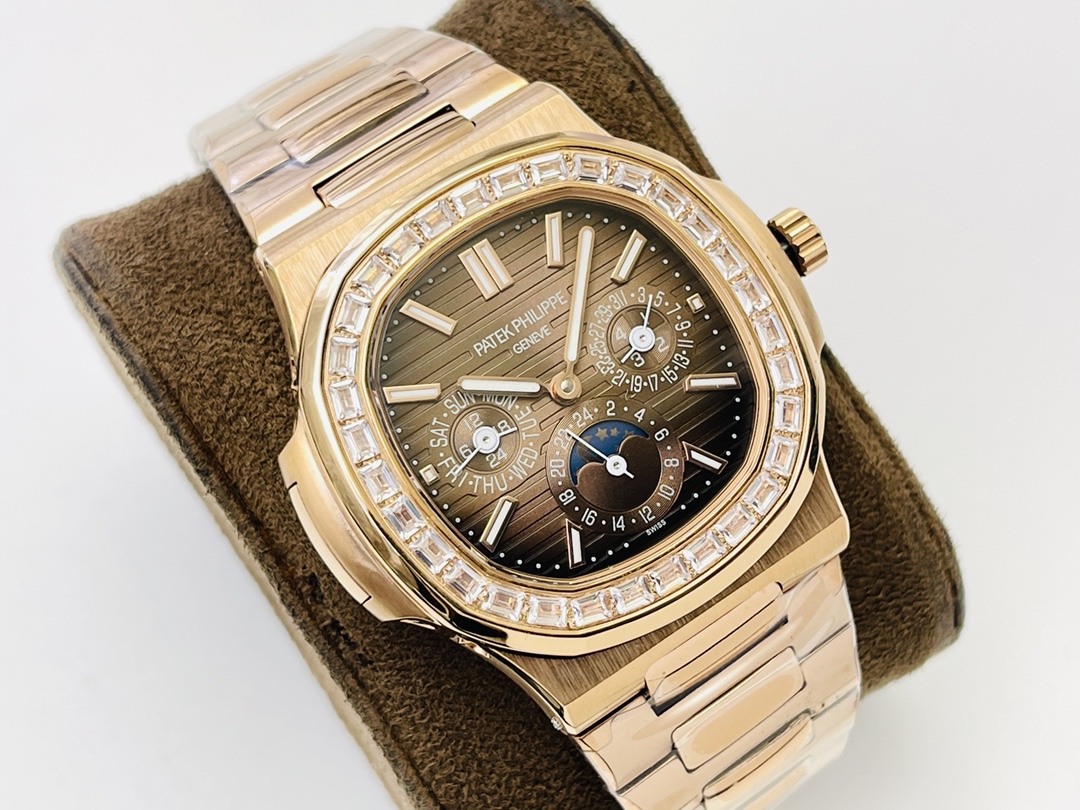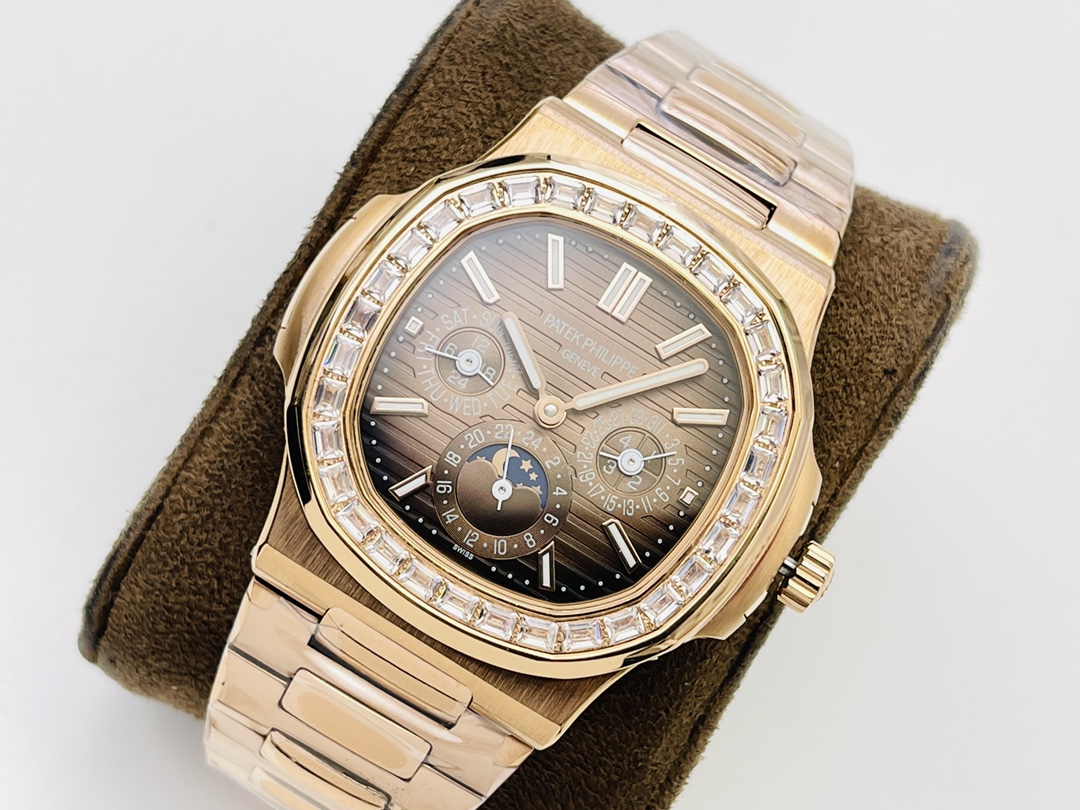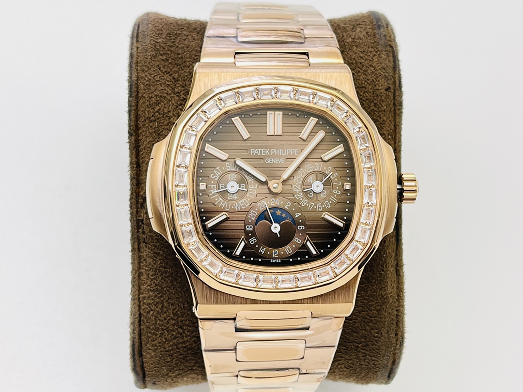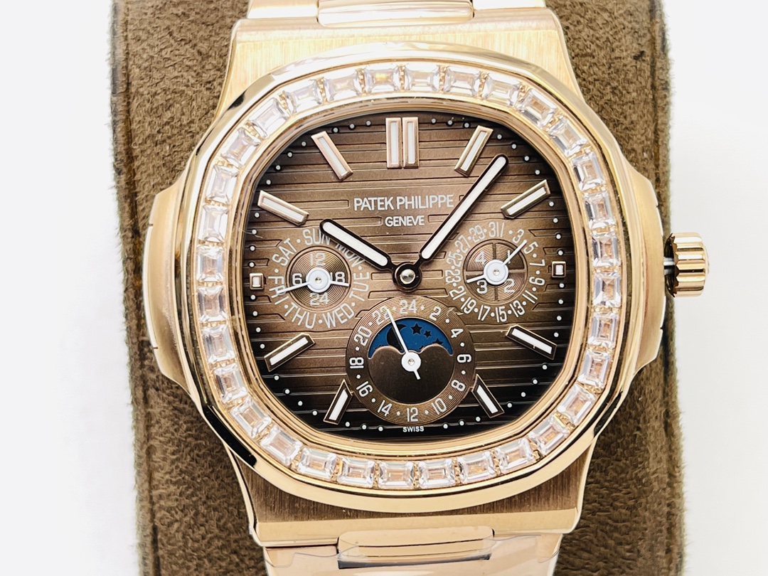 Dieses wunderschöne Stück zeitlicher Kunst ist in einem 40 mm Gehäuse untergebracht und verfügt über ein braunes, verlaufendes Zifferblatt, das dieser Uhr ein luxuriöses und elegantes Aussehen verleiht. Das Layout des Zifferblatts spiegelt wahrhaftig das legendäre Uhrmacherhandwerk von Patek Philippe wider, das komplizierte Zeitmesser herstellt. Der Tag befindet sich bei 9, der Monat bei 3, und die Kombination aus 24-Stunden-Anzeige und Mondphase ist bei 6. Dieses schöne Zeitmessgerät ist leicht abzulesen und verfügt über einen wunderschönen Unterzifferblatt für jede Komplikation. Dieses Luxuszeitstück wird von einem hochwertigen Nachbau des Kalibers 240 Automatik Schweizer Uhrwerks angetrieben, das in Bezug auf Funktionalität und Geschmeidigkeit eine perfekte Nachbildung des ultradünnen Mikrorotors darstellt. Dieses Zeitmessgerät kommt in einem roségoldbeschichteten Edelstahlgehäuse mit einer Lünette, die mit wunderschönen Baguette-Diamanten besetzt ist.