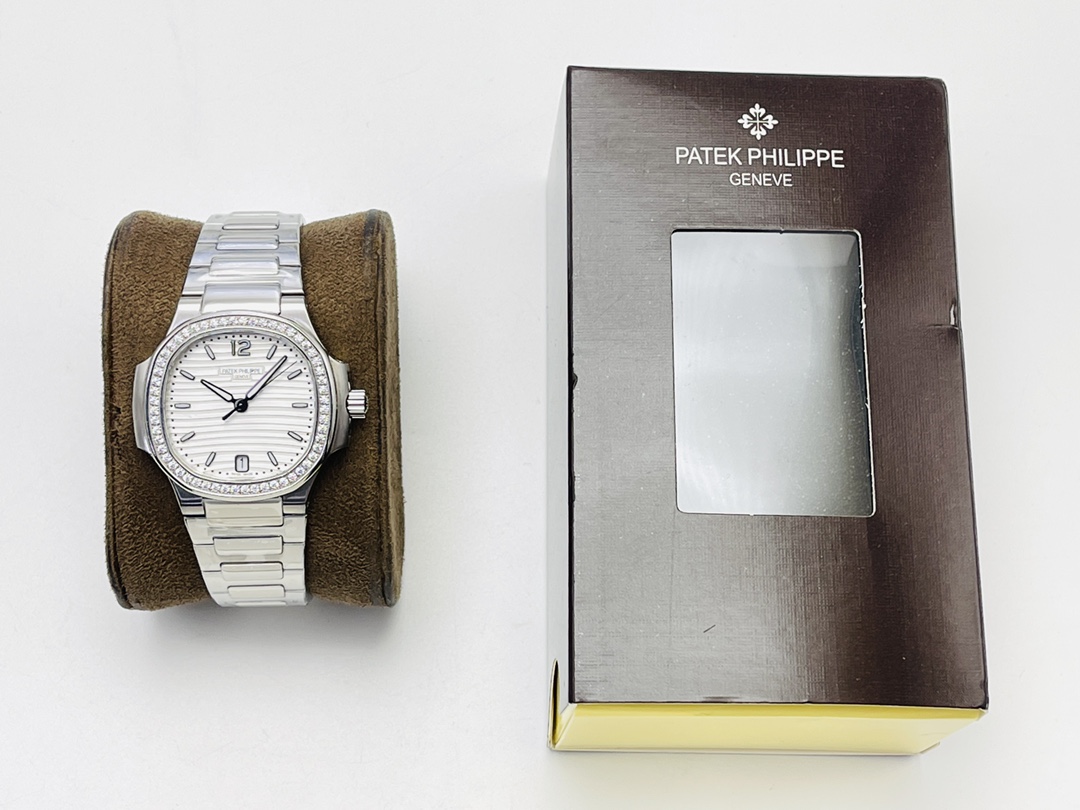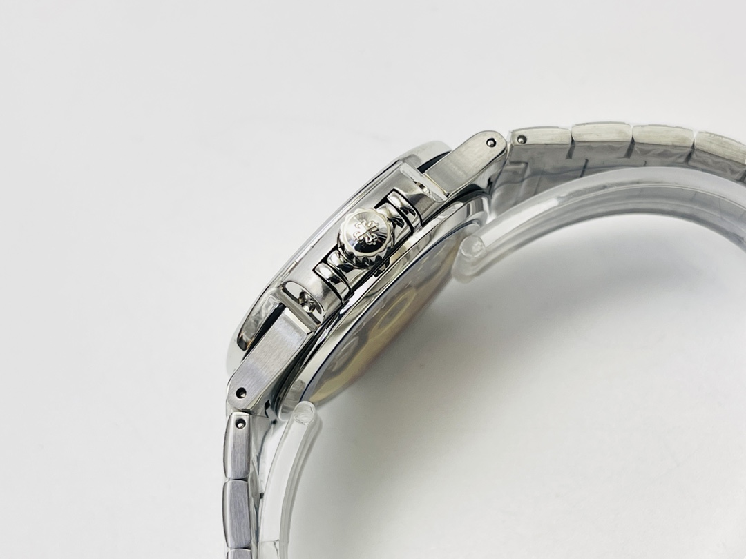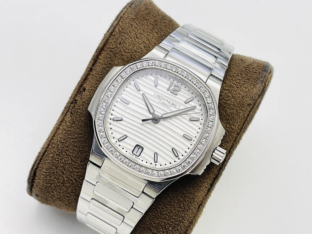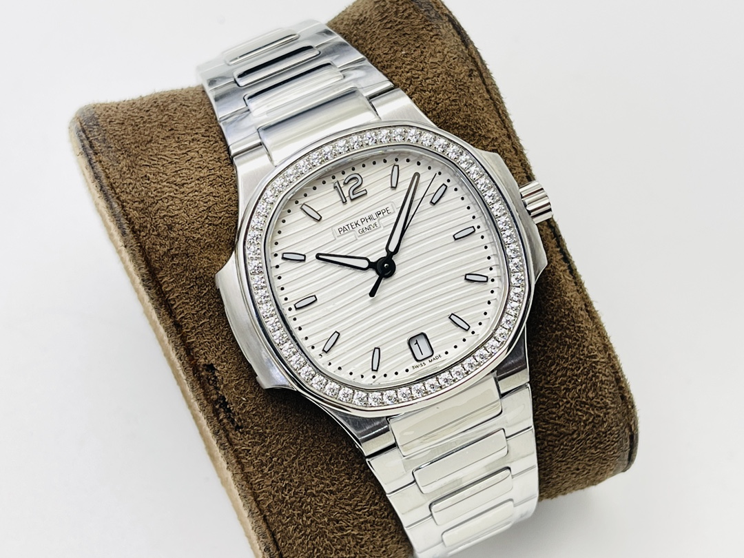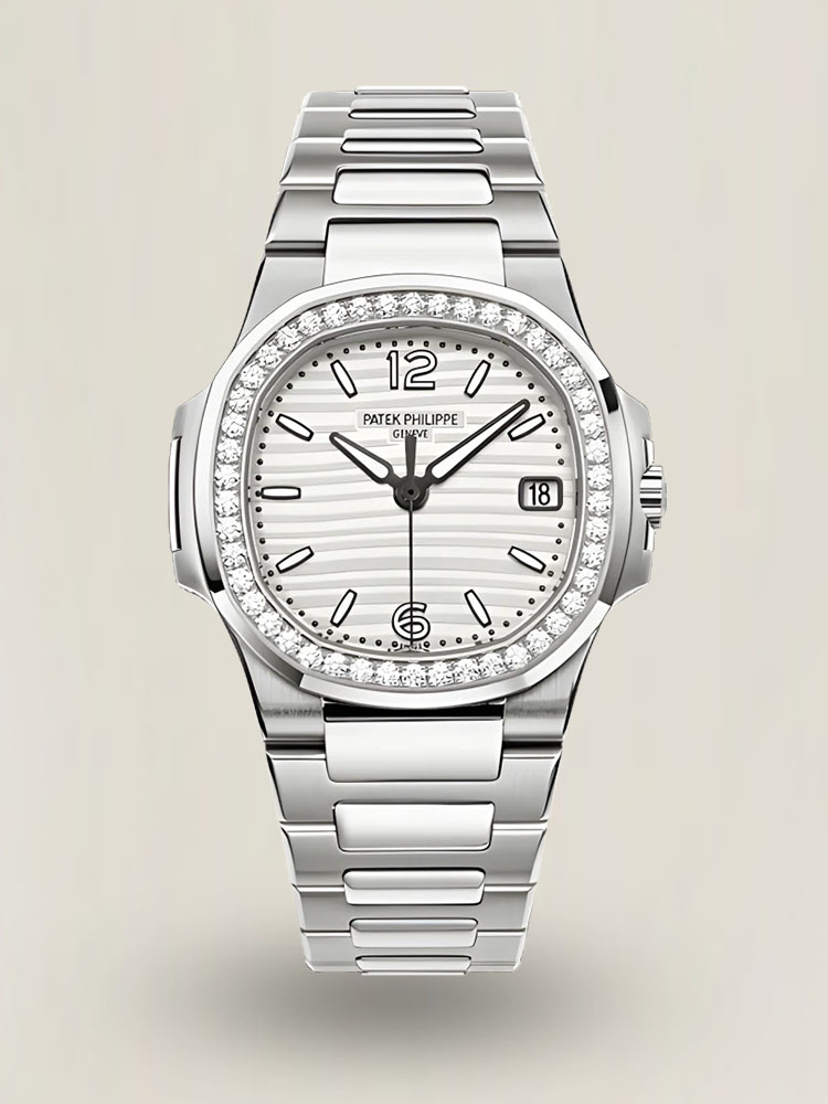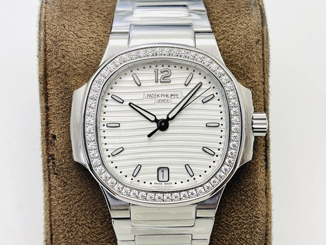 Sie besitzt eine Lünette, die mit 56 funkelnden Diamanten besetzt ist, die insgesamt etwa 0,67 Karat wiegen, wie im Originalmodell, und besteht aus hochwertigem 904L-Edelstahl für ihr Gehäuse und Armband, um optimale Haltbarkeit und den ikonischen Nautilus-Glanz zu gewährleisten. Sie verfügt über ein maßgeschneidertes, hochwertiges Schweizer 9015-Uhrwerk mit Modifikationen zum 324SC-Uhrwerk für optimale Leistung und Genauigkeit mit einer Gangreserve von 45 Stunden und 28.800 vph. Mit einer Wasserdichtigkeit von 50 Metern.