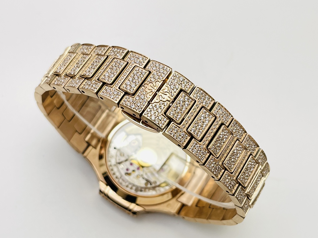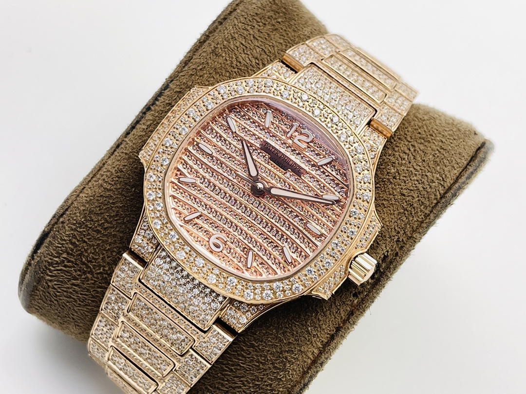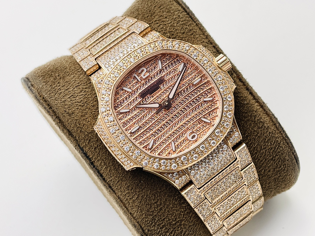 Explore the stunning Super Clone Patek Philippe Nautilus 7118/1450R-001 Ladies "Full Diamond" – the epitome of a Haute Joaillerie timepiece. This luxurious ladies' 35.2mm rose gold timepiece is entirely covered with over 2,500 brilliant cut diamonds, utilizing the rare and intricate "snowflake setting" (irregular pavé) method, giving off an irresistible dazzle and shine.