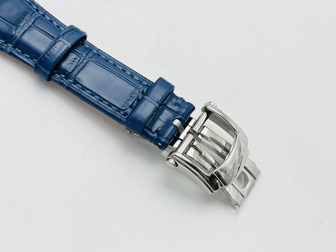 Das Zeitmessgerät ist mit einem klassischen blauen opalinen Zifferblatt gestaltet, das mit klassischer horizontaler Wellenprägung versehen ist, was dem Zeitmesser Tiefe und Textur verleiht. Die Lünette ist mit 56 präzise geschliffenen Kristallen dekoriert, die der Originalversion des Zeitmessers entsprechen.