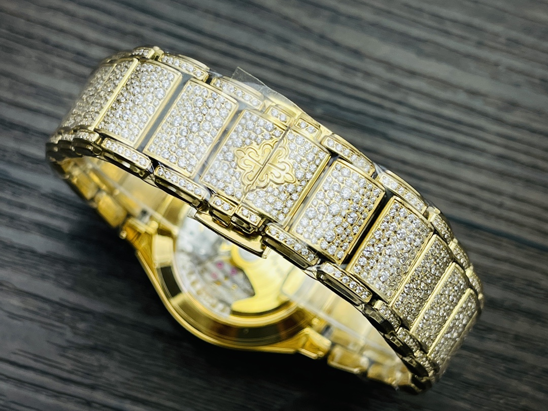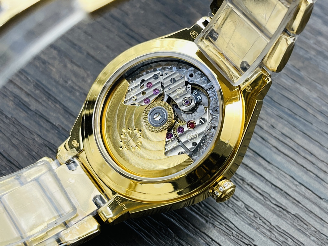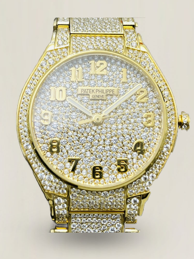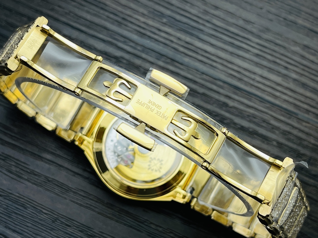 Das aus 316L poliertem Stahl und Roségold gefertigte Armband ist präzise mit 2.490 Diamanten besetzt und fügt sich nahtlos in das Gehäuse ein. Die patentierte Faltschließe bietet Sicherheit und Komfort. Das kratzfeste Saphirglas und die Wasserdichtigkeit bis 50 Meter machen diese luxuriöse Patek Philippe-Replik zu einer idealen Verbindung von Luxus und Funktionalität. Erhöhen Sie Ihre Sammlung mit dieser besten Schweizer Patek Philippe Twenty~4 – Form und Funktion in perfekter Harmonie.