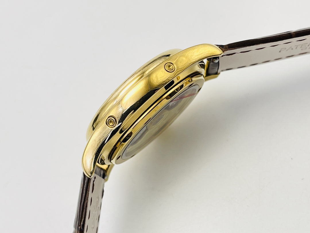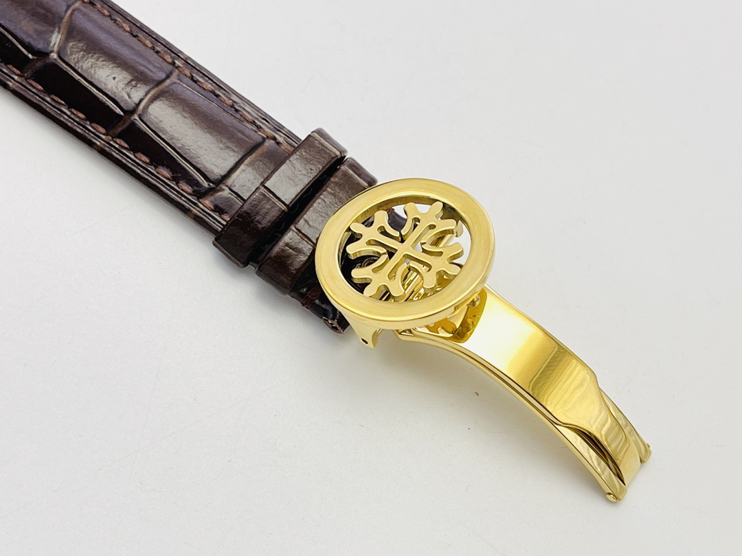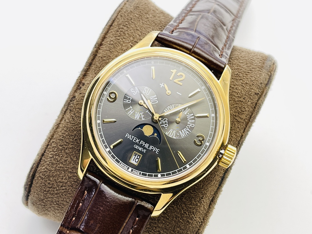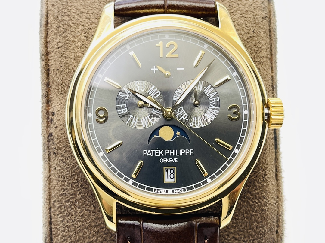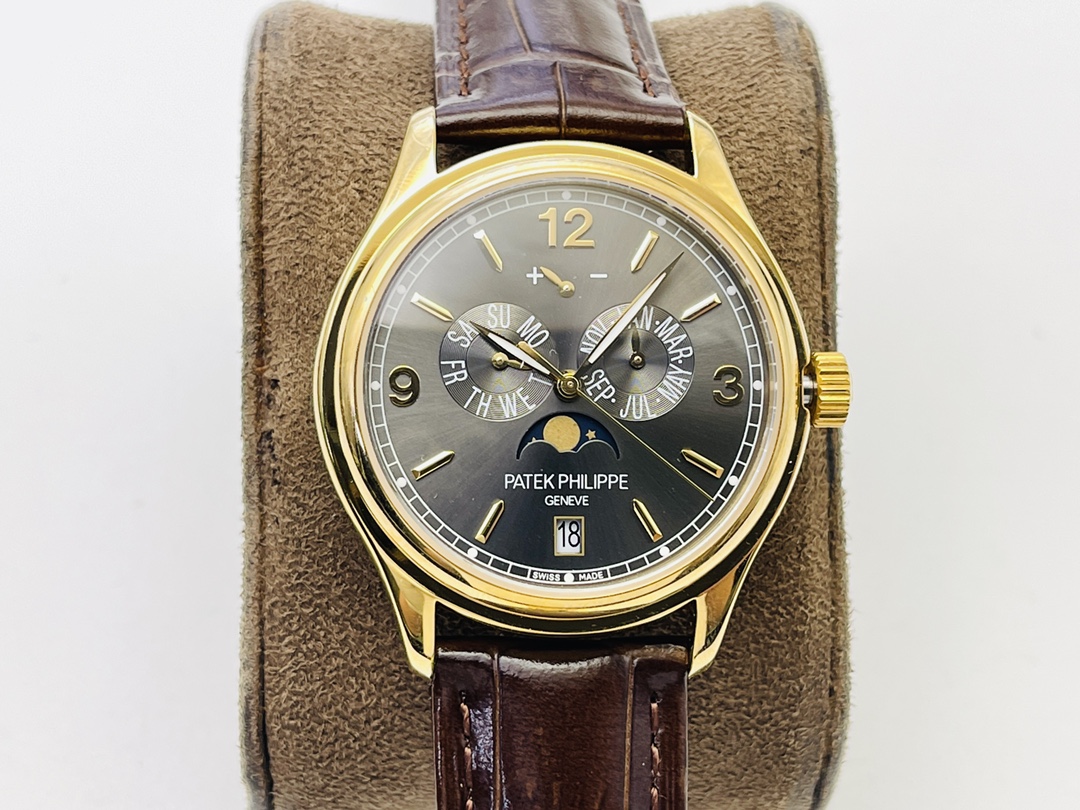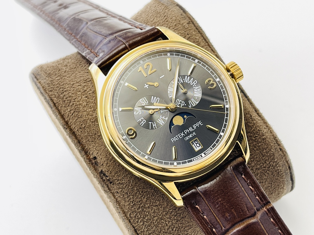 Genießen Sie die Eleganz der Patek Philippe 5146J-010 Super Clone, ein Meisterwerk, das einzigartig für Sammler geschaffen wurde, die Präzision und Eleganz schätzen. Das 39 mm Gehäuse verfügt über ein atemberaubendes schiefergraues Zifferblatt, das Funktionalität mit einem hohen Stilbewusstsein verbindet. Angetrieben von dem Schweizer Automatikwerk Cal.324, steuert es den Jahreskalender, das Datum, den Monat und die Mondphasenanzeige, um eine präzise Zeitmessung zu gewährleisten. Umhüllt von elegantem Roségold, kombiniert mit einem braunen Lederarmband, strahlt es zeitlose Raffinesse aus. Mit Saphirglas und einer Wasserdichtigkeit von 50 m ist diese AAA-Qualitätsreplik ein Meisterwerk. Ein Juwel der Uhrmacherkunst, das es zu entdecken gilt – ergreifen Sie Ihren Moment, um es zu besitzen.