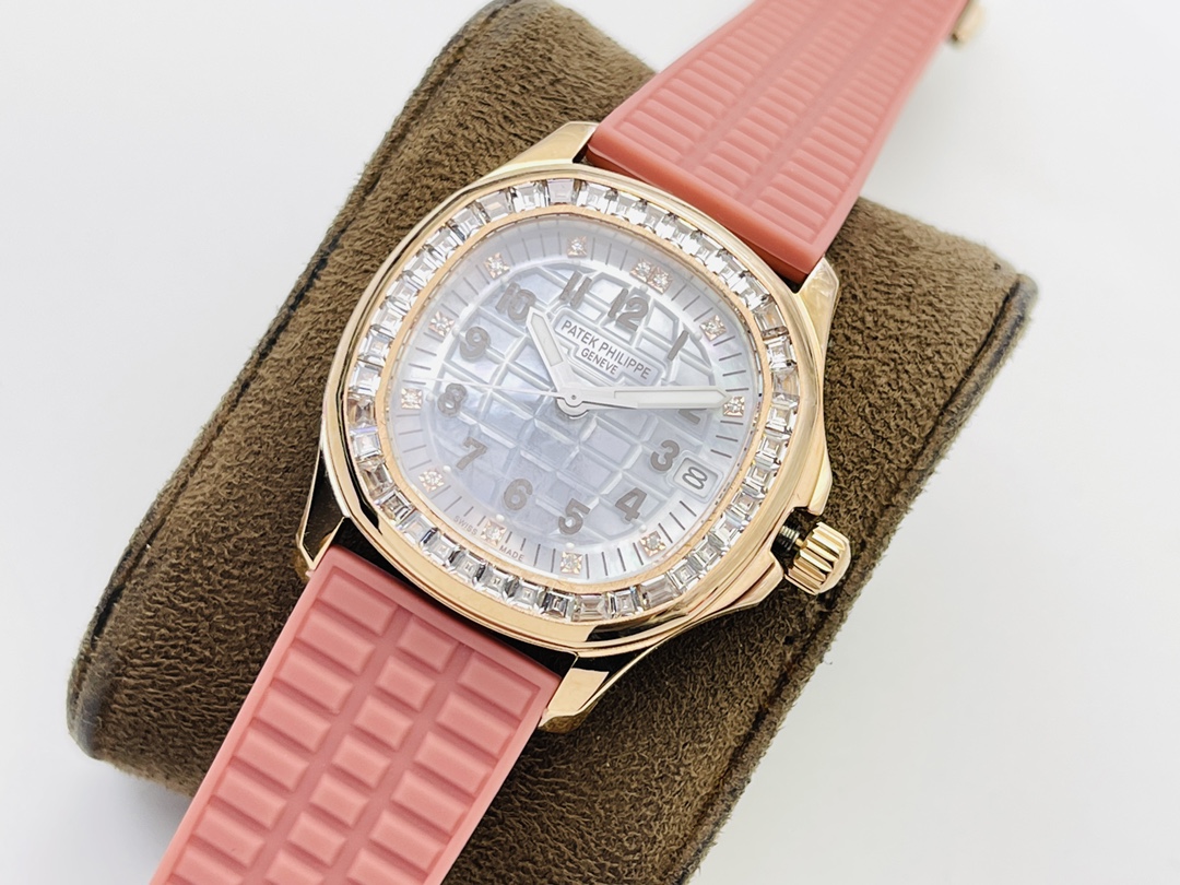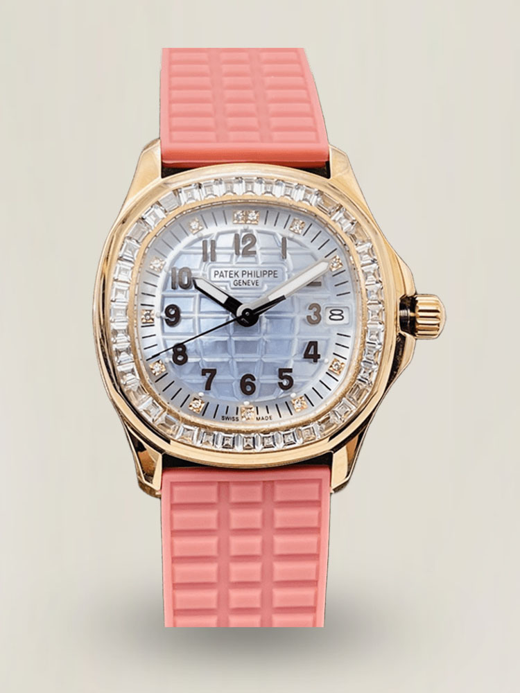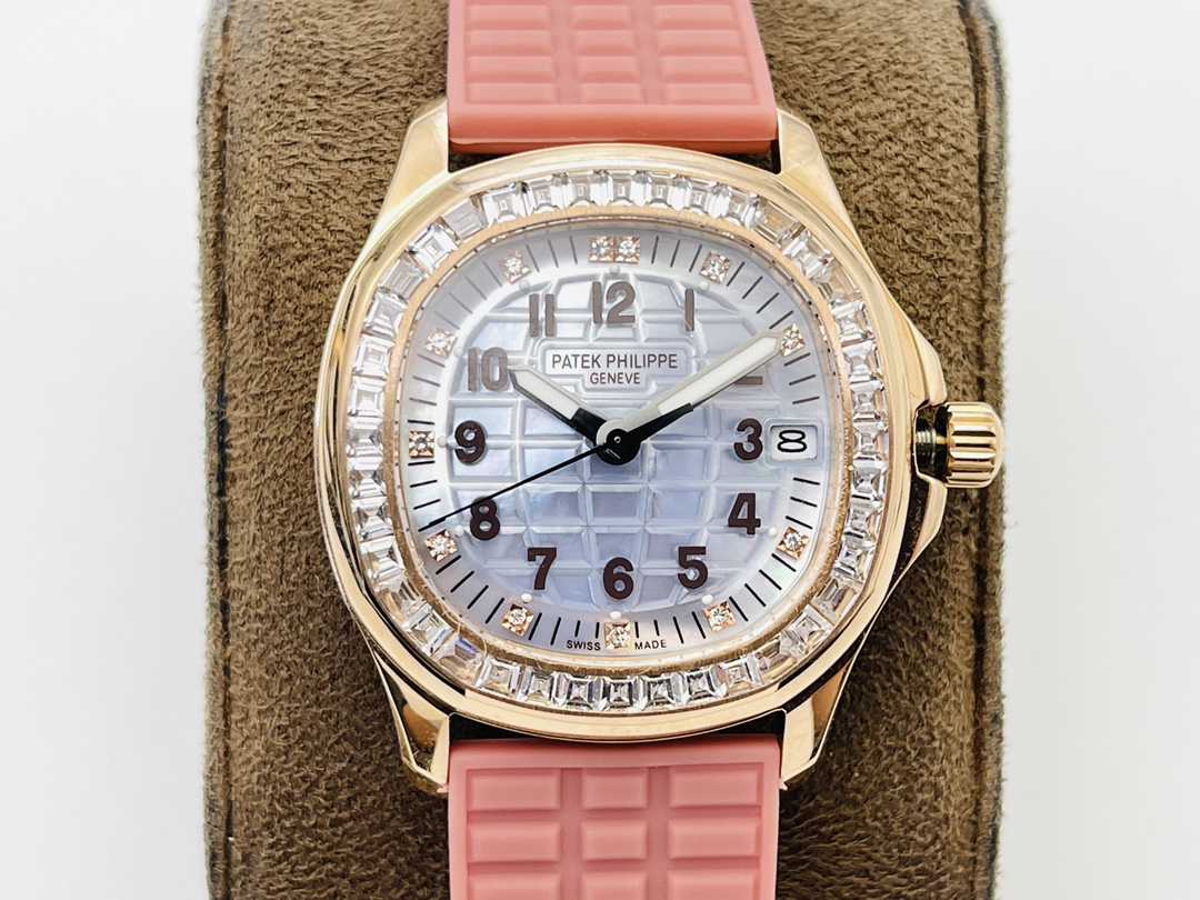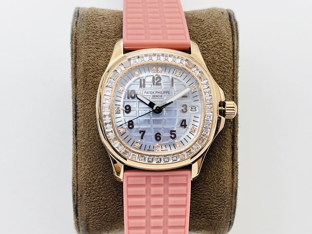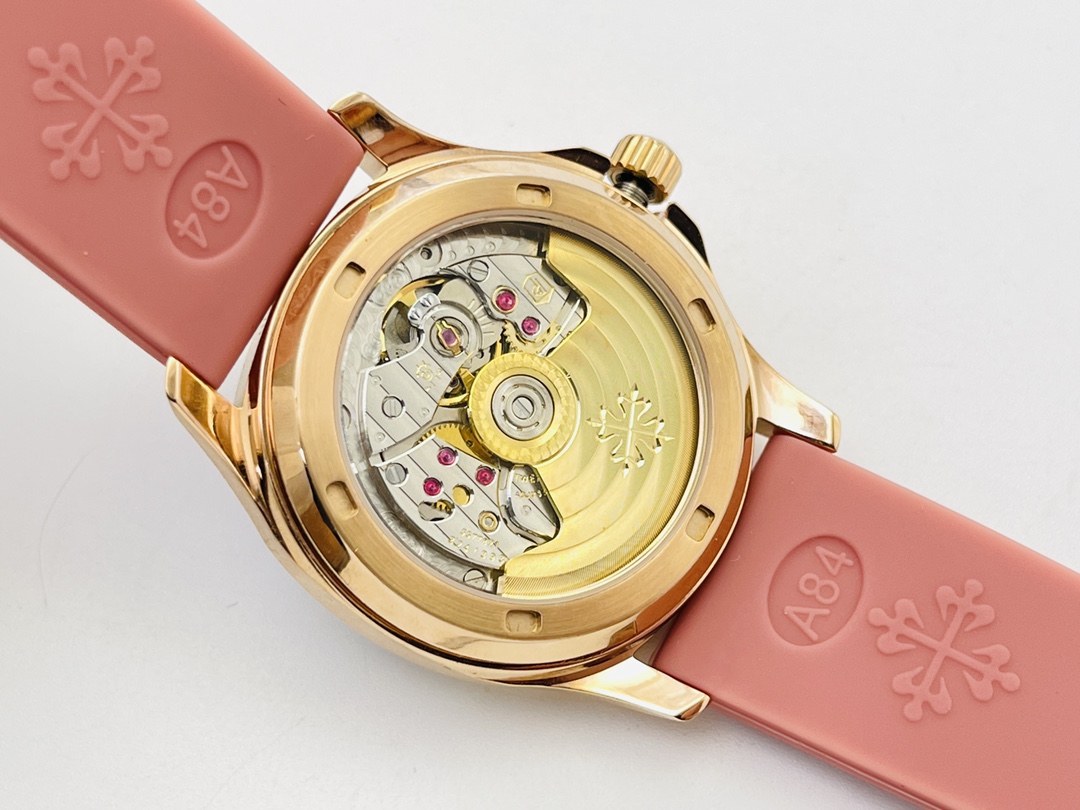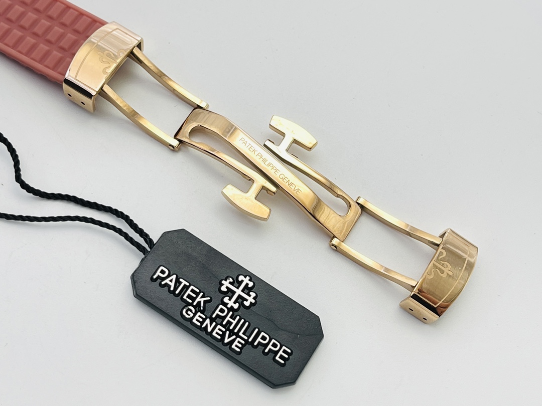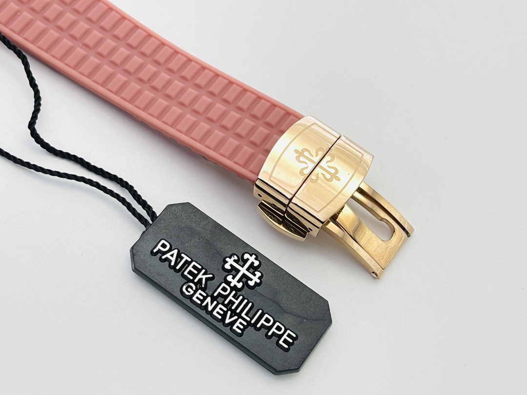 Ein pinkfarbener Gummiband vervollständigt das Design des Zeitmessers, indem es das gitterartige Muster des Zifferblatts widerspiegelt und so ein durchgängiges sportliches Erscheinungsbild schafft. Die klassische Faltschließe zeichnet sich durch einen feinen Glanz aus, mit der englischen Gravur von Patek Philippe im Inneren, die auch bei Betrachtung durch eine Lupe makellose Details bewahrt. Aktive Frauen, die einen verfeinerten Geschmack schätzen, werden diese Super-Klon-Aquanaut als ideal empfinden, da sie Schönheit mit Funktionalität durch ihr Schweizer Uhrwerk und eine Wasserdichtigkeit von 50 Metern kombiniert.