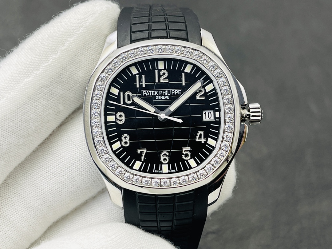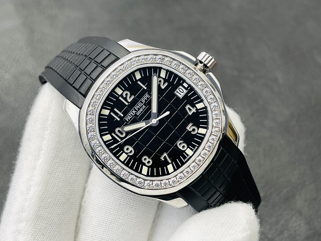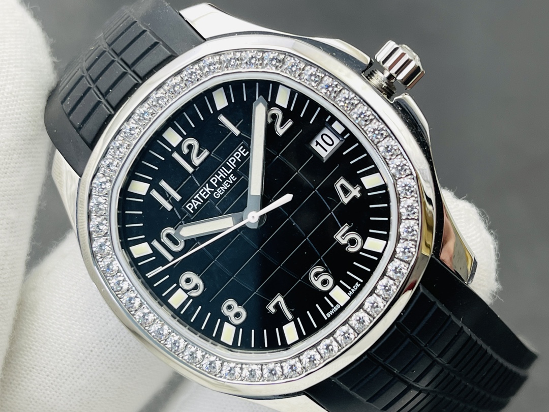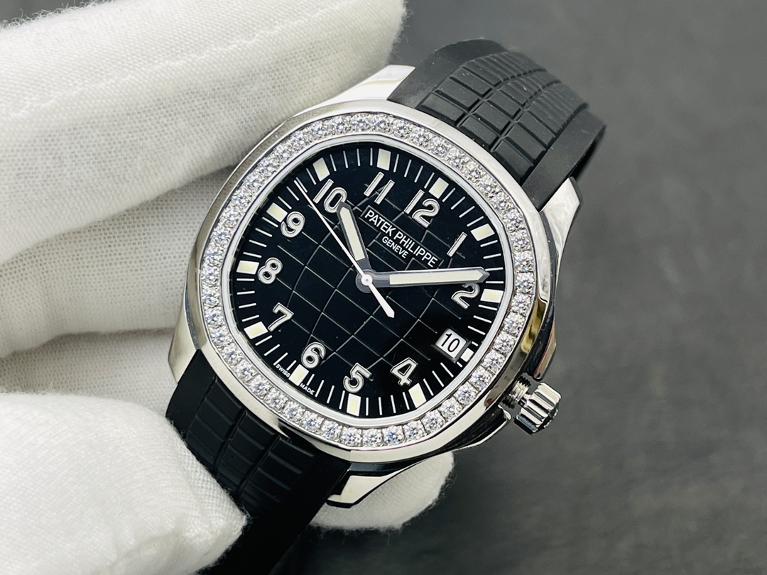 Werfen wir einen Blick auf unsere exklusive Super Clone-Version der Patek Philippe Aquanaut Luce 5267/200A-001, wo sportlicher Chic auf opulenten Luxus in dieser ikonischen "Handgranate"-Uhr trifft. Dieses atemberaubende Zeitmesser verfügt über ein perfekt proportioniertes 40 mm Gehäuse aus 904L Edelstahl, das modernen Stil mit Komfort und Robustheit für den täglichen Gebrauch vereint. Das mutige schwarze, geprägte Zifferblatt hat den ikonischen tropischen Look der Aquanaut, begleitet von üppigen arabischen Ziffern als Stundenmarkierungen, die klassischen Stil schaffen. Die Lünette ist mit 48 funkelnden Diamanten besetzt, ähnlich dem Glanz und der Präzision des Originals.