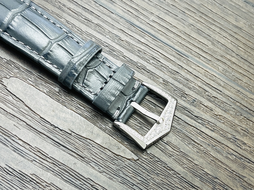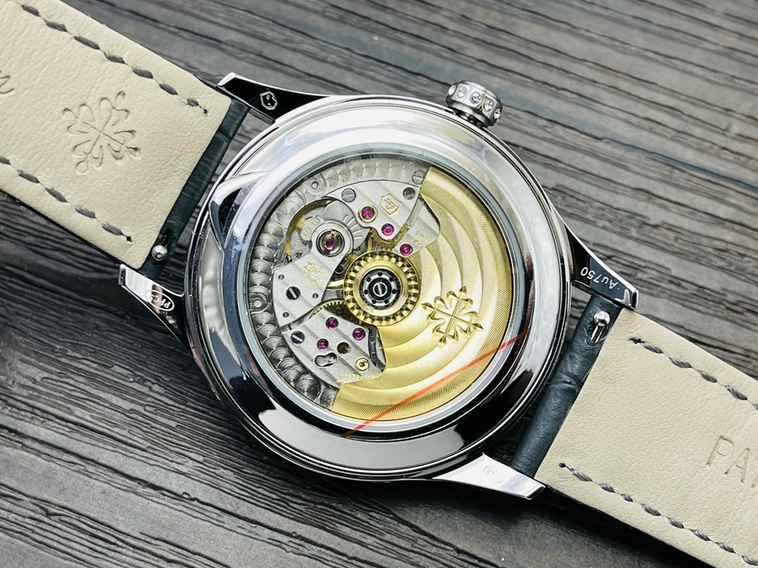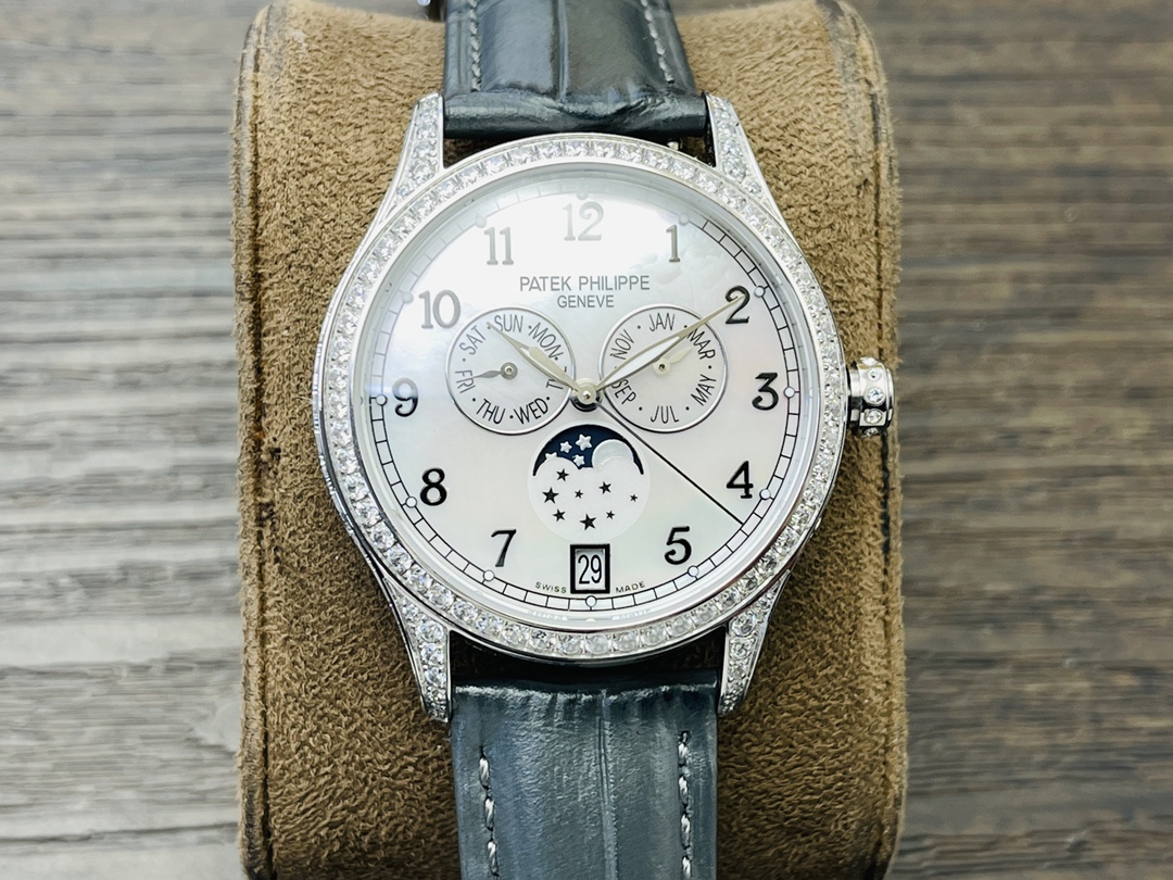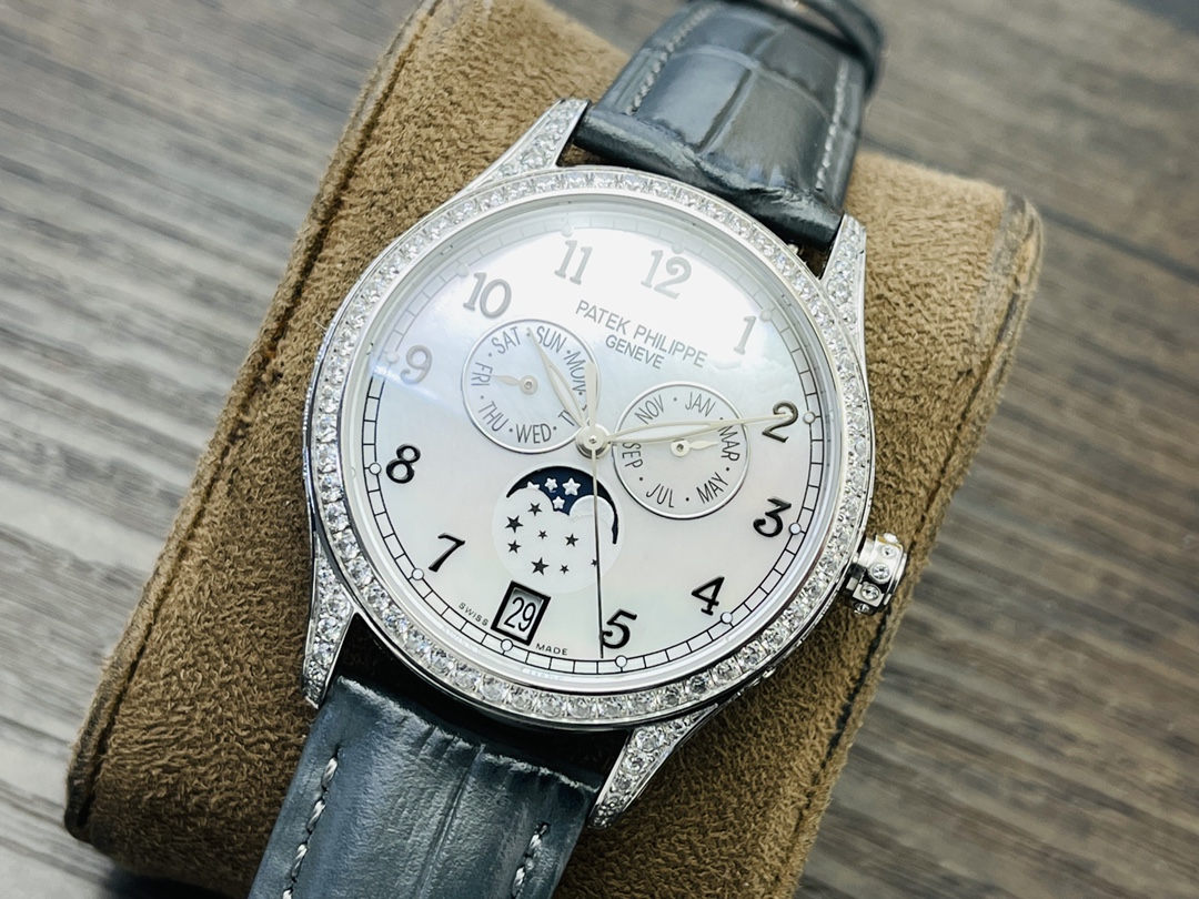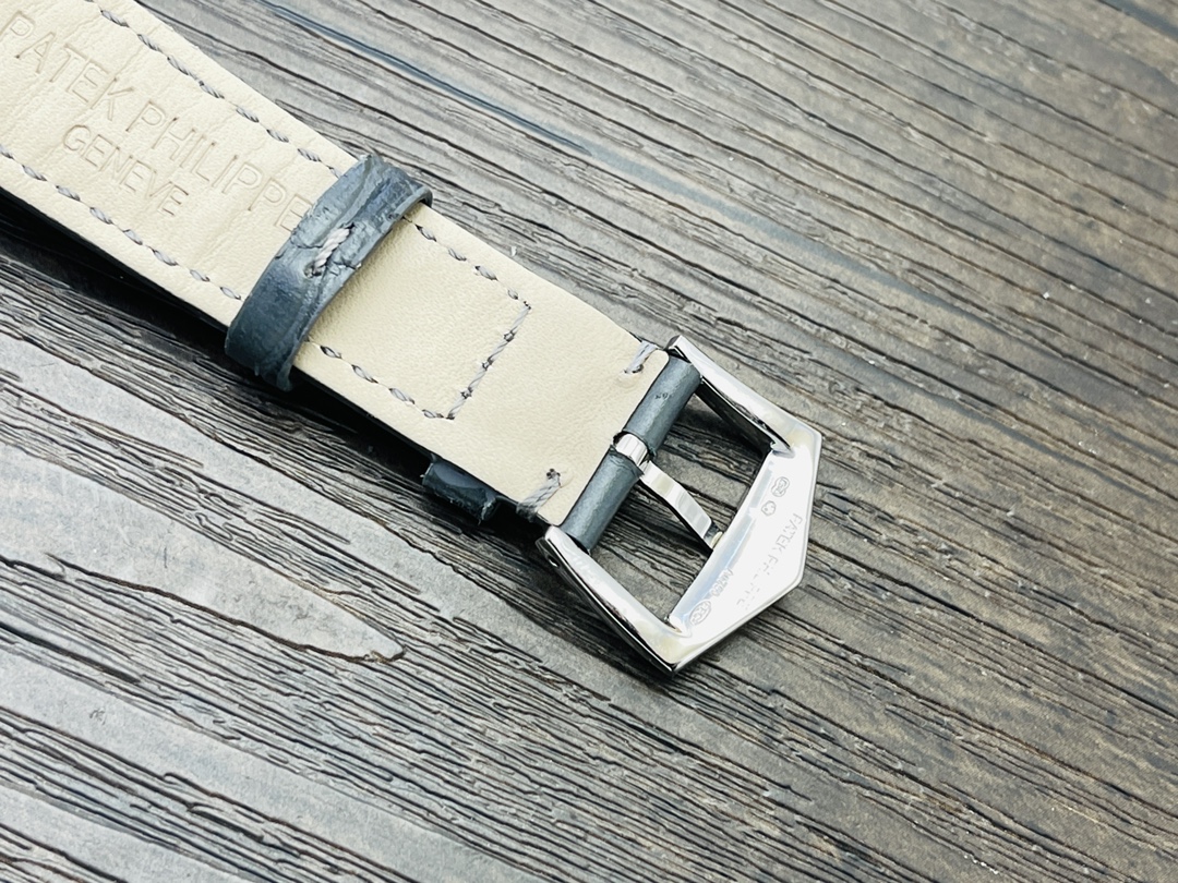 Die Mondphasenkomplikation befindet sich auf der 6-Uhr-Position der Uhr und verleiht ihr eine himmlische Schönheit. Die goldenen arabischen Ziffern und die goldenen Zeiger auf dem Zifferblatt sorgen zudem für einen glamourösen Look, der eine einfache und klare Zeitdarstellung ermöglicht. Das Patek Philippe 324S QA LU Automatikwerk stellt sicher, dass die Uhr korrekt funktioniert, und bietet eine Wasserdichtigkeit von 50 Metern. Abgerundet wird das elegante Erscheinungsbild durch ein hellgraues Lederarmband mit handgenähten Details, wodurch die Uhr zu einem praktischen Gadget und einem kostbaren Schmuckstück wird.
