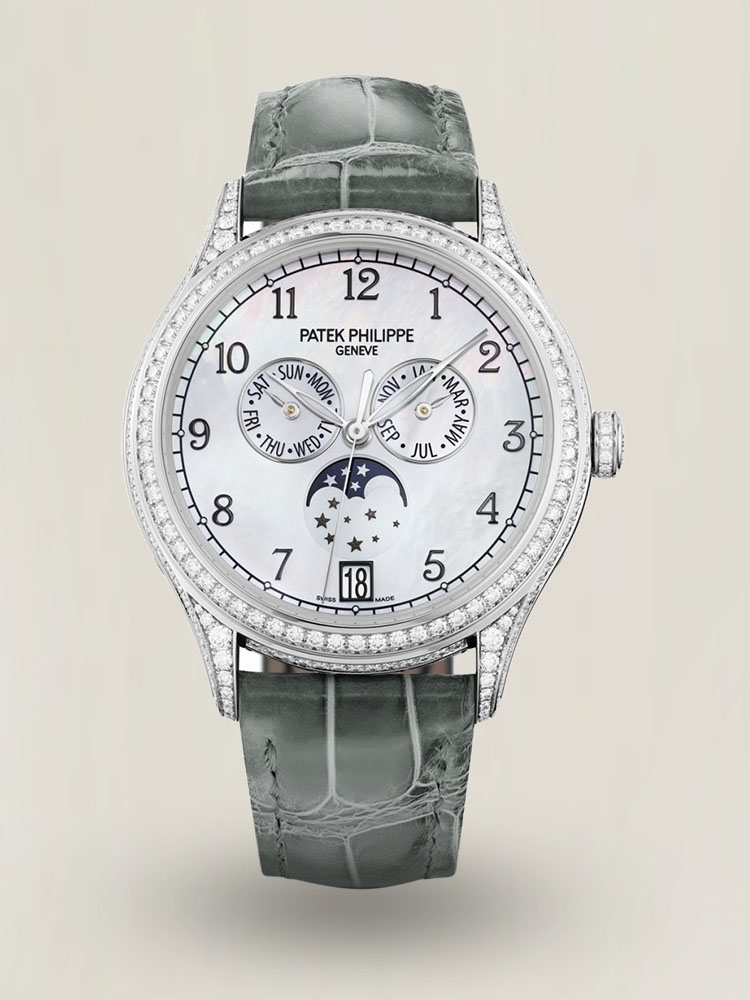 Die Patek Philippe Complications 4948G-010 Jahreskalender-Mondphase ist ein Kunstwerk, das luxuriöses Aussehen mit Praktikabilität verbindet. Die 38 mm große Uhr verfügt über ein exquisit poliertes Gehäuse aus Weißgold mit Diamantbesatz und einem Zifferblatt aus Perlmutt. Das Jahreskaliber zeigt Tag, Datum und Monat an und muss nur einmal im Jahr zurückgesetzt werden, was einen beispiellosen Komfort bietet.