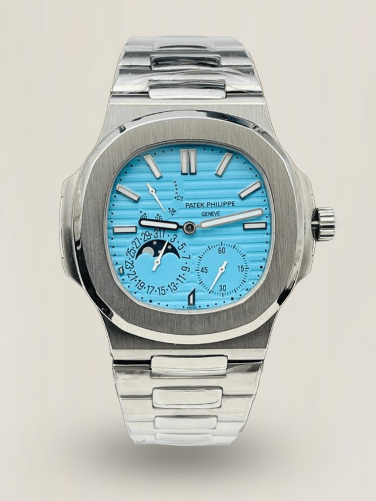 Die Replica Patek Philippe Nautilus 5712GR ist in einem 40 mm Gehäuse und Armband aus Edelstahl gefertigt. Die Uhr verfügt über ein wunderschönes blaues Sonnenschliff-Zifferblatt mit reliefartigen horizontalen Motiven und goldenen, glänzenden, leuchtenden Stundenmarkierungen, die ihr elegantes Erscheinungsbild unterstreichen. Mit einem Schweizer Automatikwerk bietet sie eine konstante Leistung und eine Wasserdichtigkeit von 50 Metern. Das Saphirglas garantiert Reinheit und Langlebigkeit, perfekt, um Stil und Funktionalität für jeden Anlass zu verkörpern.