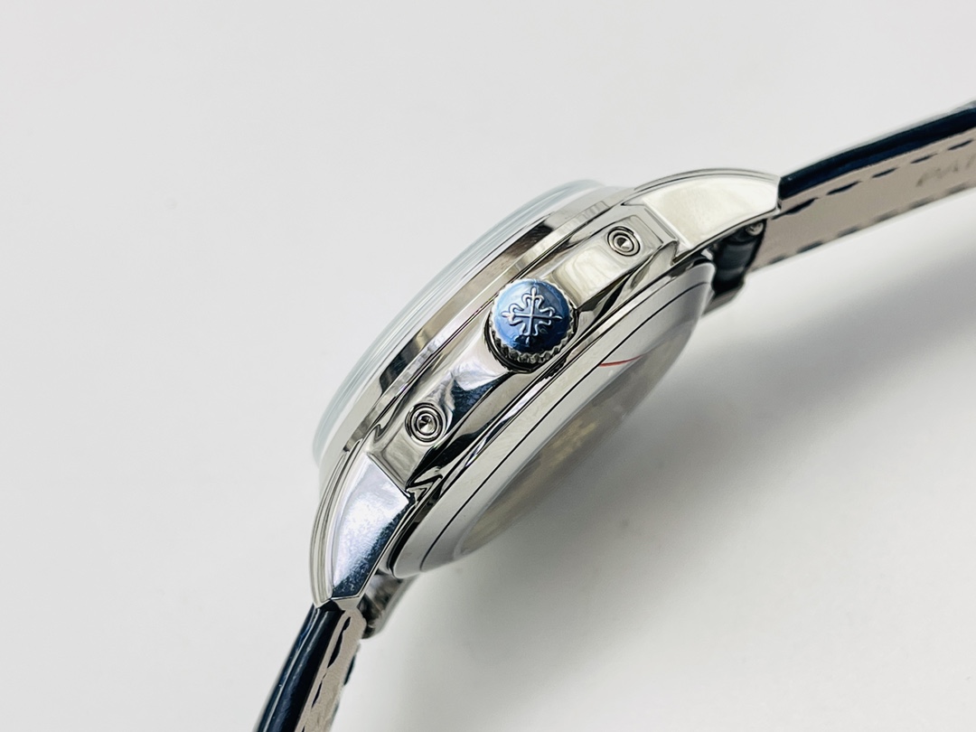 Die Patek Philippe Grand Complications 5320G-001 Replica ist ein Werk zeitloser und technologischer Eleganz. Die Uhr kommt in einem schlanken Gehäuse aus Edelstahl mit einem Durchmesser von 40 mm. Das Zifferblatt strahlt in einem hellblauen Farbton, unterstrichen von arabischen Ziffern und erhabenen Cabochon-Indizes, die zusätzliche Raffinesse und Eleganz verleihen. Die flügelförmigen Stunden- und Minutenzeiger mit verlängerten Spitzen ermöglichen eine klare Ablesbarkeit der Zeit.