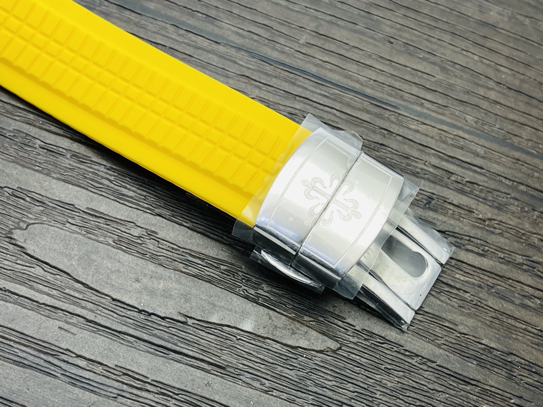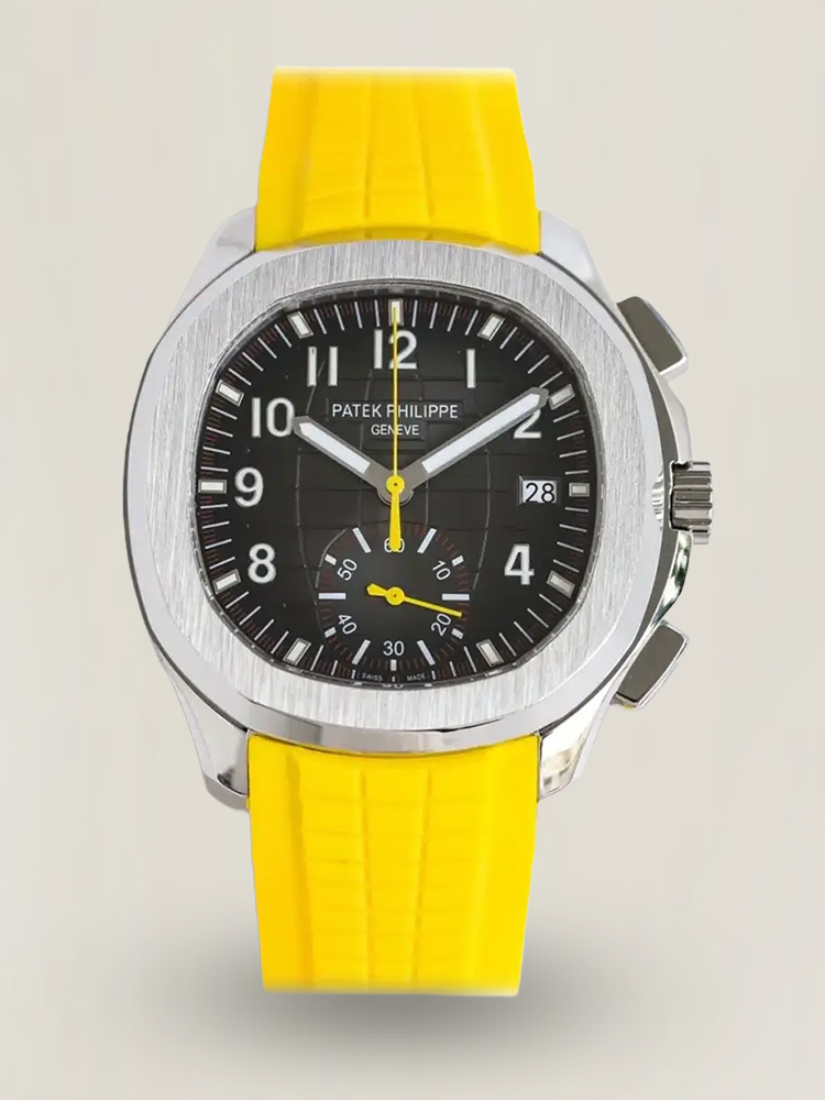 Schweizer Patek Philippe Aquanaut 5968A-001 Replica 42,2 mm Uhr mit Edelstahlgehäuse, schwarzem Zifferblatt und gelbem Gummiband