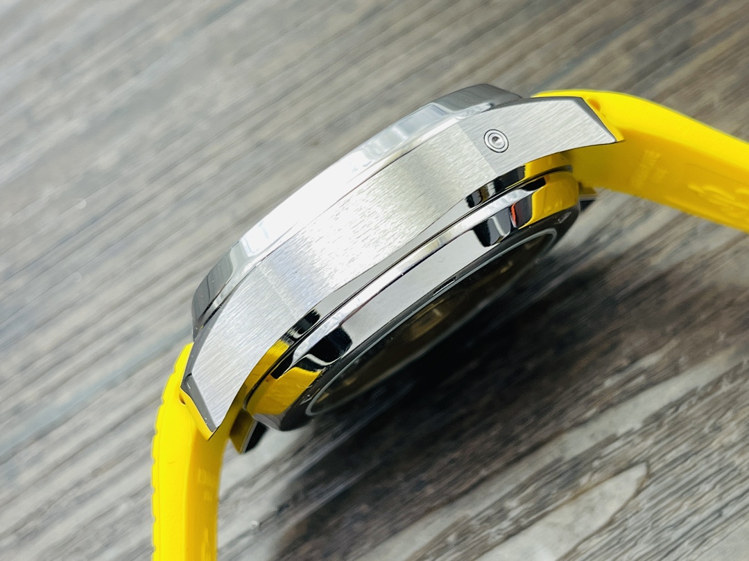 Das Gehäuse besteht aus Edelstahl. Es hat die klassische abgerundete achteckige Lünette, die sauber abgeschrägt und dann auf Hochglanz poliert wurde. Die Vorderseite des Gehäuses ist gut poliert, und die leicht erhöhten Hörner haben eine gebürstete Oberfläche, die am Handgelenk angenehm zu tragen ist. Mit einem gelben Gummiband wirkt die Uhr jung, sportlich und lebhaft.