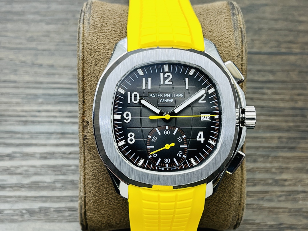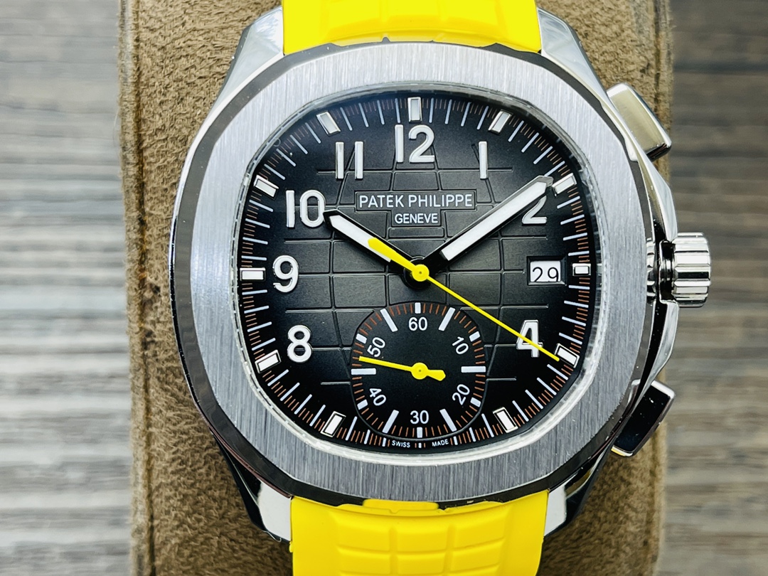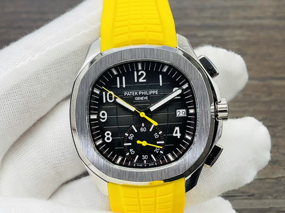 Die Patek Philippe Aquanaut 5968A-001 Replica ist wunderschön. Die Uhr hat die Maße 42,2 mm x 13 mm. Sie verfügt über ein schlichtes, aber stilvolles schwarzes Zifferblatt mit geprägtem Schachbrettmuster und klaren arabischen Ziffern für maximale Lesbarkeit. An der 6-Uhr-Position befindet sich ein 60-Minuten-Chronographen-Subzifferblatt. Dies verleiht funktionale Raffinesse sowie einen gelben Sekundenzeiger und eine äußere Skala mit Viertelsekunden-Genauigkeit.