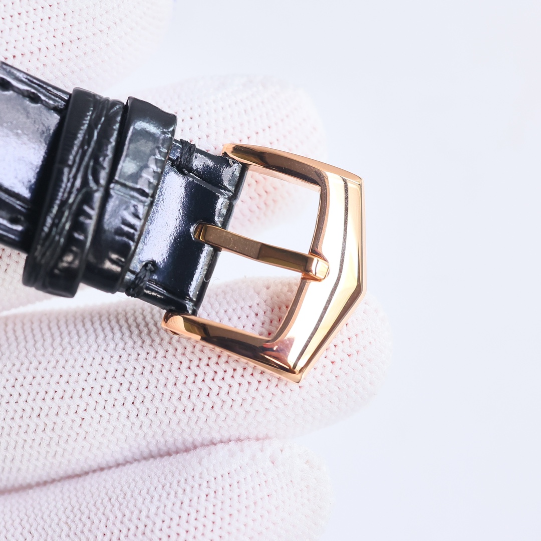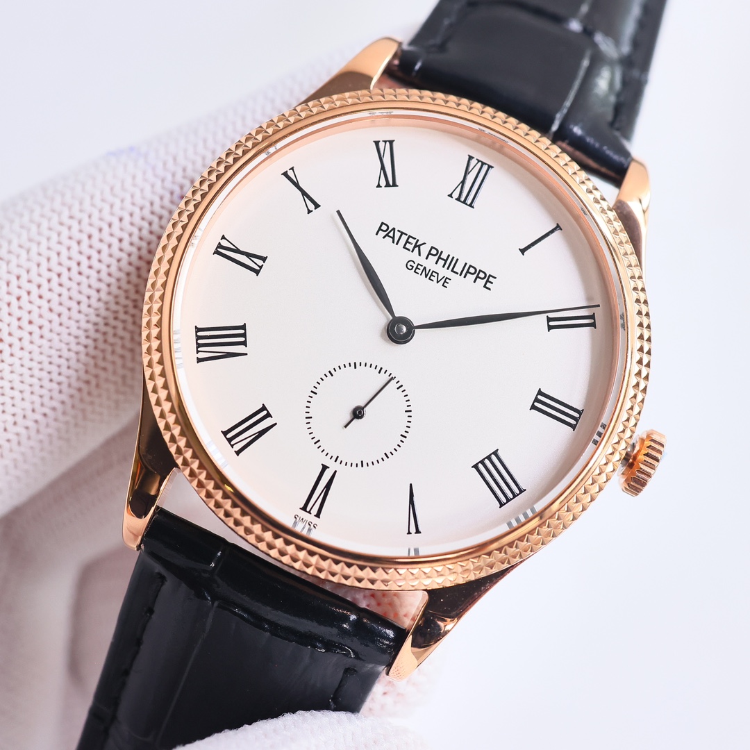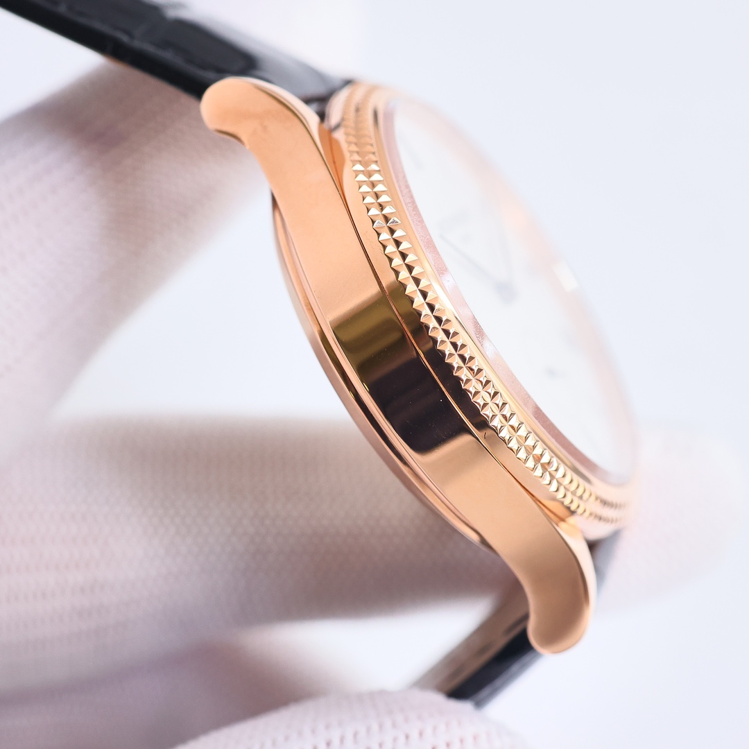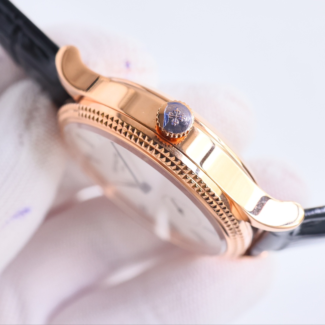Fühlen Sie die Essenz ewiger Schönheit in der Patek Philippe Calatrava 5119R/001 Replica. Die minimalistische 36-mm-Uhr mit einem eleganten weißen Zifferblatt, das römische Ziffern als Stundenanzeiger trägt, eingebettet in ein hochwertiges Gehäuse aus 18-karätigem Gold. Ein Hauch von Eleganz kommt auch vom schwarzen Armband, das sowohl zu Abendgarderobe als auch zur Freizeitkleidung passt. Angetrieben von einem Schweizer Automatikwerk sorgt sie dafür, dass sie rund um die Uhr mit jedem Schlag arbeitet. Das kratzfeste Saphirglas und eine Wasserdichtigkeit von 50 Metern garantieren, dass sie ebenso robust wie modisch ist. Die Uhr ist die ideale Kombination aus Erbe und Eleganz.