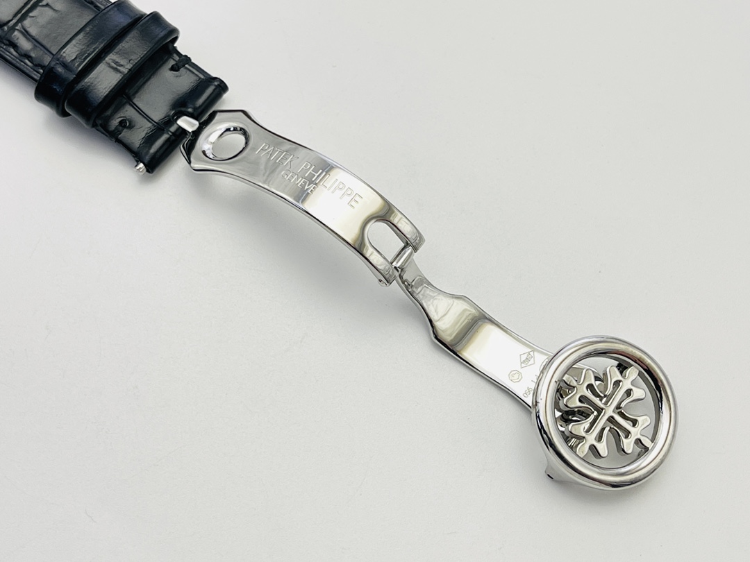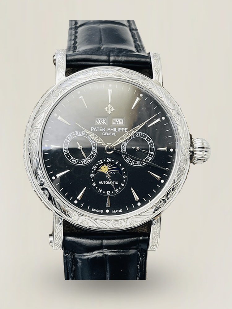 Wir präsentieren Ihnen diese Replik der Patek Philippe Grand Complications Uhr. Dies ist eine raffinierte Kombination aus Schweizer Technologie und atemberaubendem Design. Die Uhr kommt in einem 42 mm Gehäuse aus Edelstahl, mit einem ansprechenden schwarzen Zifferblatt, das aus drei praktischen Unterzifferblättern besteht. Auf der 6-Uhr-Markierung befindet sich eine elegante Mondphasenanzeige, die mit einem Datumsfenster kombiniert ist. Das Unterzifferblatt bei 12 Uhr zeigt auch den Monat und das Jahr an, um die vollständige Funktionalität des ewigen Kalenders zu gewährleisten.
