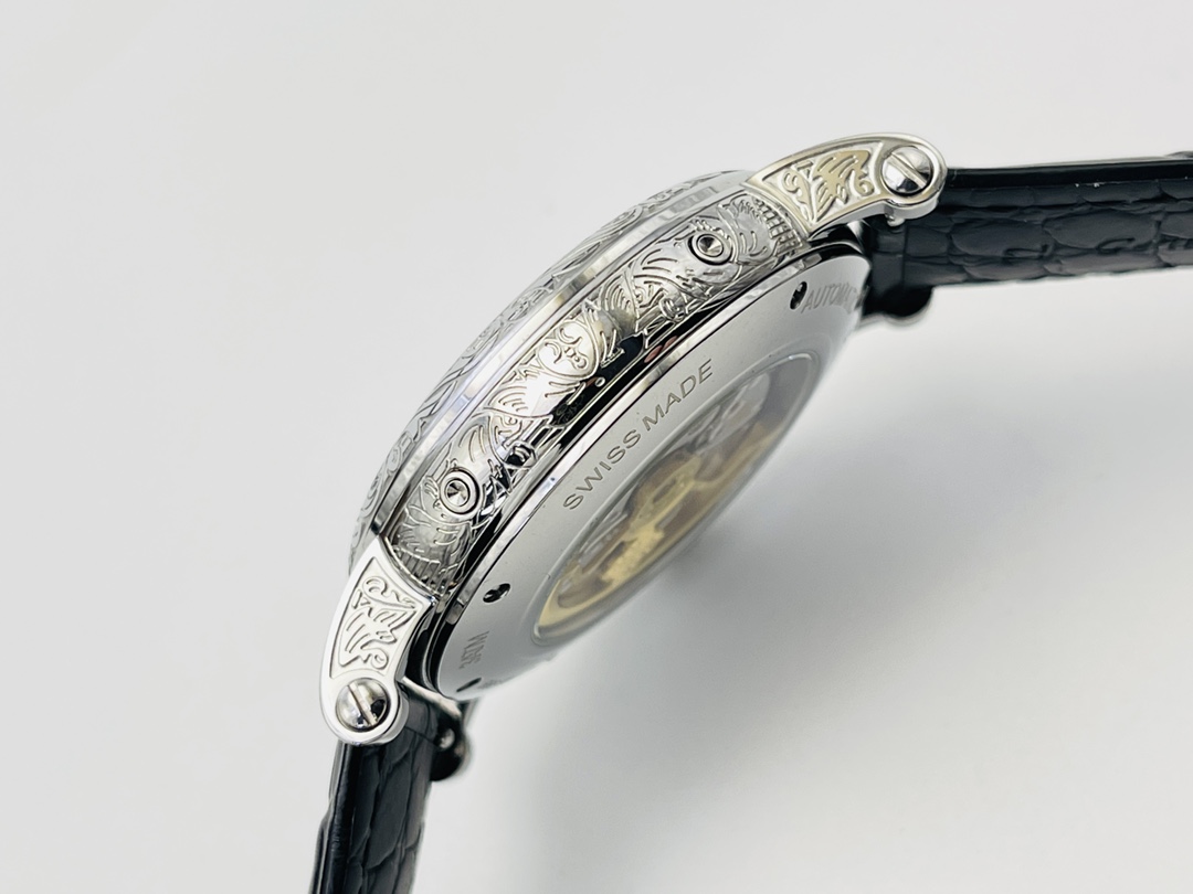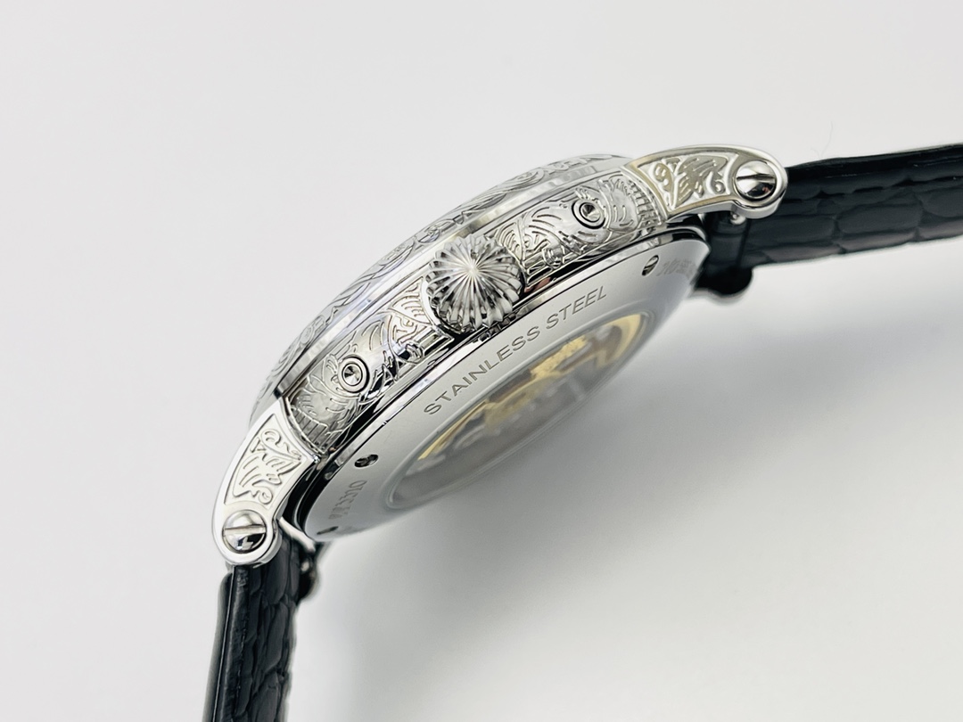Alle Stundenmarkierungen sind schlanke, konisch geformte Indizes, die präzise auf das Zentrum zeigen und dem Zifferblatt somit ein elegantes und zeitgemäßes Aussehen verleihen. Sie umfasst auch ein grob strukturiertes schwarzes Lederarmband, das ihren retro Charme ergänzt und sowohl zu formellen als auch zu informellen Anlässen getragen werden kann.