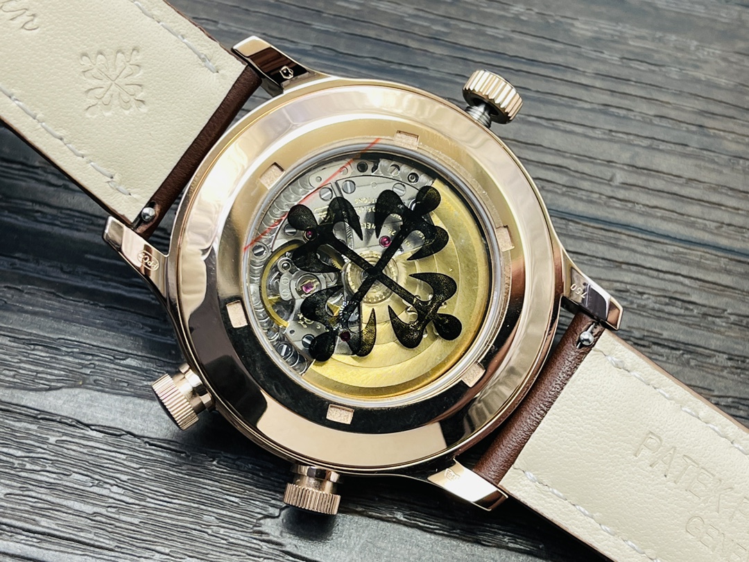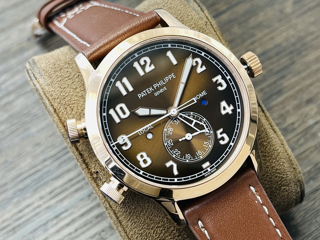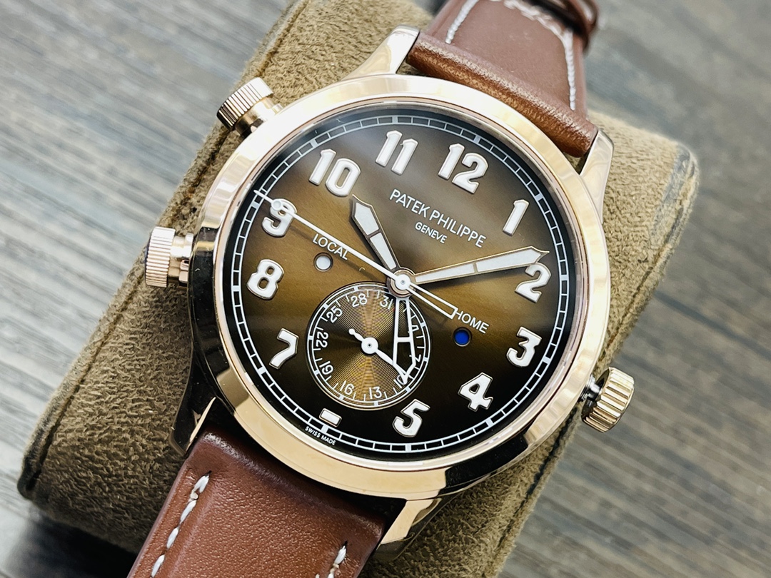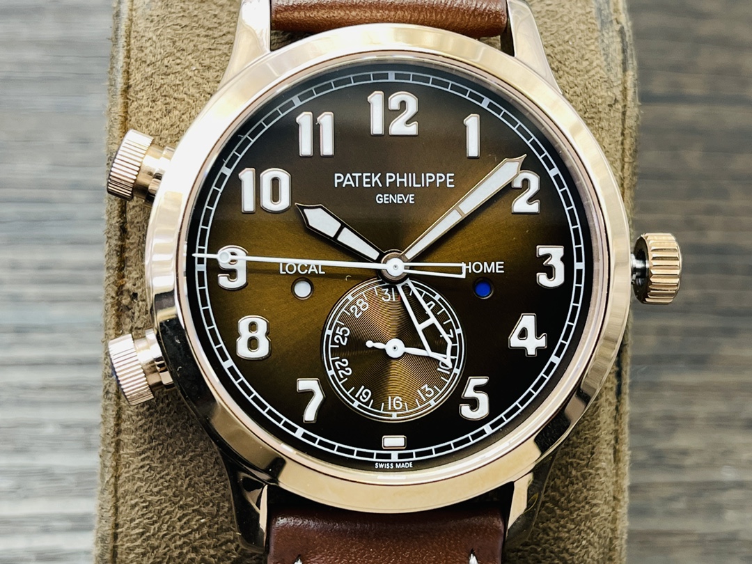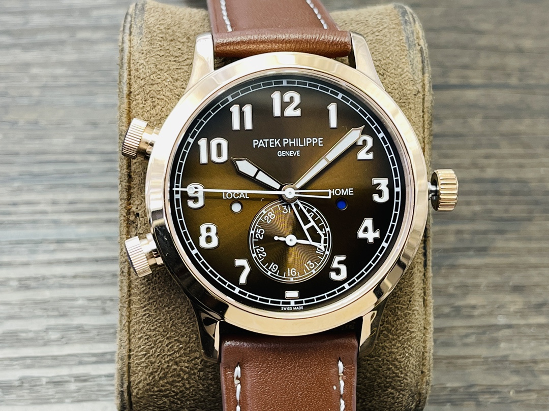 Find the Best Swiss Patek Philippe Calatrava Pilot Travel Time 5524R Replica, a Super Clone watch that accurately mimics the original's beauty and functionality. The 42mm rose gold case is polish-finished to a sleek finish, while the coffee brown and deep blue matte-textured dial improves legibility with luminescent Arabic numerals. Made for the traveler, it features a dual time zone indication in 24-hour format and date window at 6 o'clock, just as on the original. Accuracy and dependability come from the Swiss automatic movement, viewed through the sapphire crystal case back. For the vintage look to be complete, a brown leather strap with beige stitching is added, secured by an authentic-style triangular pin buckle. With 50 meters of water resistance, this AAAAA-grade replica Patek Philippe is a definition of luxury and practicality for business travel aficionados.