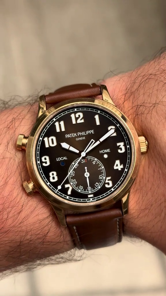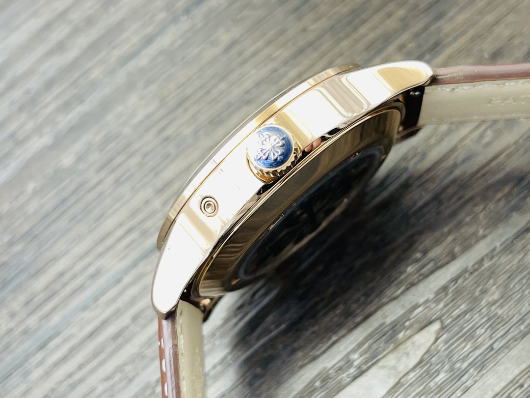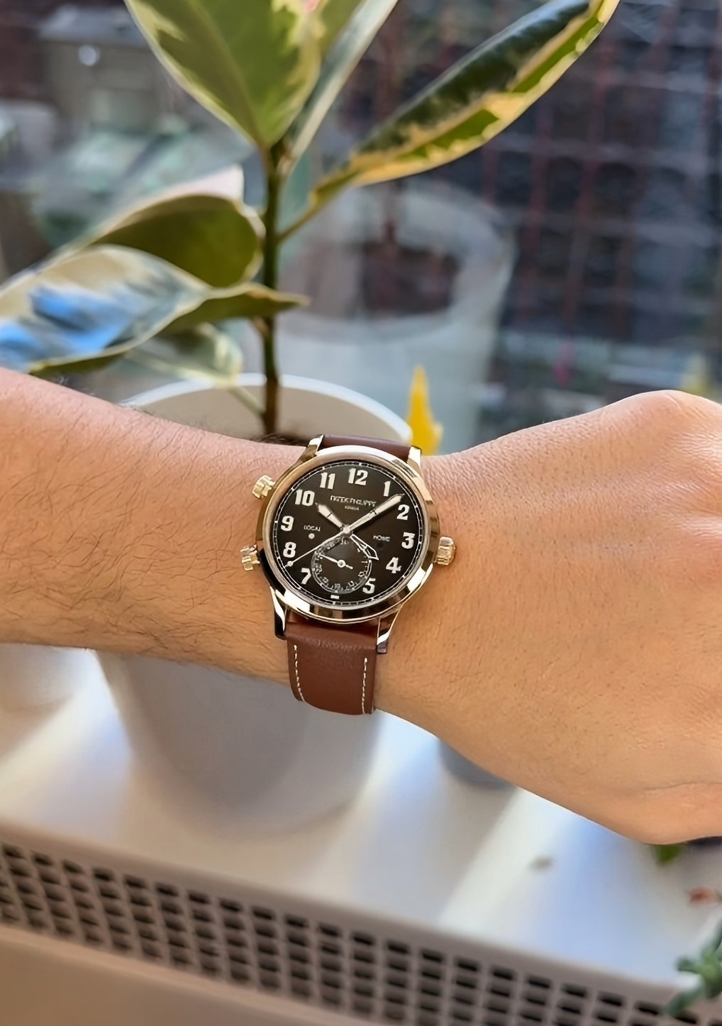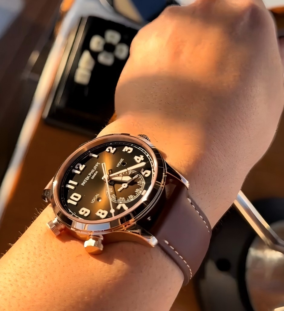 Find the Best Swiss Patek Philippe Calatrava Pilot Travel Time 5524R Replica, a Super Clone watch that accurately mimics the original's beauty and functionality. The 42mm rose gold case is polish-finished to a sleek finish, while the coffee brown and deep blue matte-textured dial improves legibility with luminescent Arabic numerals. Made for the traveler, it features a dual time zone indication in 24-hour format and date window at 6 o'clock, just as on the original. Accuracy and dependability come from the Swiss automatic movement, viewed through the sapphire crystal case back. For the vintage look to be complete, a brown leather strap with beige stitching is added, secured by an authentic-style triangular pin buckle. With 50 meters of water resistance, this AAAAA-grade replica Patek Philippe is a definition of luxury and practicality for business travel aficionados.