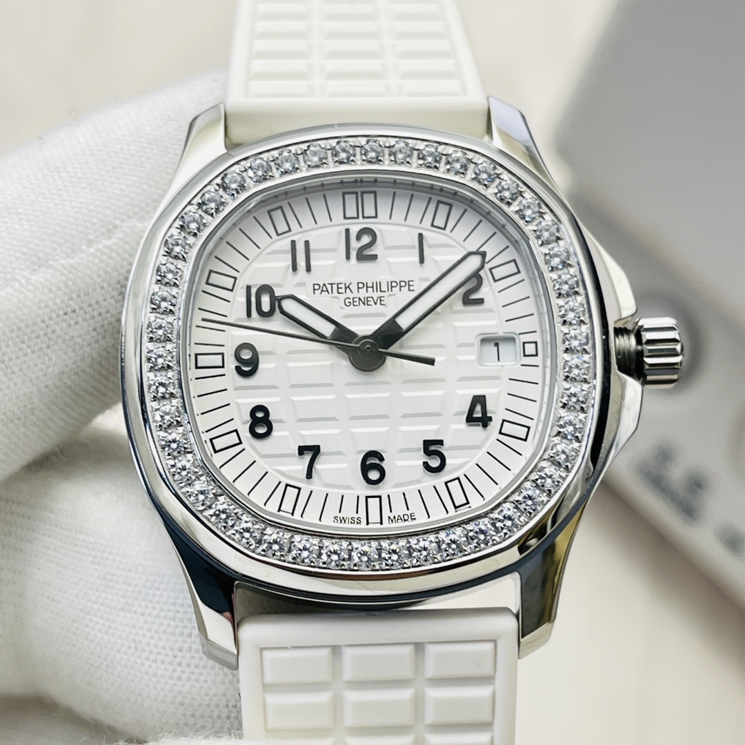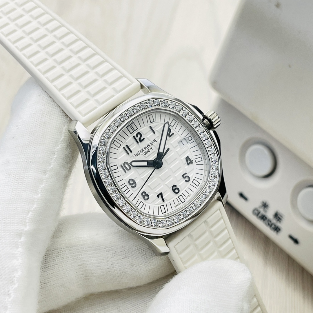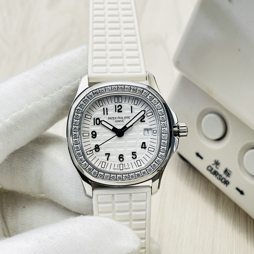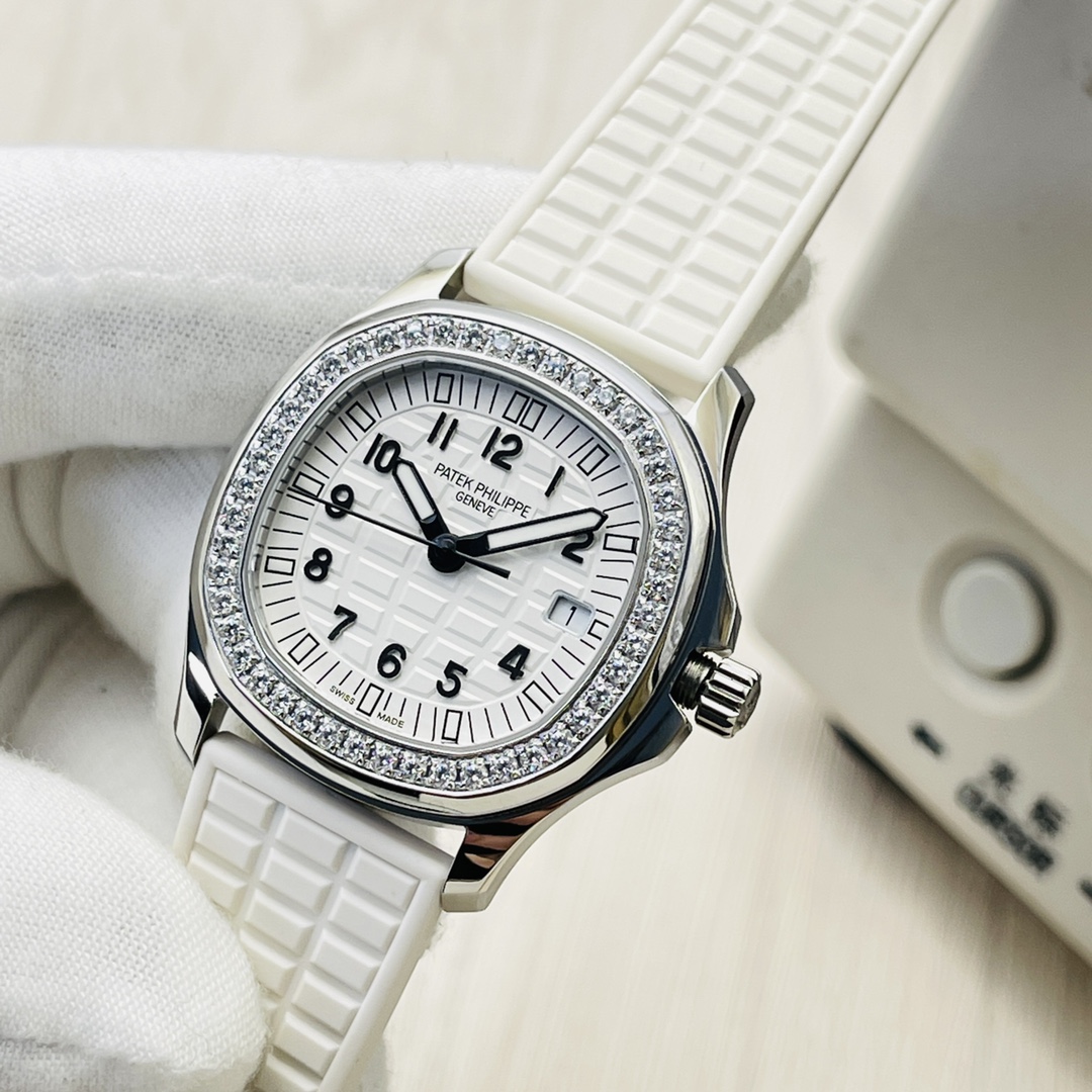 The dial comes in a clean matte pearly white finish, decorated with the signature Aquanaut pattern and completed with black gilded numerals for strong contrast and easy readability. The bezel is set with 46 premium Swarovski crystals (approx. 1 carat), while the case is decorated with an additional 88 Swarovski crystals (approx. 1.91 carats), creating a refined sparkle that looks especially impressive under natural light without being overly flashy.