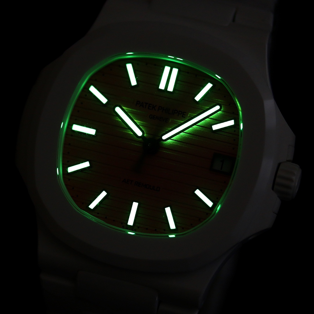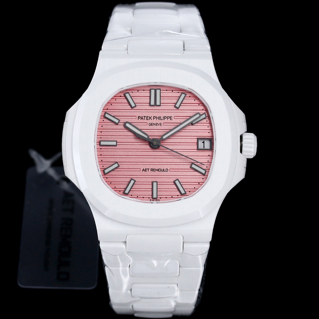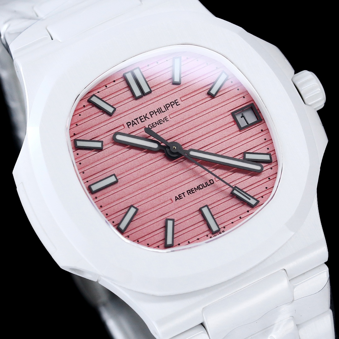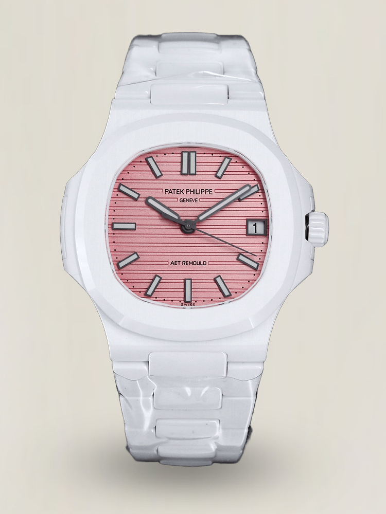 Elegant Patek Philippe Nautilus 5711 Replica Watch – Swiss Movement, White Ceramic Case, Pink Dial Luxury Timepiece