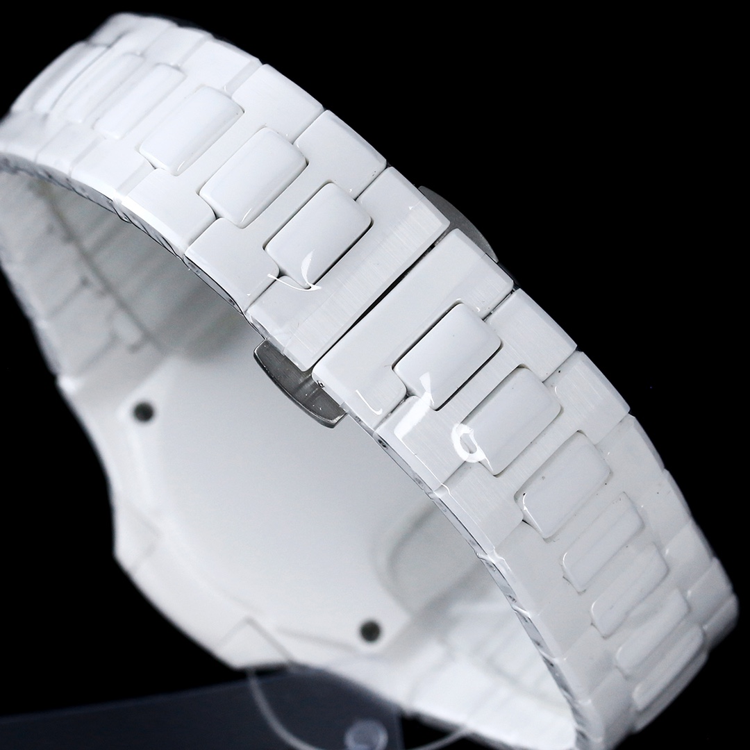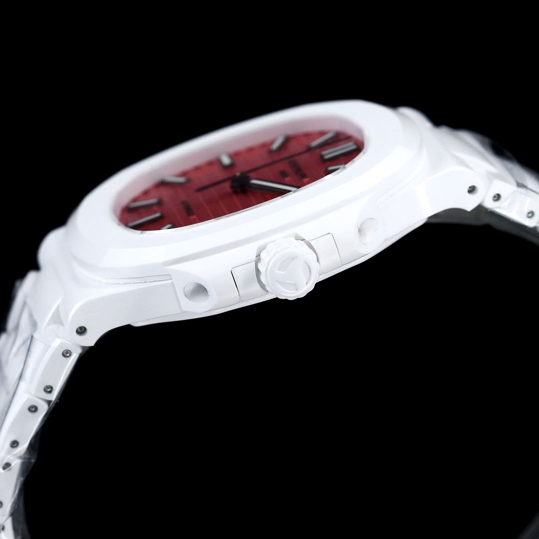 Live in luxury with the Patek Philippe Nautilus 5711 replica. It is crafted for someone with high style. The watch features a 40 mm white ceramic case. It perfectly complements the thin ceramic bracelet in a minimalist and chic design. At its heart, the radiant pink dial showcases the iconic Nautilus horizontal embossed pattern. This adds texture and personality.