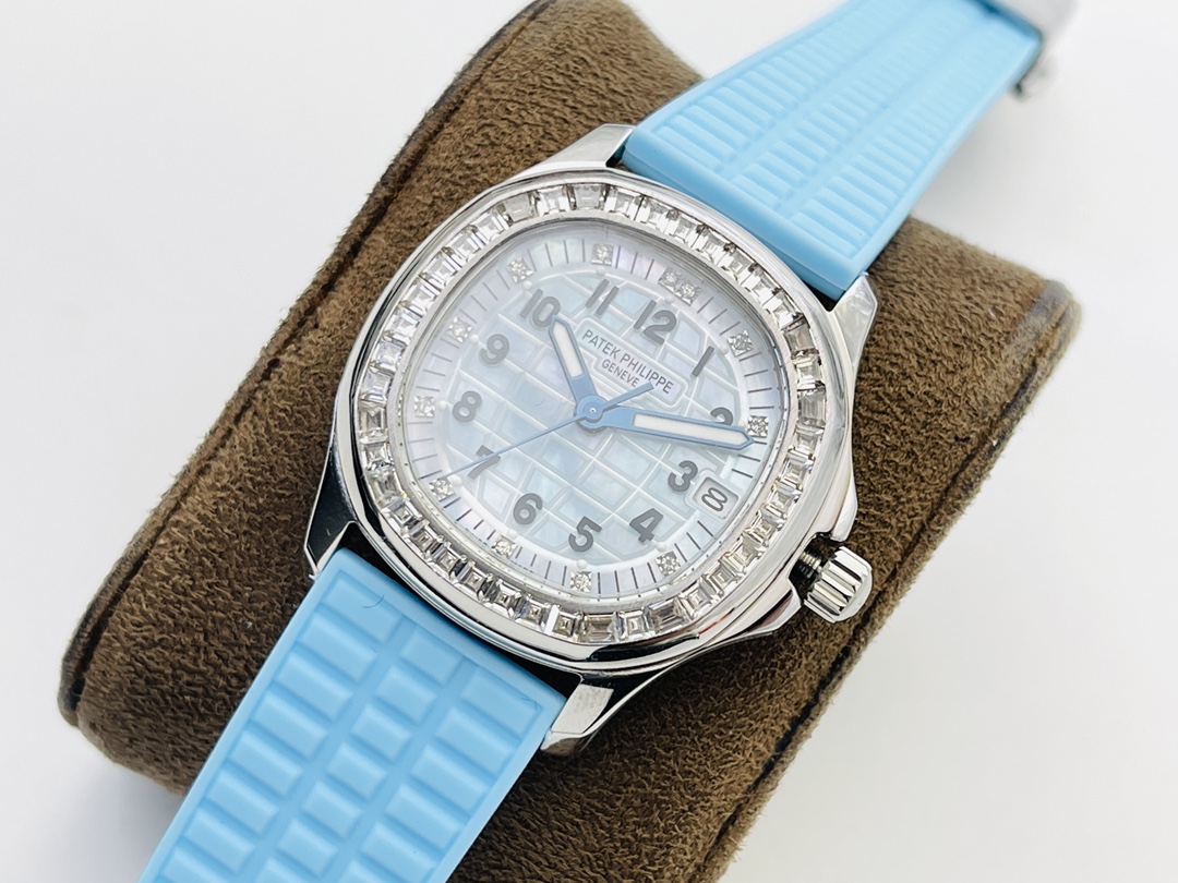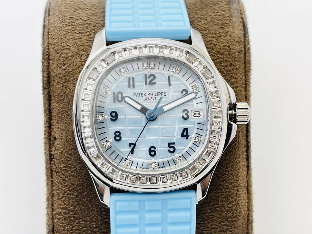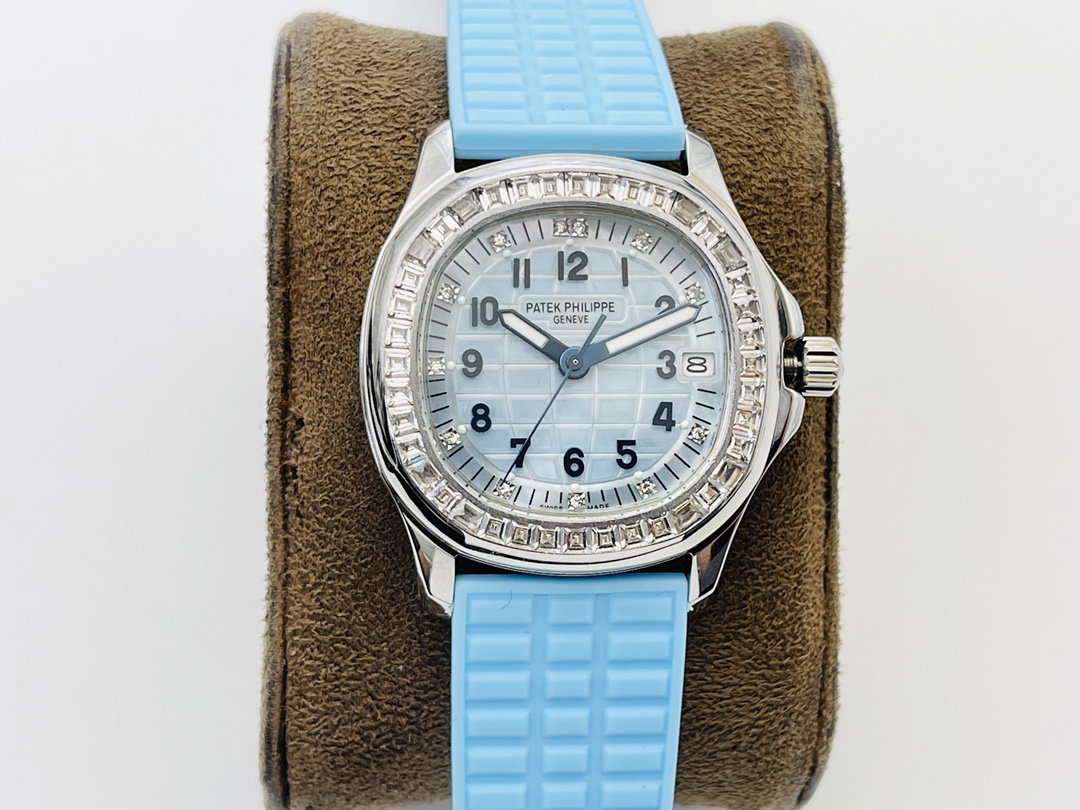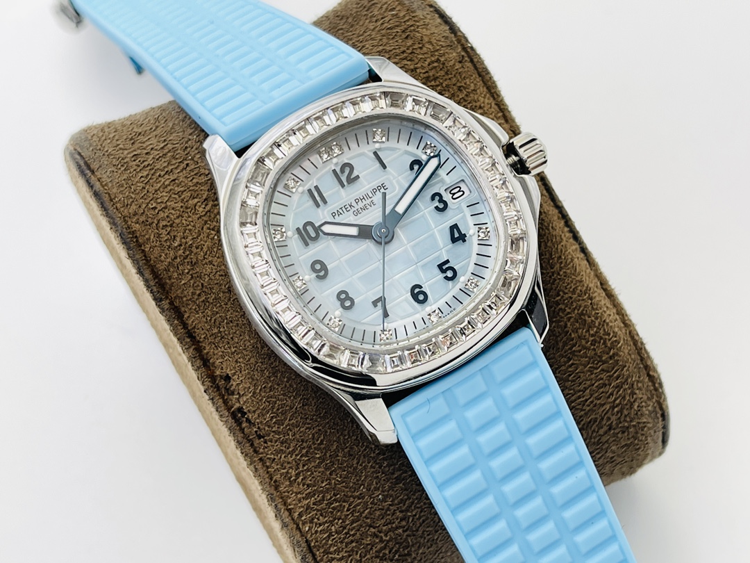 Luxury Replica Patek Philippe Aquanaut 5072G-001 35.6mm Blue Dial Diamond Bezel Watch For Elegant Women